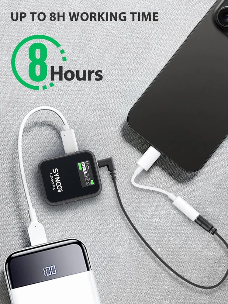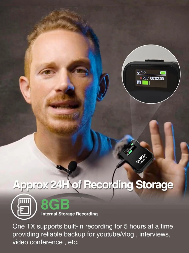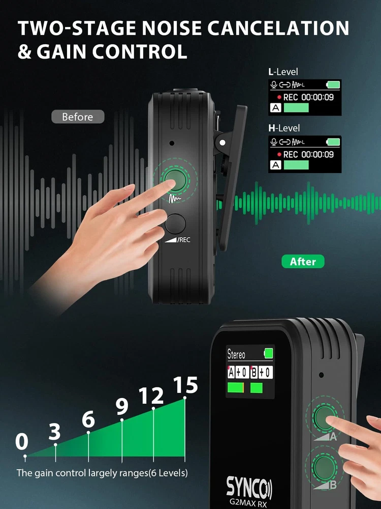 Built-in Recording, Capture Videos Worryfree: No complicated operations are required, transmitter & receiver pair automatically when powered on, and then you can start recording. G2(A2) MAX wireless lavalier microphone includes memory in its two transmitters for keeping a copy of the recording in case the wireless connection is bad or other circumstances lead to a decrease in audio recording quality. Long press the internal storage recording button on TX for 3 seconds to turn on or off the internal storage recording function. Greatly improves sound security when taking a video or interview Dual-Channel System & Mono/Stereo/Safety Mode: G2(A2)MAX lav mic is capable of handling 2 transmitters and 1 receiver simultaneously, and features the ability to switch between Mono, Stereo or Safety outputs mode, easy for post processing, ideal for live streaming, face-to-face interviews, online class, Youtube/Vlog/Tik Tok video and other two-person shoots.Especially the newly upgraded safe mode can effectively prevent the whistling sound Noise Reduction & Gain Control: G2(A2) MAX could minimize or eliminate unwanted background noise or interference for clear and high-fidelity sound output by One-Touch Noise Cancellation. In addition, the gain control of this streaming microphone largely ranges 0-6 Level allow simple and effective optimization of signal levels, ensure lav mic captures a strong enough signal without being too quiet or too loud Universal Mic with 656 ft/200 m Stable Transmission: Boasting secure 2.4GHz digital transmission and Syncoder Tech, G2(A2) MAX wireless microphones avoids the confusing domain of UHF and allows up to 656 ft/200 m (LOS) transmission range. Integrated with new upgraded G2 series DSP chip, 3.5 mm TRRS/TRS cable included, G2(A2)MAX wireless mic delivers clear crystal and distortion-free sound for your DLSR camera, iphone, android,pc, or tablet Clearer TFT Display Screens: Newly adopted bright, high-contrast TFT display screen for wireless lav mic's transmitters and receiver, it shows current recording mode, battery status and audio level, gain and more intuitively under environment of different lights One-Button Muting & Real-Time Monitoring: The switch is designed to mute your wireless mic for a short pause in teamwork or device setup rather than turn on/off the system repeatedly. The receiver has a 3.5 mm headphone jack for monitoring recording status during shooting in real time. Simultaneously monitor audio sources from the device and transmitter