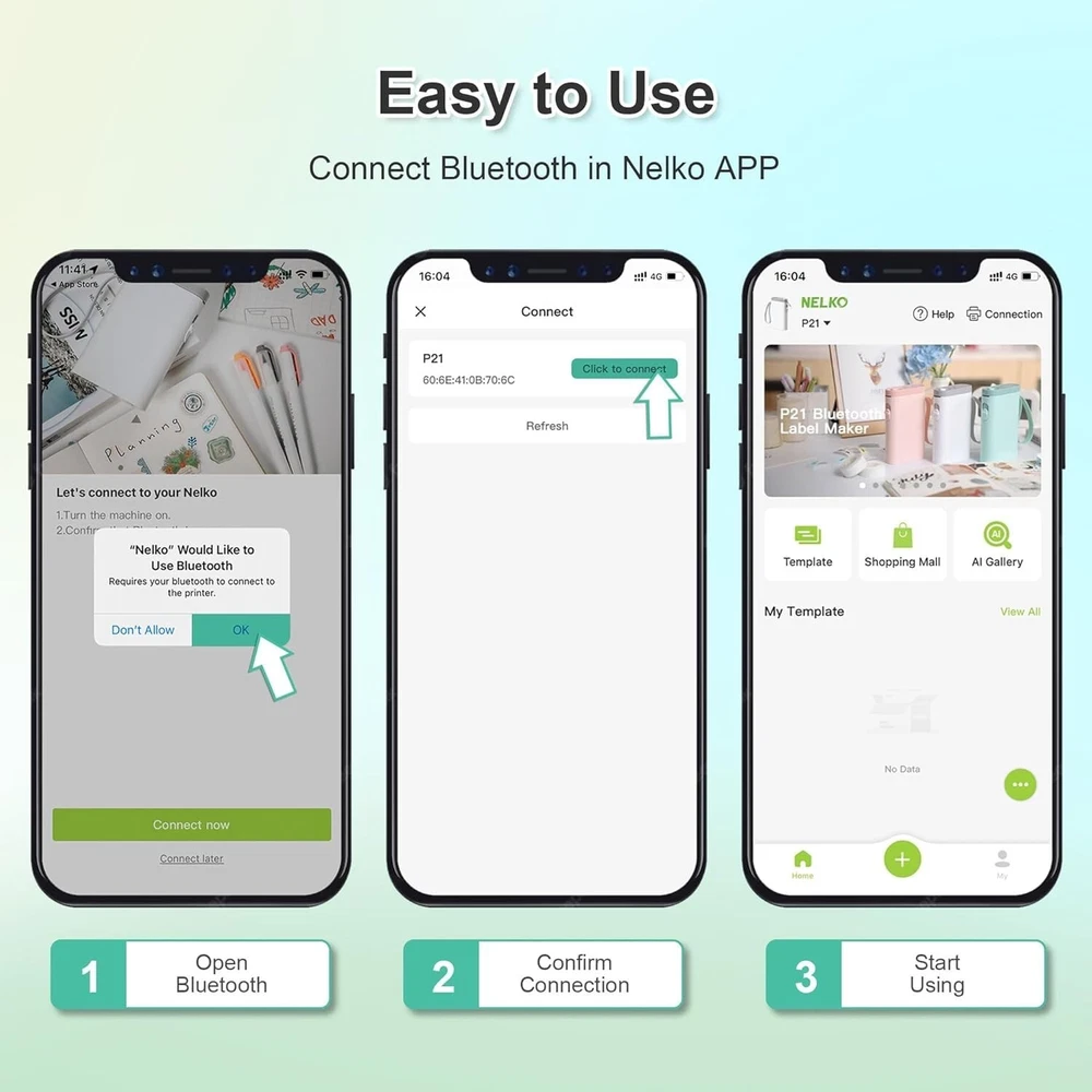 Brand Nelko Connectivity Technology Bluetooth Printing Technology Thermal Special Feature Portable, Clear Printing, Easy to Use, Rechargeable, Wireless, Inkless, Thanksgiving and Christmas Gifts, Text, QR code, Barcode, Materials, Images, Time and Borders Portable, Clear Printing, Easy to Use, Rechargeable, Wireless, Inkless, Thanksgiving and Christmas Gifts, Text, QR code, Barcode, Materials, Images, Time and Borders Color White Model Name P21 Printer Output Monochrome Max Printspeed Monochrome 30 Item Weight 0.62 Pounds Product Dimensions 6.65"D x 4.5"W x 1.9"H About this item 2024 New Version: Compared with the traditional label makers, half weight and size of the traditional label maker, smaller, smarter and convenient for users to carry. Wireless bluetooth label maker can slip into your pocket, allow printing anytime, anywhere. We recommend using our NELKO thermal label paper for good printing quality. Attention: For P21 Nelko APP iOS Users, Nelko iOS V2.7.0 printing multiple copies abnormal, please update Nelko APP to the latest version V2.7.1 High-quality Printing: Label Makers with BPA-Free Direct Thermal Technology. Equipped with high-speed chips and 203 DPI, you can enjoy high-definition without relying on ink or toner. Label maker built in durable rechargeable battery, it can work for a long time. This label maker is monochrome printout, which only prints black text. We can create color label and need to use color pattern label tapes for printing.(Note: Not including charging adapter, not suitable for fast charging adapter) Easy to Use: NELKO label printer compatible with IOS & Android Phone via bluetooth connection. Step 1: Download "Nelko" APP from Google Play or App Store. Step 2: Install the paper roll. Step 3: Connect the P21 bluetooth within APP. Step 4: Choose a quick template and start printing. It is not compatible with Google phones on Android 14. This label maker machine with tape APP included more than 90 +Fonts, 10+ Languages, 450+ Materials. (Note: This label maker doesn't work with computers) Multiple Creative Function&Templates: This app of the label maker provides various features and templates, easy to create various design label stickers from App with Text, QR code, Barcode, Materials, Images, Time and Borders, etc. The length of labels is fixed, including 14X40mm, 14x50mm, 14x75mm, and more. Please do not tear or destruct the green sticker on the back of the label strip , otherwise it will affect the printing effect. (Note: Continuous label tapes are not supported). Design Your Own Labels: The label maker machine with tape is widely used in life and office. For Home, organizing your clothes, food storage, cosmetics items, and mailings. For Office, office organization includes notebook tags, price tags, reminder tags, and other office supplies. For School, label maker for classroom teacher and kids school items, personal item identification, name tags. For holidays, it is a great choice for Thanksgiving and Christmas gifts Product information Technical Details Controller Type iOS, Android Printer Media Size Maximum 14X75mm Included Components 1 X User Manual, 1 X P21 label maker, 1 X Type C charging cord, 1 X Guide Card, 1 X Roll of white label paper Print media Labels Scanner Type Portable Max Input Sheet Capacity 1 Compatible Devices Smartphones, iPhone, IOS & Android Sheet Size 15X30mm,12X40mm,14x40mm, 14X50mm,14x75mm Dual-sided printing Yes Duplex Automatic Hardware Interface Bluetooth Resolution 203 x 203 DPI Additional Printer functions All In One Control Method Remote Output sheet capacity 1 Processor Count 1 Specific Uses For Product Small Business Price, School and Office Files Classification, Home Supplies Organization, Personal Item Identification, Name Tags and Jewelry Tags Memory Storage Capacity 8 MB Manufacturer Nelko Item Weight 9.9 ounces Product Dimensions 6.65 x 4.5 x 1.9 inches Item model number P21 Batteries 1 A batteries required. (included) Number of Items 1 Size P21 Manufacturer Part Number P21