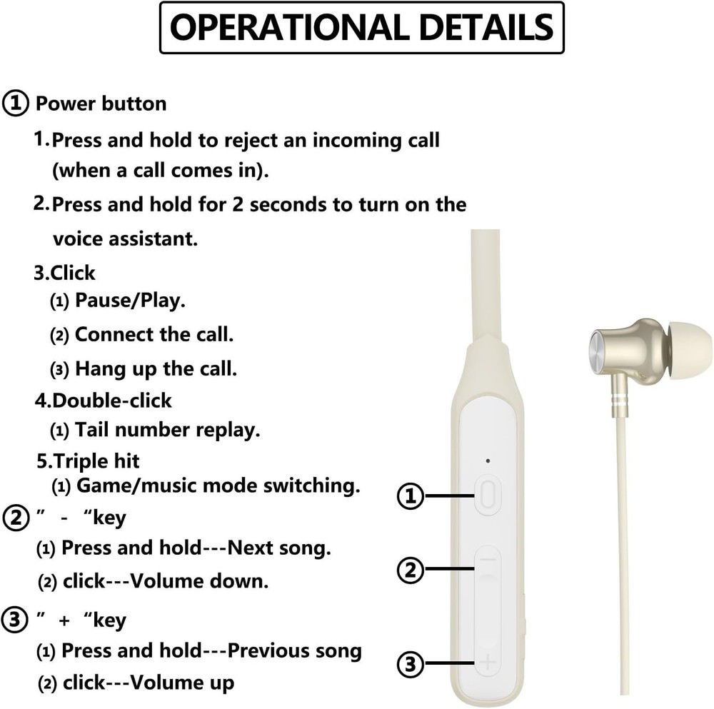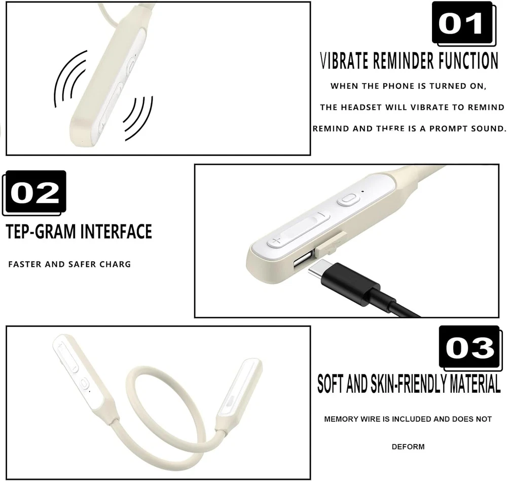 Neckband Earbuds,V5.2 with Microphone, 35 Hours Playtime, in-Ear Skin Product Details Noise Control: Active Noise Cancellation Model Name: Y6H Connectivity Technology: Wireless Wireless Communication Technology: Bluetooth Included Components: User Manual Age Range (Description): Adult Material: TRE material Specific Uses For Product: Sport Charging Time: 2 Hours Recommended Uses For Product: Exercising Compatible Devices: Smartphones, Tablets, Computers Control Type: Media Control Cable Feature: Without Cable Water Resistance Level: Waterproof Package Type: Box Style: Modern Control Method: Touch Number of Items: 1 Battery Life: 35 Hours Bluetooth Version: 5.2 Earpiece Shape: Rounded tips Manufacturer: LANDIBO Package Dimensions: 7.09 x 5.55 x 0.75 inches Item Weight: 2.39 ounces Item model number: Y6H-000 Batteries: 1 Lithium Ion batteries required. (included) Brand: LANDIBO Color: Skin Ear Placement: In Ear Form Factor: In Ear Impedance: 16 Ohm Bluetooth headset upgraded Hall switch: The innovative use of Hall switch, breaking through the traditional key switch mode, through the induction of magnet flux to control the power on/off, magnetic separation (power on), magnetic fit (power off). Bringing you an intelligent experience.(No Power Button Required) 35 hours of play time: this one neckband headphones It is your ultimate companion for outdoor sports. Equipped with a high-capacity battery and a low-power chip, it gives you 35 hours of continuous listening on a 2-hour charge, and it also provides more than 20 days of standby time, ensuring you have a reliable audio companion for outdoor sports and fitness activities on the go. Adopt the new Bluetooth 5.2 technology: 5.2 chip neck headphones It brings faster transmission speed and more stable connection, smooth transmission without lag, low power consumption, wide compatibility, and provides incredible layering and shock, surging bass, balanced midrange, and treble penetration. You can enjoy the layering and power of panoramic stereo sound for immersive sound reproduction. IPX7 Waterproof Comfortable Fit: neck earphones bluetooth wireless With a comfortable in-ear design, they are lightweight and ergonomic to fit snugly in your ear, so they fit perfectly in the ear canal and provide a good seal that doesn't hurt to wear for long periods of time. With the IPX7 nanometer coating, you don't need to worry about sweat or rain damaging your wireless headphones, making them perfect for long listening sessions and everyday use. Call Noise Cancelling Portable: wireless neckband earbuds Use a noise-cancelling microphone that automatically recognizes voices and noises to pick up your voice precisely to ensure excellent call clarity. Enhance the experience of the calling feature. neck headphones wireless Bluetooth Featuring a highly elastic memory neckband, TRE material, soft and portable, bendable and foldable for storage, very suitable for running, jogging, cycling, fitness, fitness, etc.