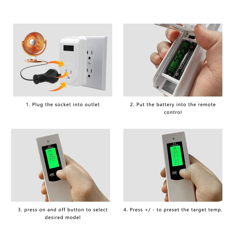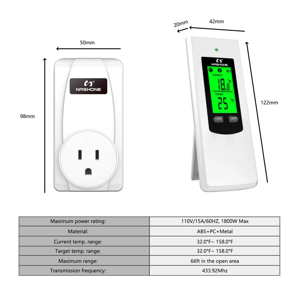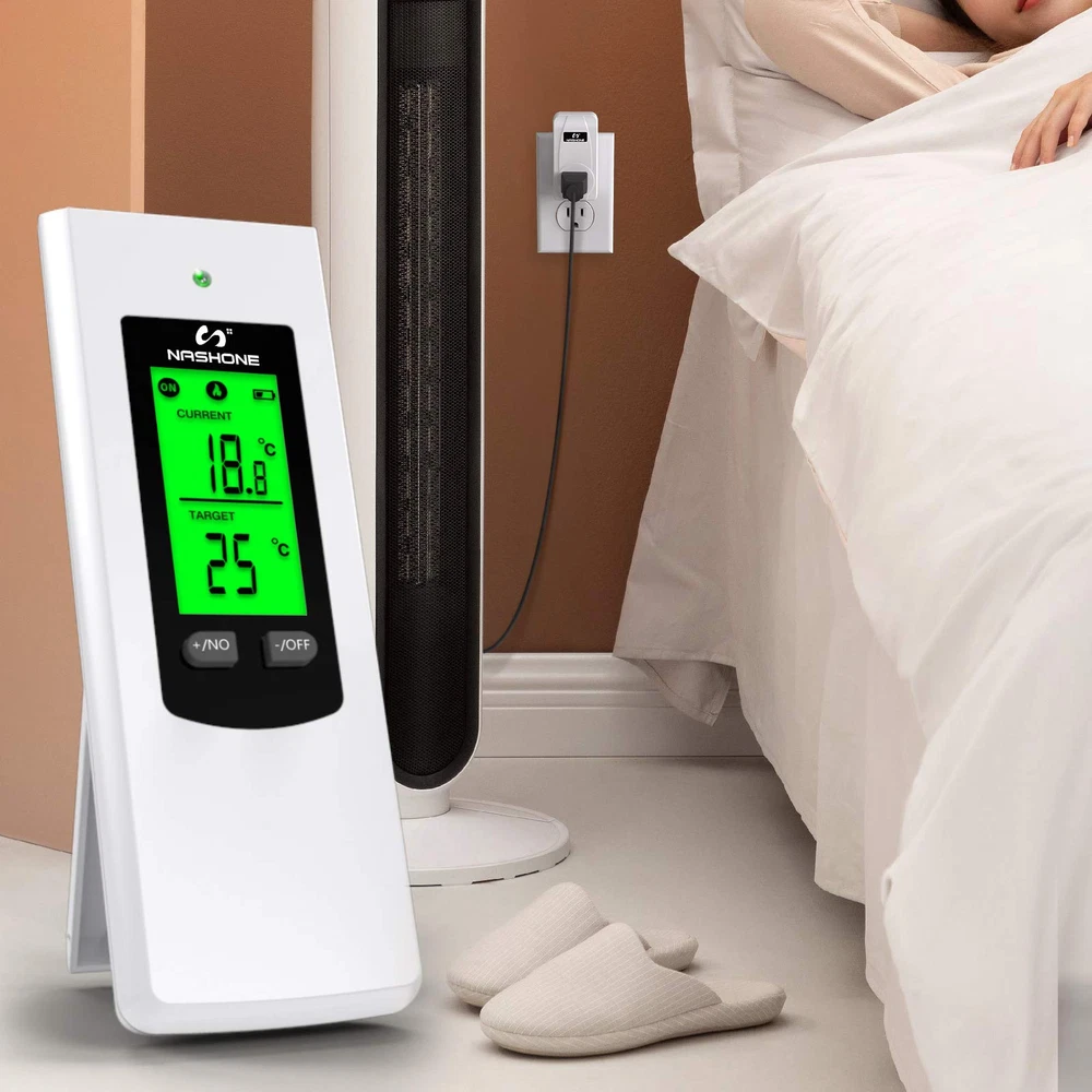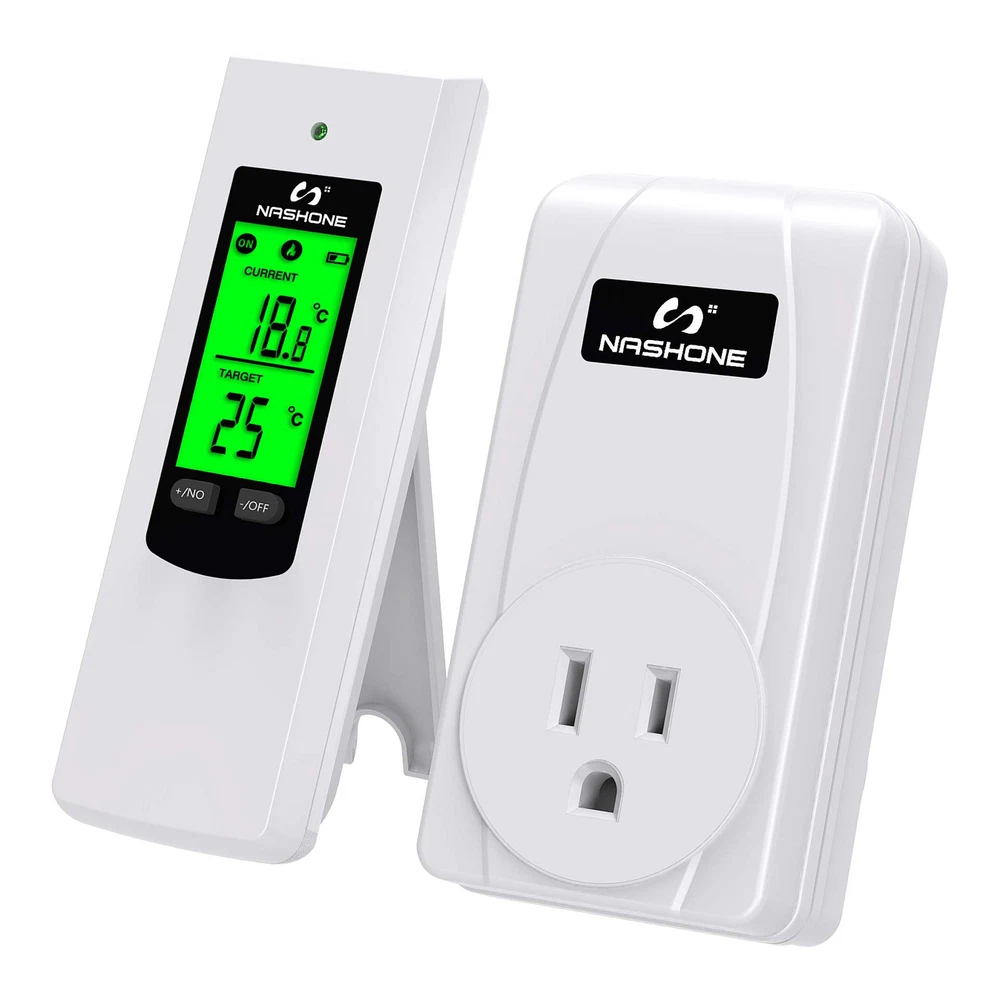 【Temperature Sensor】 Ambient temperature is detected automatically by the high-precision temperature sensor on the receiver socket. When current temperature reach to preset temperature, the thermostat plug stop heating or cooling, so you can place it where you want to measure the temperature to stay comfortable. 【Wireless Remote Control】 Remote setup and control, portable design for more convenient and handy. The control distance of the wireless thermostat reaches 66ft in the open area, allowing you to control heating or cooling equipment more flexibility. 【Easy to Use】 No installation or wiring needed, just plug and play, plug your portable heating or cooling unit into the thermostat outlet, and you're ready to go. Comes with LCD display, supports reading in Celsius or Fahrenheit units. 【Multiple Safety Production】 The casing of the plug-in thermostat is made of flame retardant PC material, 3-Prong socket with grounded terminal, max load current up to 15A, over high and low-temperature and sensor failure alarms make it safe and reliable. 【Wide Applications】 The smart outlet thermostat is widely used for space heater, portable heater, wall panel heater, oil-filled radiator, electric fireplace heater, evaporative cooler, swamp cooler, attic fan, window air conditioner, etc.