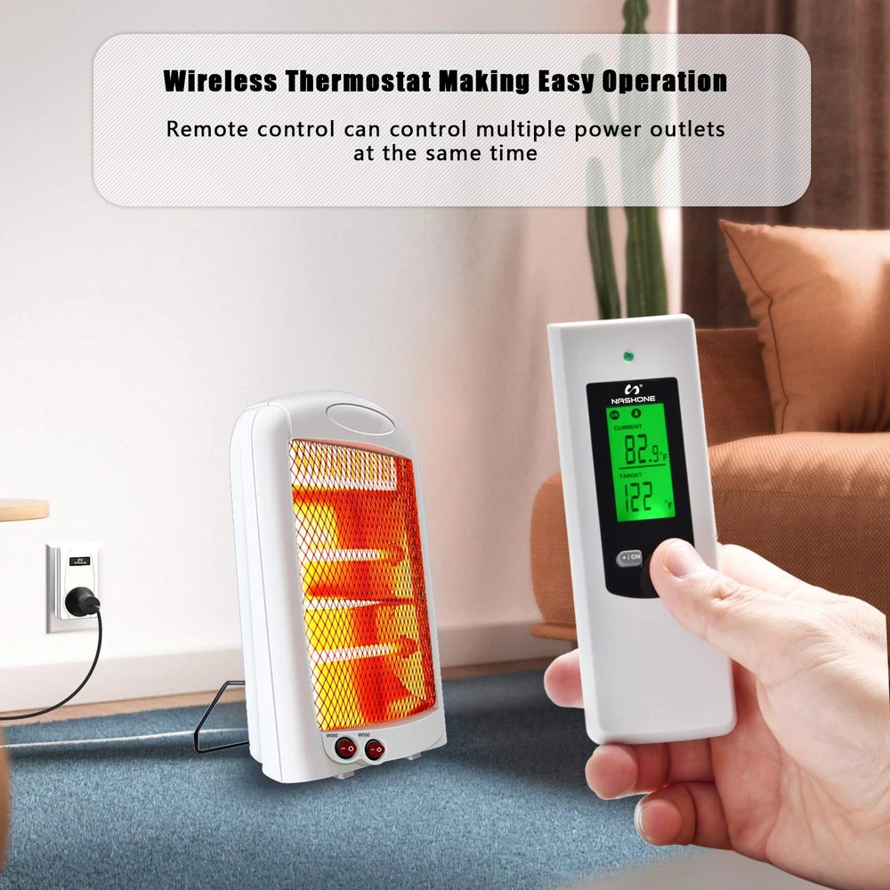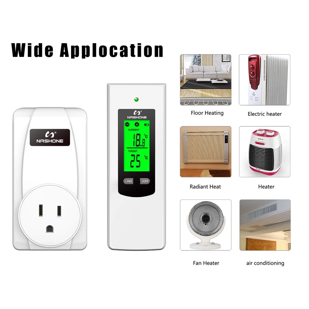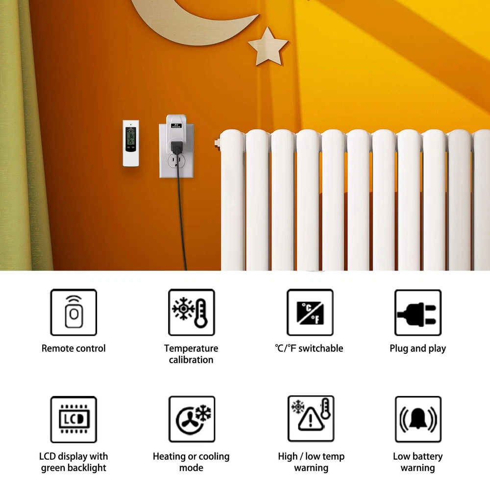 【Temperature Sensor】 Ambient temperature is detected automatically by the high-precision temperature sensor on the receiver socket. When current temperature reach to preset temperature, the thermostat plug stop heating or cooling, so you can place it where you want to measure the temperature to stay comfortable. 【Wireless Remote Control】 Remote setup and control, portable design for more convenient and handy. The control distance of the wireless thermostat reaches 66ft in the open area, allowing you to control heating or cooling equipment more flexibility. 【Easy to Use】 No installation or wiring needed, just plug and play, plug your portable heating or cooling unit into the thermostat outlet, and you're ready to go. Comes with LCD display, supports reading in Celsius or Fahrenheit units. 【Multiple Safety Production】 The casing of the plug-in thermostat is made of flame retardant PC material, 3-Prong socket with grounded terminal, max load current up to 15A, over high and low-temperature and sensor failure alarms make it safe and reliable. 【Wide Applications】 The smart outlet thermostat is widely used for space heater, portable heater, wall panel heater, oil-filled radiator, electric fireplace heater, evaporative cooler, swamp cooler, attic fan, window air conditioner, etc.