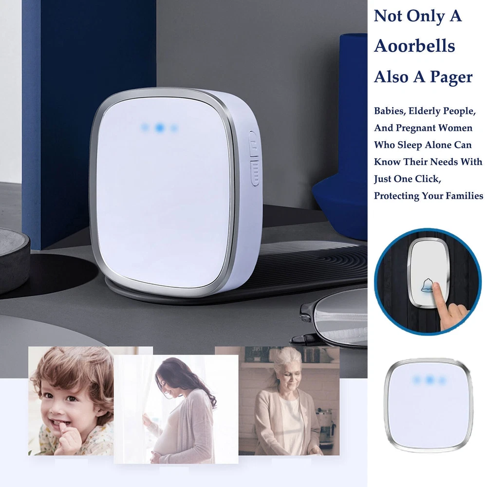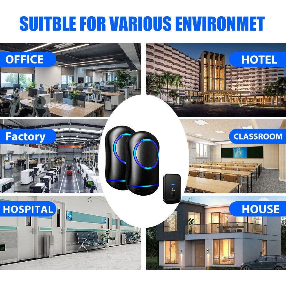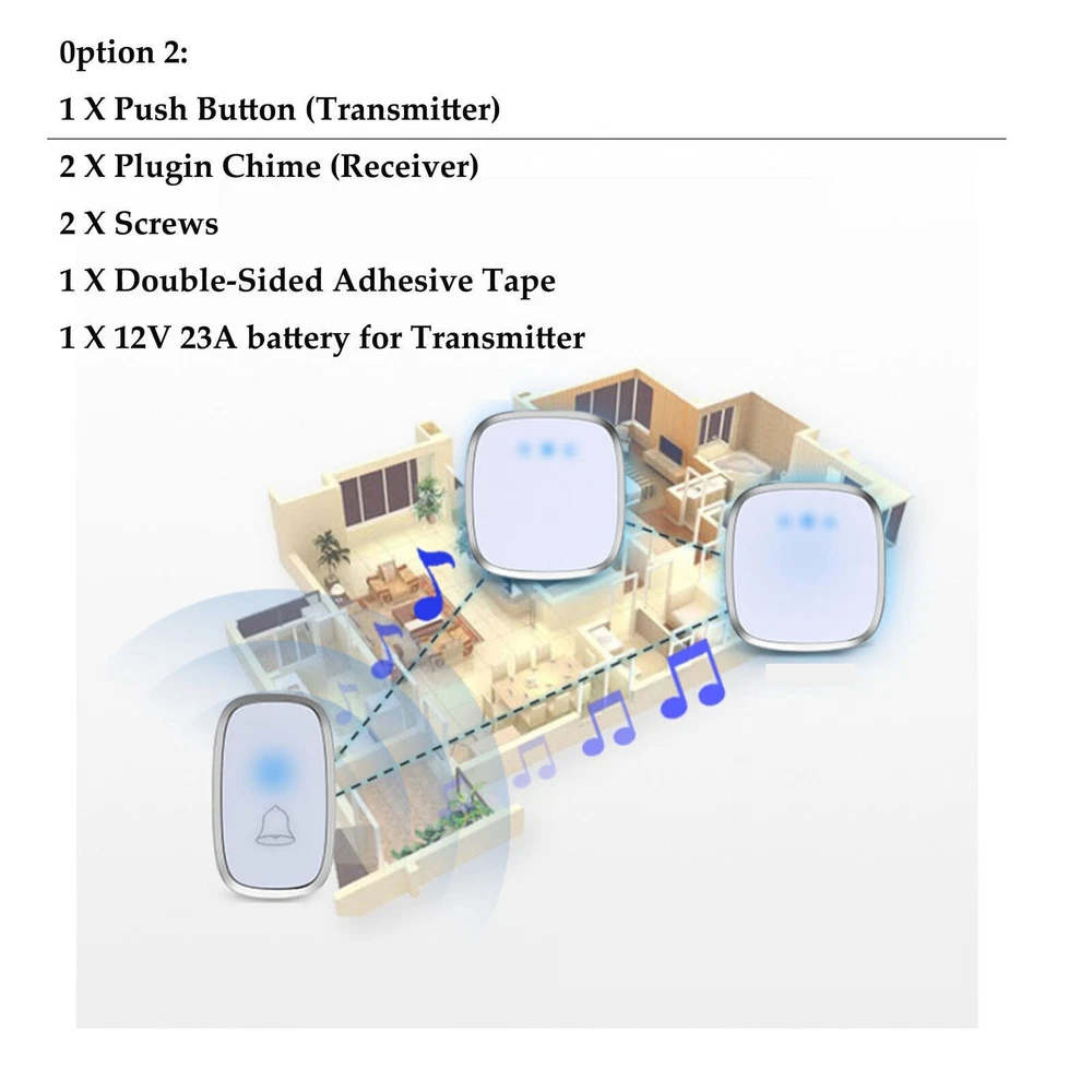 #A 1/2x Receivers+1x Transmitter Features: 【Personalize】:All receivers will ring no matter which push button is pressed, but each door has a different tone, so you know where your guests are. If you want the push button and receiver to work one-to-one, please try the steps in "How to clear the frequency and re-pair". 【Longer Range】:Up to 1000 Feet (300m) in the open air from the transmitter (150m if there are walls). Either you are occupied in the bedroom or at the kitchen, our wireless doorbell kit can remind you that someone is calling from outside. Never worry about missing visitors. 【60 Melodies & 5 Levels Volume & LED Flash】:The wireless doorbell offers a wide selection of 60 tunes for your choice. 5-level of volume range from 0dB to 110dB, silent mode with just LED flash is available when you don't want to be disturbed. 【IP44 waterproof】:The doorbell push button is rated IP44 and weatherproof for outdoor use,the doorbell chime is suitable for any home, townhouse, apartment, office, school, hospital, hotel or other application. Our wireless doorbell is certified by CE, RoHs, FCC. 【Expandable and Easy Installation】:Expand your existing doorbell system with up to 8 transmitters and unlimited receivers. Simply plug the main doorbell chime into a wall outlet, install the push button with provided double sided tape or screws. Specification: Maximum 1000ft operating range in open area 38 unique ringtones 3 volume levels LED indicators Volume range: 25 to 80dB Dimension: Receiver: 2.56 x 3.74 x 0.94 inch; Transmitter: 2.01 x 2.95 x 0.79 inch; Package Includes: 1-2x Receivers(please choose the qty you need) 1x Transmitter Tapes / Screws / Stickers #B 1/2x Receivers+1x Transmitter Feature: 300m/1000ft Operating Range With this wireless doorbell operating range up to 300m/1000ft, no matter where you are, you will never miss the visitor. You can smartly add up to 20 same plug-in doorbell receivers and doorbell battery-operated transmitters. Blue LED Indicator When pressing the wireless doorbell battery-operated transmitter, the blue indicator light on the wireless doorbell with 1/2 receivers will flash to remind you of the visitor's arrival. At the same time, the indicator light on the transmitter will remind visitors that the doorbell's receiver has sounded. IP44 Dustproof & Waterproof IP44 doorbell transmitter with a special dustproof & waterproof structure could work between -4 °F to 159 °F, can withstand extreme weather conditions. Enjoy the freedom to install it indoors, outdoor door frames, or in your garden. Innovative Memory Function With a smart storage function, this doorbell's wireless cordless plug-in receiver can remember your last tune and volume even if a power outage, no need to set it again every time. 10 Years Press Life After smart testing, the doorbell plug-in wireless transmitter can be pressed 100,000 times. It needs to be pressed 25 times a day for normal household use and 91250 times a year, so it can be used for 10 years. Easy to Install 1. Adhesive Patch Mounting: Use the included double-sided adhesive to stick the doorbell wireless cordless button on the wall. 2. Screw Mounting: There is a screw groove on the back cover of the doorbell battery-operated button, you can use the attached screws to fix it on the wall. Widely Use The plug-in door chime and cordless doorbell button are very popular because of their easy-to-install and set up function. You could install it anywhere inside, house, garden, garage, office, etc. Warm Tips: 1. Please tear off the battery insulation film before use. 2. Do not stick the doorbell wireless transmitter on the metal door frame or metal object. Pacakge Includes: Option 1: 1*Transmitter (includes 1*23A,12V battery) 2*Receiver Option 2 : 1*Transmitter (includes 1*23A, 12V battery) 1*Receiver #C 1/2x Receivers+1x Transmitter Feature: Classic Wireless Doorbell - Stylish modern design, artful with simplicity, elegant and unique. Excellent materials keeps itself from getting higher temperature & interference. Waterproof & Dustproof, remote transmitter button is rated IP44 weatherproof. Works between -4 °F to 140 °F; withstands various harsh weather conditions, acceptable for outdoor use. Long Operating Range - Operating range up to 1,000ft/300m in open area ensures you to hear the bell and answer the door in time. Either you are occupied a few rooms away or on another floor, in the garden or kitchen, you will always be easily informed when someone is calling from outside, nsures you will never miss a visitor. 36 Melodies & Adjustable Volume - The wireless doorbell offers a wide selection of 36 chimes for your personal taste, you can have a Christmas doorbell during the christmas season, for example, and more. 4-level of volume range from 25dB to 110dB to meet your needs for different occasions. Flashing light with audio alert indicators which is easy for people including the hearing impaired to notice. Easy Installation & Using - Screws and double-sided adhesive tapes included for easy be fixed to the doorframe of the transmitter. Easily plug receiver into an electrical outlet (no batteries required for main receiver). Install just plug it in location you need it to be heard, then you put the button where you want someone to push the button. Remembers your last melody and volume level after a power outage; no need to reset to your previous settings. Multi Use - It is fit for home, apartment, classroom, office, villas and more. You can use our doorbells to train dogs, using it to quiet down classrooms, when you ring the bell, the students will know it’s time to move on to the next group, the kids are loving it also. And it can be a paging device for the elderly, can signal for care when they need it most. Specifications: Plugs into Any Standard Wall Outlet. Flashing Light Indicator. Wireless Range: 1000ft maximum in the open air Internal Sounds: 36 Chimes Volume: 4 level adjustable levels (25db to 85db) Receiver Powe