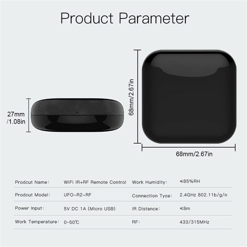 SAFE & SECURE SHOPPING 100% SATISFACTION GUARANTEED FAST SHIPPING Store Categories Store Categories Other Game Acc (Arcade and others) Watch Acc (Movement and Tools) DJI Acc and Other RC Parts Earphone Acc Home&Garden Health&Beauty Music Instruments & Parts Consumer Electronics Auto Parts Toys Office Supplies Business & Industrial Pet Supplies Sporting Goods Military Model Others You may also like You may also like EVA Storage Bag Protective Pouch Case for Sony PSP1000/2000/3000 Game Console 13.07 USD 100* New Self-Adhesive anti collision Rubber Feet Small Round Bumpers 8mm 3.99 USD 3.99 USD 20PCS Soft Plastic Golf Shoe Spikes Replacement Cleat Fast Twist For Adida Champ 12.99 USD 2.4-2.48GHz RC Car Boat Remote Control Receiver Transmitter 4CH LED Indicator 9.89 USD 3.99 USD RC Car Brushed ESC 60A Waterproof Electronic Speed Controller For 1/10 RC 19.07 USD Protector Gimbal Camera Cover Transparent Cap For DJI Mavic Pro Drone Quadcopter 5.99 USD 3.99 USD Wireless RF-R1 IR Remote Controller With Power Cable Appliance Control Universal Product Description Features: 100% Brand New and High Quality! Newest version with RF and IR highly compatible:All-in-one IR and RF remote control devotes to activating Air conditioners, TVs, fans, DVDs, STBs, TV BOXes etc Infraed devices and even RF appliances as RF light,RF switch, RF roller blinds etc with one single remote control;storage of thousands of IR codes.(Support IR 38KHZ and RF 433/315MHz) Multiple remote control RF protocol ensures a better user experience for controlling different 433MHz RF devices as curtain\shades motor,light switch;Local IR code for faster response. WiFi/4G App Remote Control from Anywhere:Equipped with MOES new smart controller,you may control IR and RF devices with free mobile "Smart Life/Tuya" App anytime from anywhere(Compatible with for Android & for iOS).Control your appliances in advance when you are away from home.Turn your smart phone into a universal remote in an easier way. Hands-free Voice Control: for Alexa,set A/C to 77 degrees Fahrenheit. A simple voice command can activate the controller to remotely control most Infrared and RF Control Devices,such as A/C, FAN ,TV, DVD, STB, TV BOX and RF protocol devices.(Furthermore compatible brands or devices ,please check attached list or Smart Life App.) Customized DIY Copy Function: If you can not find device brand in "smarlife"App, Programable DIY learning function may help to copy same function from original remote. Most IR and RF remote control Devices will be applicable such as fireplaces, heater, ceiling fans. Specifications: Power Input: DC 5V/1A(Micro usb2.0) Model: RF-R1 Stand-by Power: ≤0.4W Controlling Distance: Horizontal direction ≤8m, Opposite Direction ≤15m(Finally effect by environment) IR control direction: Multiple Way Operating Temperature: -10℃~50℃ Operating humidity: ≤85%RH Connection type: 2.4GHz 802.11b/g/n Carrier: 38KHZ APP SUPPORT: for Android 4.0/for iOS 8.0 above Wireless Frequency: 2.4GHz RF:433/315MHz Dimension: 7*7*4.8mm/0.27*0.27*0.18in Package Includes: 1* Universal IR remote control 1* power cable Shipping Payment Returns Contact Us Shipping 1. Items sent from US warehouse. 2.Receiving time = Processing time + Shipping time. 3. Processing Time: Around 1-2 business Days. 4. Shipping Time: 3-5 business day. it may have a little delay during some holiday (such as Christmas),any problem ,please feel free to contact. Payment We accept all verified payment from eBay. Returns 1. 30 days warranty from the purchased date. Please contact us via email before returning the defective item. 2.Our warranty does not extended to any product that are physically damaged or that are not under normal operating conditions as result of misuse or improper installation on the buyer/user's part. 3.Return items should include the original packaging and all accessories. buyers MUST contact us for the returning address. 4.In all cases, buyers pay shipping fees at their own cost to return products for exchange or refund. We will be responsible for the postage of replacements. Refund will be made upon receipt of the returned item. Contact Us Pls contact us if you have any problems,we will try our best to solve for you. Copyright © 2022 Tongtool