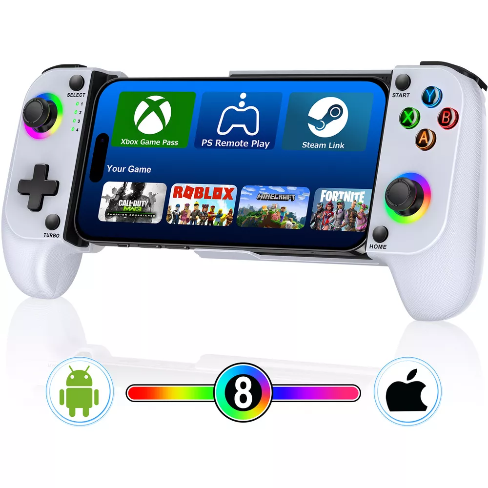 White Black 【PLAY ANY CONTROLLER SUPPORTED APP GAMES】 The wireless phone controller is designed to enjoy unstoppable gaming experience, work for iPhone/Android, support nearly all cloud gaming services including Xbox Game Pass, Playstation Remote Play, Steam Link, GeForce NOW, MFi Apple Arcade & hundreds of popular mobile games like Call of Duty, Roblox, Minecraft, etc. The mobile controller perfects your mobile gaming experience beyond a console by making it happen anywhere, anytime, to anyone! 【WIRELESS IPHONE GAME CONTROLLER WITH RGB & NO DEAD ZONE】 Only hold on 'B+HOME', you can connect controller for iphone with phone via Bluetooth. The phone game controller have Rainbow and 6 single color LED modes, you can switch LED colors or modes to build your own exclusive gaming ambiance! The Hall effect joystick provide ultra precise control, No drift, No deadzone! It helps you gain dominant position of games faster and the performance and game experience has been improved qualitatively! 【ADJUSTABLE TURBO & 8H PLAYING TIME】 The iOS/android controller has adjustable TURBO function (5/12/20 shots/s), free your fingers and make you easier to win in action game. Dual vibration motors enhance the game immersion, provide you realistic and stimulated gaming experience! Built-in rechargeable 600mAh high capacity battery provides over 8 hours game playing, and it can be fully charged within 2-3 hours. Never worry about game interruptions, enjoy your gaming time! 【STRETCHABLE DESIGN & CASE FRIENDLY】 The scalability of iphone controller for gaming allows you to install a 10-17.5cm phone, don't have to remove your phone case every time. Non slip rubber provides a secure fit that won’t come loose while gaming. And the grip with texture provides better comfort and a delicate feel, allowing you to play games for a long time without feeling tired! 【WHAT YOU GET & CUSTOMER SERVICE】 1X Phone Controller for iPhone/Android; 1X USB C Charging Cable; 1X User Manual for Phone Controller for Android. We are dedicated to providing customers with the best products and services. Matching the 'Shanwan Controller APP', collecting a large number of games and gaming platforms, and support for online upgrade of the controller.