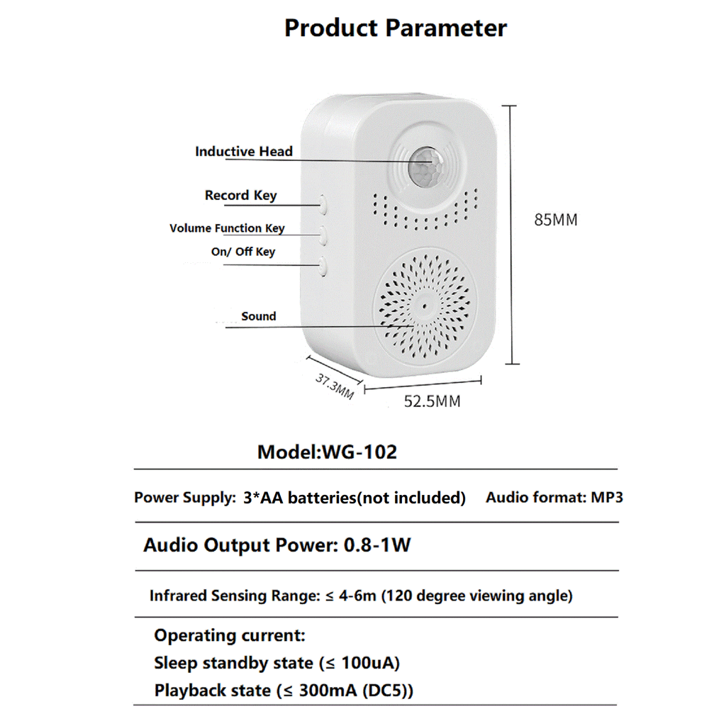 NEW-00023 Recordable Welcome Infrared Chime Doorbell Wireless Adjustable Volume Door Bell PRODUCT DESCRIPTION Welcome Infrared Chime Doorbell Wireless Adjustable Volume Door bell with Recording function Specifications: Color: White Size: 85*52.5*37.3mm Power: 3*AA batteries (not included) Material: ABS plastic Volume: 3 volumes adjustable Operating current: Sleep standby state (≤100uA) and Playback state (≤300mA) Features: Sensor: Sensor , no wiring is required. Convenient: Detect movement you will know anyone entering your setting area. Household Supplies: sensor convenience. Applications: Door suitable for home, business shops, stores, hotels, factories, doorway entrance place requiring either guest saluting function. Automatic.Automatic induction broadcasting,induction distance 4~6 meters. How to record: Long press the recording button to record,you can record what you want to say. Package Includes: 1x Doll Bell(Not included 3* AA Batteries) 1x Sticker Shipping Contact Us Our products have been sent to the US warehouse. All items will be shipped via WINIT CORPORATION. In 2-5 working days, you will receive your items. Thank you and have a nice day. If you have any question about us or items, please contact us, we will reply it as soon as possible. Shipping Our products have been sent to the US warehouse. All items will be shipped via WINIT CORPORATION. In 2-5 working days, you will receive your items. Thank you and have a nice day. Contact Us If you have any question about us or items, please contact us, we will reply it as soon as possible. PaymentShippingReturn policyAbout usContact us Copyright © - Tongtool All rights reserved | Design:Tongtool