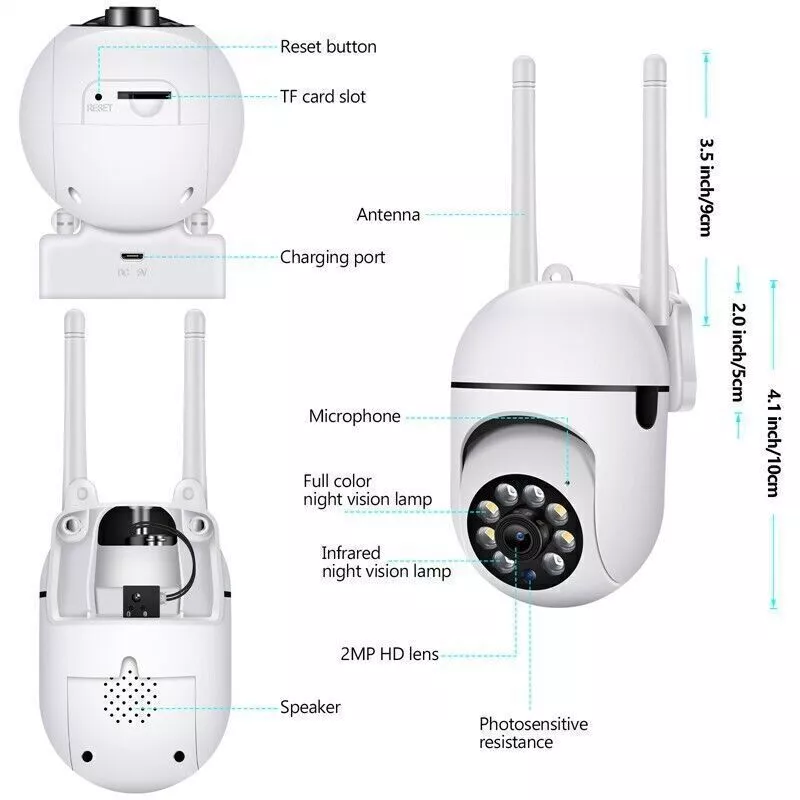 Features: 1.WiFi Camera. 2.IR+full color Night Vision. 3.Support app alarm, Alarm video. 4.Support share permission to view histiory,Messages,PTZ control,Voice intercom to your friend or familly member. Specification: Smart Home Protocol: Infrared, Wi-Fi Surveillance Technology: CCTV Power Source: Wall Plug-In Location: Indoor/Outdoor Operating Range: 8m Resolution:2.0MP Sensor Resolution:1/2.9″SC2006. Lens:4MM. View angle:87°. Pan-tilt:Rotates Horizontal:355° Vertical:90°. LED quantity:4pcs white LED + 4pcs Infrared LED. Network connection:WIFI, AP Hotspot Night vision:IR-CUT switch Automatic,about 5-8meters (It varies from environment). White Led can be remote control via APP:①Turn ON ②Turn OFF ③ Auto(In automatic mode, the infrared light will be turned ON after the IR-cut switch to night vision automatically , it can intelligently detected human body, and Turn ON/OFF the White light intelligently ). Audio:Built-in microphone and speaker, support two-way audio and real-time transmission,ADPCM audio compression standard, self-adapt to code stream. Alarm:Motion detection and Alarm video push . Storage Capacity:128GB (TF Card not included);Cloud storage /Cloud disk (Need to buy). Working temperature:-10℃ ~ + 50℃ Working Humidity: ≤95%RH. Package List: 1/2x camera 1/2x package 1/2x manual 1/2x adapter Payment Delivery details About Taxes About us Contact us Payment Payment is managed by eBay. We will ship to your eBay address. Please make sure your address setting is correct before checkout. Delivery details WORLDWIDE SHIPPING. (Except some countries and APO/FPO) Orders processed timely after the payment verification. The images shown are not the actual item and are for your reference only. SERVICE TRANSIT TIME is provided by the carrier and excludes weekends and holidays. Transit times may vary, particularly during the holiday season. About Taxes For all orders, please note that: Taxes and charges are not included in the item price or shipping charges. Please check with your country's customs office to determine what these additional costs will be prior to bidding/buying. About us We are committed to provide excellent service for all buyers. Welcome to our eBay store:) Contact us Our Working Time (Beijing): 9:00 am ~ 6:00 pm (Monday~Friday) If the item is defective or taking longer than usual to reach you, please do not leave us negative feedback. Send us a message through eBay and we will resolve the issue promptly. Thanks for your support and understanding! If you have any questions, please contact us via ebay mail, we will reply you on the working day in China. And there will be no reply as we are out of office during weekend, we will reply on Monday. Because the time zone between the seller and the buyer is different, please be patient and wait for your understanding. We will be happy to serve you.