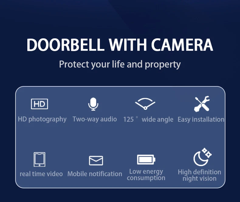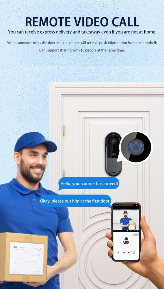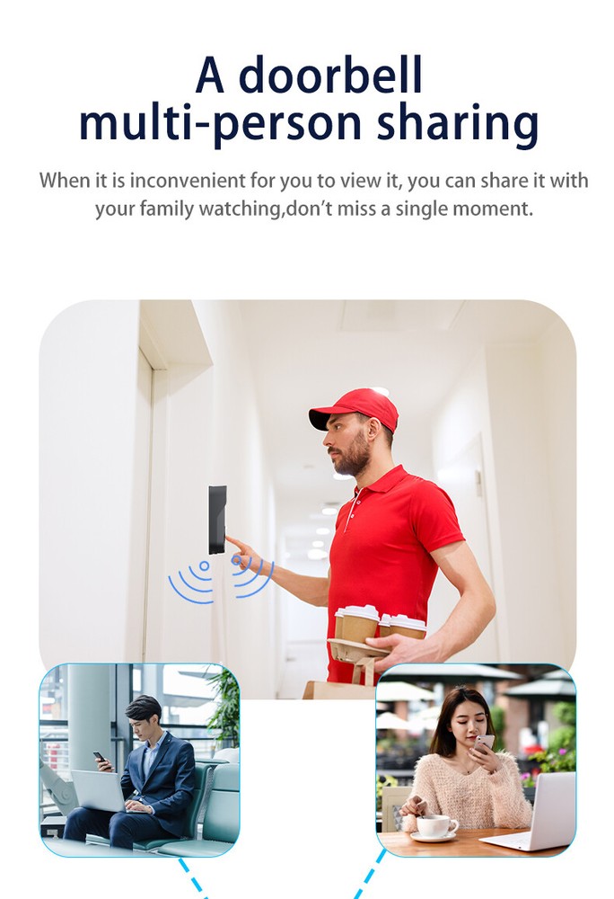Product Description If you have any questions, please contact customer service first, do not open disputes easily, thank you! Features: 1. Material: High-quality ABS material, light and durable, long service life 2. Lens: This video doorbell has an ultra-high-definition camera lens and a 130° wide-angle lens to protect your home security around the clock. 3. Video call: Built-in two-way microphone, when someone rings the doorbell, a push notification will be sent to the mobile phone, and the owner can enter the mobile phone call interface. You can check and talk to the visitor anytime and anywhere. 4. Volume adjustment: This doorbell has a strong and stable signal, easy pairing, and a transmission distance of up to 50 meters. The volume and ringtone can be adjusted according to your preferences. 5. Infrared night vision: Built-in high-quality IR LED lamp beads and light sensor, the picture is clear at night. When the ambient light drops to 2 Lux, it can also automatically switch from day mode to night mode. 6. Battery use: The doorbell has a built-in 1000 mAh rechargeable lithium battery. It can be used continuously for 2 to 4 months after being fully charged. There is no need for frequent charging. The bell is powered by USB and has a long battery life. 7. Storage method: This doorbell supports TF card + cloud storage. When a visitor presses the doorbell, it can capture the visitor's picture and save the record to the APP, so that the mobile APP can view past pictures at any time, which is safer and more secure. Specifications: Color: Black Viewing angle: 125° Mounting type: wall-mounted Power Mode: Battery Powered / USB Dual Purpose Working voltage: ≤36V Use APP: Tuya APP Battery used: Built-in rechargeable lithium battery Battery capacity: 1000 mAh Working time: 2-4 months Night vision type: infrared night vision Storage function: TF card (maximum support 64GB -not included) + cloud storage (free forever) WiFi connection: only supports WIFI IEEE802 11b/g/n (2.4GHz), RF 433mhz Voice system: two-way intercom/mobile phone remote prompt viewing Recording distance: about 5m Waterproof grade: IP65 Package Included: 1*Set Wireless Security Smart WiFi Doorbell Note: 1.The product comes standard without a memory card and customers need to purchase it themselves 2.Due to manual measurement, please allow 1-3mm error. Please make sure you don't mind before ordering. 3.Due to different lighting of photos and differences in monitors, the pictures may not reflect the actual color of the object. Please make sure you don't mind before ordering, thanks! About Us We accept all payments authorized by eBay. About Us We accept all payments authorized by eBay. powered by