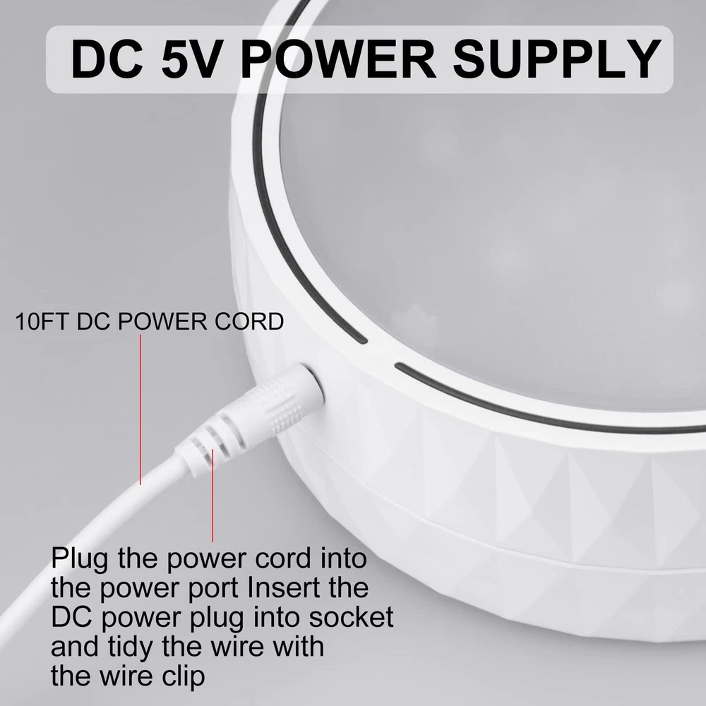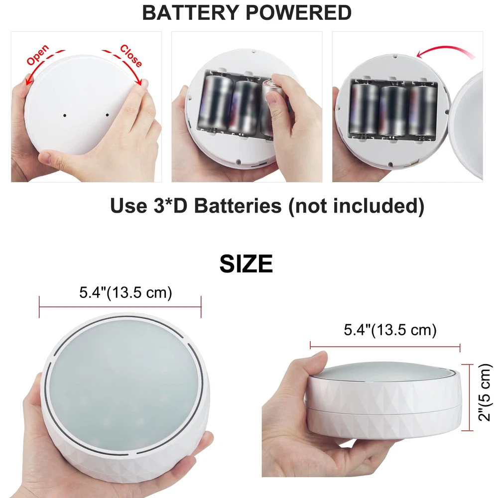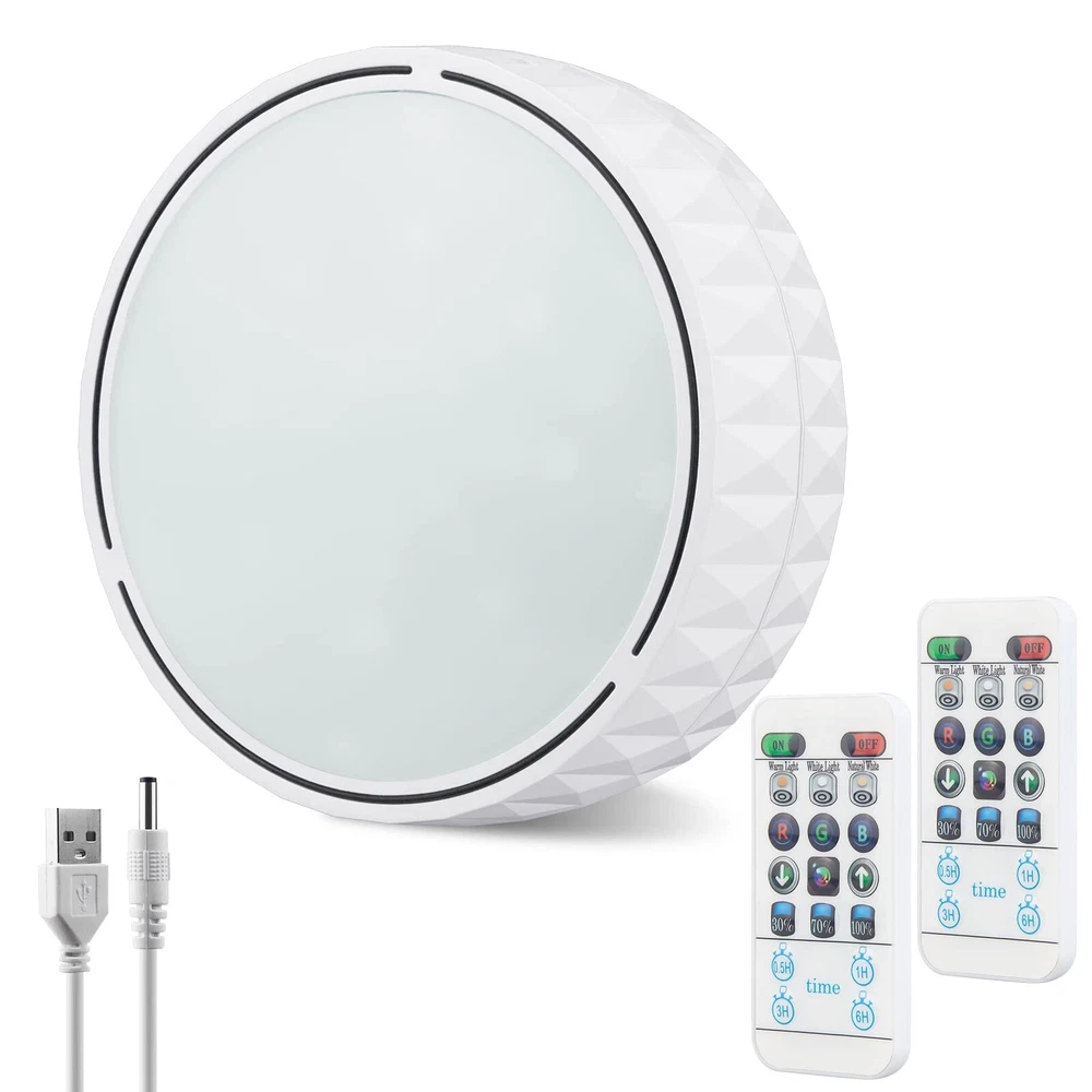 More Details *Size: 5.4"L x 5.4"W x 2"H * Material: ABS * 300 Lumens, 3000K/4500K/6000K, DC 5V, LED lifespan is 80,000 Hours. * The remote control can operate the light within 10 feet. * Powered by 3pcs D-Cel batteries (not included) or 5V/2A DC USB power cord(included, 10ft), and each set of batteries’ run time is 50-80 hours. * Choose a color from the 18 colors by pressing a corresponding color button. Set brightness and color-changing modes at dynamic mode / jump/ breath/ colorful rotation / gradient / solid color rotation. * Can be used anywhere like elder's room, kid's room, bathroom, hallway, wedding, party decoration, etc. Packing List - 1 x Ceiling Light - 1 x Remote Control - 1 x 10ft DC Power Cord - 4 x Screw Hardware - 3 x Plastic Anchor - 6 x Wire Clip - 1 x User Manual [Timer Function] -- You can set the shower light to turn off automatically in 0.5/1/3/6 hours by pressing the timer buttons on the remote, save energy and prolong battery life. [Brightness Dimmable] -- Press the dimmer buttons on the remote to adjust the brightness of the ceiling light to 30%, 70%,100%. [2 Power Supply Modes] -- The 5.4" puck light can be powered by 3pcs D-Cell batteries (not included), very long lasting, or you can use 5V/2A DC USB(included) to power it directly. [Super Bright] -- Each night light is 300 lumens, very bright, and there are 3 color temperatures for your choice, you can set it to warm white(3000K), natural white(4500K) or cool white(6000K). [5 Lighting Modes & 18 Colors Changing] -- The mood light has 18 color choices and 5 lighting modes, you can change the colors freely or set them jump or rotate. [Easy Installation] -- Very easy to mount with provided screws, no additional wiring is needed. Good choice for your bedroom, bathroom, hallway, corridor, bedside, closet, shower, stairway, closet, pantry, living room, kitchen, laundry room, etc.