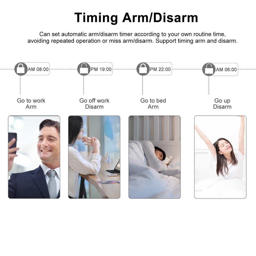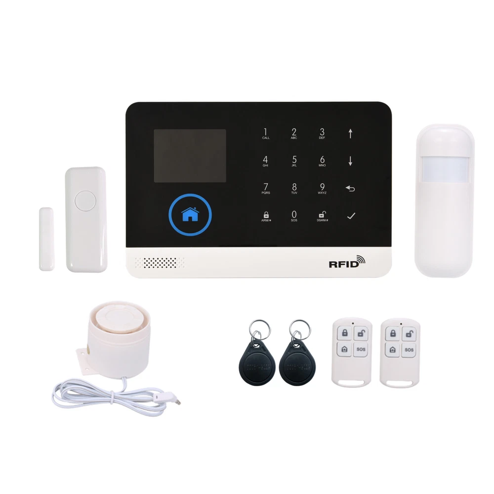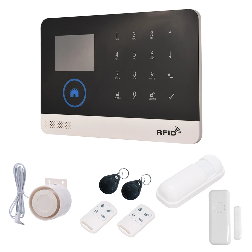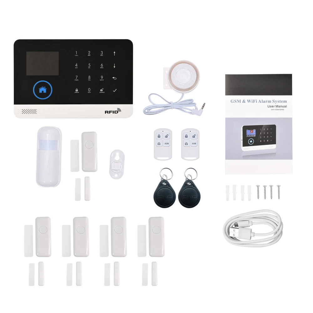 Overview: This alarm system contains a WIFI+GSM alarm panel, a PIR sensor, five door sensor, a wired siren, two RFID cards and two remote controllers. It supports for Alexa/ Home Voice Control and phone APP remote control. You can arm/disarm this alarm system via host, phone or remote controller. Advanced home automation functions for perfect smart home life. When the thief came in, the alarm will send out 110Db warnings to scare away the thief, or it will make auto-dial or send a message to remind you, so that it can help you reduce property loss and guarantee your home security. Features: 【Advanced TFT LCD Screen Display and Voice Prompt】: The Tuya Standard Alarm Security System features a high-quality 2.4" TFT LCD screen display, providing clear visuals and intuitive operation. The voice prompt guides users through every step, ensuring easy setup and usage. 【Comprehensive Remote Control Via Phone App】: This alarm system supports both WIFI and GSM connection, allowing users to easily control and monitor their home security from anywhere using the dedicated phone app. With just a few taps on your smartphone, you can remotely arm/disarm the system, adjust parameters, and manage accessories. 【Multiple Defense Zones and Flexible Arming Options】: With support for up to 100 wireless defense zones, including RFID cards and wireless detectors, this Smart Home Burglar Security Alarm System offers comprehensive conservation for your premises. It provides various arming modes, such as away arm, home arm, remote control arm, and remote telephone arm, giving you the flexibility to customize your security preferences. 【Enhanced Compatibility and Integration】: In addition to its standalone functionality, this alarm system is compatible with Alexa, Home, and IP cameras, enabling seamless integration into your smart home ecosystem. You can easily monitor your baby or elderly family members with the integrated IP camera feature and enjoy the convenience of voice control through your preferred smart assistant. 【Reliable and Convenient Features】: The Tuya Alarm Security System comes with several reliable and convenient features. These include SMS and dialing alarm notifications, support for 5 groups of preset alarm phone numbers, and timing arm and disarm functions. The system also includes a built-in lithium rechargeable battery to ensure continuous operation even during power outages. Additionally, the system supports daily operation and alarm record storage, as well as a 20-second voice message recording capability and an emergency SOS button for immediate help. Specifications: Power Adapter: DC 5V/1A (included) Working Current: <120mA Standby Current: <80uA Wireless Frequency: 433MHz Encoded Mode: 1527 Wireless Standard: IEEE802.11b/g/n 2.4G Alarm Panel Battery: Li-ion DC 3.7V 500mAh (Included) PIR Sensor Battery: 3*AAA 1.5V (Included) Door Sensor Battery: 1*CR2450 3V (Included) Remote Control Battery: 2*CR2025 3V (Included) Siren Volume: 110dB Temperature Range: 0℃~55℃ Humidity Range: <80% RH (No freezing) Item Size: Approx. 18.5*12.5*1.2cm/7.28*4.92*0.47in Item Weight: Approx. 226g/7.97oz Package Size: Approx. 21.5*15*7.5cm/8.5*5.9*2.9in Package Weight: Approx. 516g/22oz RFID up to 10PCS Package List: 1 * Wireless Alarm Panel 2 * Wireless PIR Motion Sensor 5 * Wireless Door/Window Sensor 2 * Remote Controller 5 * RFID Card 1 * Wired Siren 1 * Bracket for PIR Sensor 1 * Set of Mounting Screws 1 * USB Charging Cable 1 * User Manual (English) All loved it , you must satisfied!