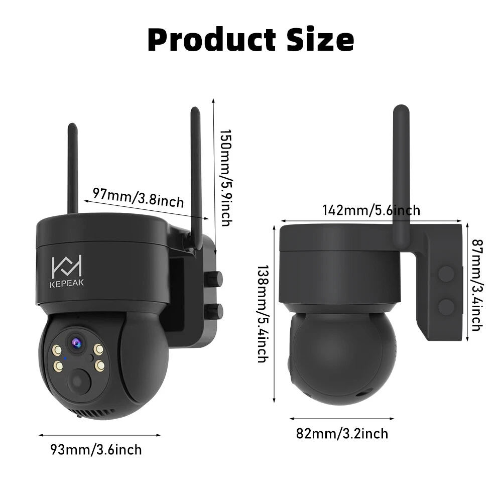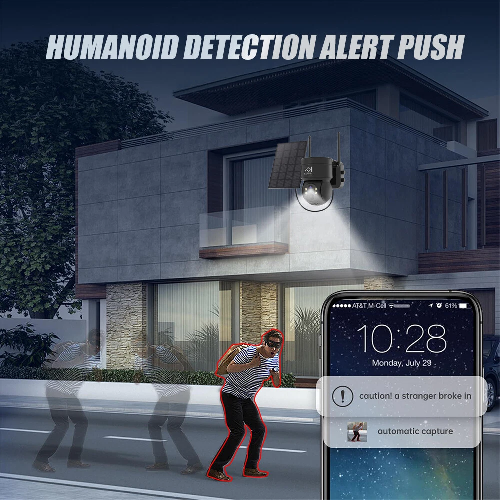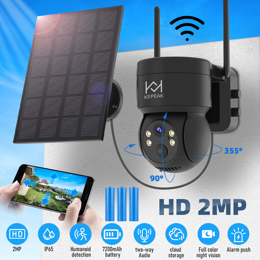 Features: 1.0-10 meters long-distance standby trigger, more agile boot 2.7200mAH battery 1 month long standby (30 times/day) 3. Automatic full-color alarm recording 4.2 million real pixels, high lens, high-quality imaging experience 5. Dual-light night vision, the night is also clear 6. Support humanoid motion detection, precise APP alarm push 7. Two-way voice real-time intercom, communicate anytime, anywhere 8. TF card storage can record without network, cloud storage video is more secure 9. IP65 waterproof, dustproof, no fear of wind and rain Model: SF-G09D Operation mode: icsee Main chip: dual-core 32-bit DSP (GK7202V200) Sensor: 2 million 1/3" F37P low-light CMOS Resolution: main stream: 1920*1080@15fps; sub stream: 800*448@15fps Lens: 4mm Black and white night vision: 10 meters Full color night vision: 10 meters Switching mode: automatic switching / manual switching Gimbal PTZ: horizontal 355° vertical 90° Audio input/two-way intercom/motion detection/humanoid detection/alarm linkage/alarm push/remote viewing/playback/cloud storage/one-key restore default/reset key/screen flip: support Local storage: expansion/support 128G TF card Light Sensitivity: Smart Dynamic Image encoding and decoding: H.265 Video system: 1080P@12FPS Video Mode: HD/SD Sound alarm: support pedestrian detection voice alarm function Network transmission: wifi Working temperature: –20°C~50°C Working humidity: 20%~85% Shell material: ABS Installation method: wall hanging Battery: 7200mA rechargeable battery Solar panel power: 4.5W Standby trigger distance: 9 meters Waterproof grade: IP65 Trigger detection angle: 110° Product List: 1/2 x solar Camera 1/2 x stand 1/2 x solar panel 1/2 x 3m wire 1/2 x screw pack 1/2 x charging cable 1/2 x 32GB Card 1/2 x instruction manual A-2K Camera(built in battery ) 【100% Wireless&Solar Powered】outdoor security camera wireless equipped with solar panel and built-in 10000mAh rechargeable battery with 6-9 months full charger work, providing 365 days non-stop power supply. 100% wireless, no circuit wiring hassles or external Installation fee, set up solar camera freely in minutes almost anywhere,like a shop,home,garage,yard,hotel,outdoor. IP66 waterproof can work well under harsh weather in rain,hail,storm,snow,and sun. Eco-friendly and money saving! 【PIR Motion Detection&Alert Notification】With advanced PIR sensor, the camera surveillance exterieur can detect human movement, push a real-time alert notifications to your phone, trigger loud siren, spotlight or sound alarming to frighten away unwanted visitors. Event recording to micro SD card up to 128GB(not included) and cloud with encrypted secure data. You can view and playback what is happening anytime, anywhere. The detection time,zone and sensitivity is adjustable. 【2K HD Images&Color Night Vision】Solar security camera outdoor wireless provides you 2K (2560 x 1440) full HD, 3MP clearer pictures and video than other 1080P security camera day or night. 4X Digital zoom-in for you see details more clealy. 3 night vision modes (full color, black and white, smart) for to choose. Built-in CMOS sensor and IR lights automatically sense ambient light and switch to color night vision mode, see clearer details and color images even in pitch dark up to 65ft! 【360°Coverage & Auto-tracking】The PTZ wireless cameras outdoor supports horizontal 355°and vertical 90°pan-tilt rotation auto tracking, providing you with 360°all-round protection almost no blind spots. You can also manually rotate the security camera to see different directions and monitor any corner remotely via the APP, protecting your property and family! 【2.4G WiFi Camera&Two-way Audio】Wireless security camera outdoor supports 2.4GHz WiFi (not 5GHz WiFi). Upgraded 5dBi dual antenna ensure more stable and stronger wifi. Real-time videos are smoother and clearer. Battery Powered Security Camera built-in noise reduction microphone and speaker, allows you to communicate with carriers or visitors clearly, or warn off the suspicious. The home security camera supports Multi-person to see live video simultaneously and protect your home together. Solar Powered Outdoor Security Cameras Real Time Human Detection by PIR and Push Equipped with a new version of PIR motion sensor, this solar-powered surveillance camera has an optimized AI algorithm that enables it to distinguish people from other things more accurately and quickly with 97% accuracy. When a human is detected, the security camera will automatically trigger an audio and strobe light to deter thieves, preventing your family from burglaries and other dangers and send instant push notifications to your phone. No msissing any key points. Real-time Two-way Audio Anytime Anywhere Wireless camera surveillance comes with the built-in microphone and speaker, offers you real-time communication, you can hear and speak to your family, postman, or warn off burglars remote. So convenient and helpful for your home security! 5dBi Dual Antenna WiFi Connection Equipped with dual 5dBi antennas, the camera enhanced stronger wifi signal and improve 50% more installation distance above regular WiFi camera. Always brings you better network performance. PIR Motion Detection Alarm Security camera built-in smart PIR sensor and humanoid motion detection, when human detected, trigger lights and sounds as an alarm and push insant notifications to your phone. Custom Alarm Area This bullet surveillance camera allows you to choose detection time and zone as you need for specific monitoring, reduce annoys false alarms. Great helper for guarding your home and family. Real-Time Notifications Get notifications when your camera detects motion and keep you informed when anything happens. Share with Your Family Share with families/friends to watch online anywhere simultaneously via App. Just scan a code or search account on the App, they will be able to remote control and check. Flexible and Secure Storage All recordings are encrypted storag