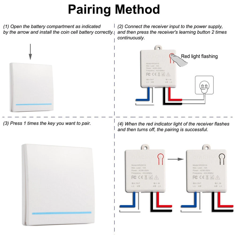 Product Description Wireless Switch 433mhz Receiver Module AC 90V~250V 10A 25m Strong Rf Signal Features: 1. Relocate Or Add Wall Switches Anywhere Without Wiring: Wireless Light Switch And Receiver Kit Eliminates The Need For In-Wall Wiring; Easily Remote Control Your Lights Without Altering The Existing System; No Need To Tear Down Walls Or Use Wifi. Ideal For Those With Mobility Challenges 2. Simple Installation With Neutral Wire Required: Install The Relay Receiver Between The Power Source And Lamps; Compact Receiver Fits In Control Boxes Like Electrical Junction Boxes; 3. Use Multiple Sets In A Room Without Interference: Wireless Light Switch Kit Uses Rolling/Dynamic Codes To Prevent Interference; Allows Multiple Kits In The Same House To Work Independently; Compatible With Most Lamps And Bulbs 4. Up To 25m Strong Rf Signal In Open Area: Remote Light Switch Kit With A Strong Rf Signal Works Through Walls And Doors; Ideal For Use In Lofts, Attics, Stairwells, Basements, Garages, And More Pairing Method: 1. Open The Battery Compartment As Indicated By Arrow And Install The Coin cell Battery Corectly. 2. Connect The Receiver Input To The Power Supply, Then Press The Receiver' S Learning Button 2 Times Continuously. 3. Press 1 Times The Remote Panel Switch Key You Want To Pair. 4. When The Red Indicator Light Of The Receiver Flashes And Then Turns Off, The Pairing Is Successful. Reset: Press The Learning Button (On The Receiver) 8 Times. The Existing Data Will Be Deleted Succeed. Specifications: Working Voltage: AC 90V~250V Max Current: 10A Max Load Power: Resistive Load: 2200W(AC220V) Incandescent Lamp: 2200W(AC220V) Inductive Load: 500W (AC220V) Capacitive Load: 200W (AC220V) Energy-Saving Lamp: 300W(AC220V) Rf Frequency: 433mhz Working Temperature: -10℃~55℃ Receiving Sensitivity: >108 db Support Encoding: 1527 Leaning Code Rf Operating Mode: ASK Superheterodyne Wireless Reception Receiving Range: 25 Meters(Open Space) Switch Battery: Cr2032 Coin Cell Battery (Not Include) Package Included: 1* 433mhz Receiver Module 1* Switch About Us Welcome to the our store! You can chat with us about anything to do with our products. we dedicated to provide best products and services. Payment All ebay verified payments are accepted, if you have any questions about the payments, you can let us know, we will try our best to solve this for you. Shipping We usually ship all packages within 24 hours after payment and 48 hours at latest for a small part of our products. Returns Always believe we can solve your questions about our products with communication. And if it comes to a return at last, the item must be intact and the same condition when you received it, also the return is only available within 30 days after delivery. Contact Us You can contact us at any time via ebay messages, we will reply at the first time in the working times. We will always be here for you! Working time: 9am to 6pm, Monday to Friday. You may also like New High Quality Sapphire Watch Glass Replacement Part For Casio MDV-106 19.99 USD 3.69 USD 100Pcs Microphone Pop Filter Hygiene Mike Foam Cover Odor Removal Disposable 13.96 USD 4Pcs Upgrade Axle Arms With Motor(2A+2B) For E58 JY019 FPV RC Drone Quadcopter 8.99 USD 3.69 USD 1/4 Screw Adapter Mount Base With Screws For GoPro Max Hero 10 9 8 Black Camera 8.99 USD 3.69 USD Anti Snore NASAL DILATORS Stop Snoring CONES Breathe Easy NOSE Congestion 2.95 USD 3.69 USD 8 in 1 USB Programming Cable+Software CD For Motorola Baofeng Kenwood HYT Radio 10.95 USD 3.69 USD powered by