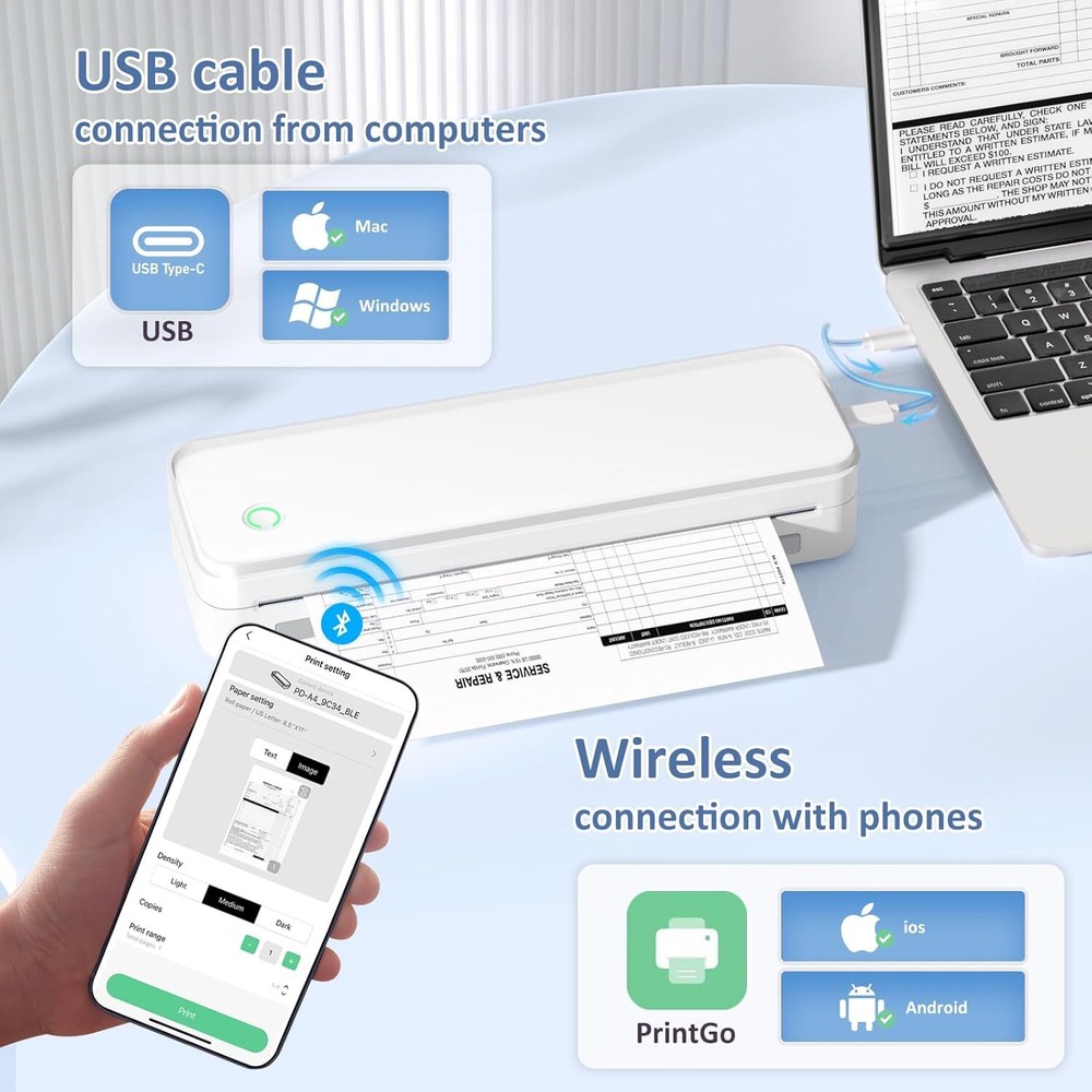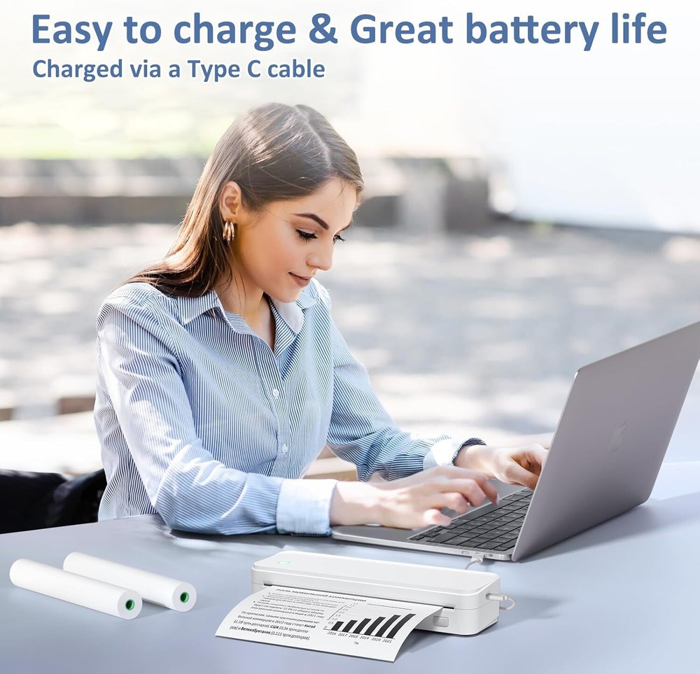 About this item Inkless Efficiency - This mobile printer offers cost-effective and inkless printing solutions. Utilizing advanced thermal technology eliminates the need for ink, toner, or ribbons. The package includes a printer, 3 rolls of thermal printing paper (one roll in the printer & extra 2 rolls), a carrying case, a charging cable, instruction manual, and a guide card. Only compatible with specific thermal paper, not compatible with inkjet or laser paper. Ultra-Portable Design - Weighing just 1.75lb and measuring 11 x 4 x 4 inches, this portable printer is incredibly lightweight and compact. Perfect for on-the-go printing during travels, work, or university, it easily fits into backpacks or briefcases. Ideal for contracts, office documents, and more. Seamless Bluetooth Connectivity - The mobile sticker printer effortlessly connects to iOS & Android devices via Bluetooth. It also serves as a compact printer for laptops and computers. Simply download the app for smartphone printing and install the driver for laptops. Connects via USB cable when using a computer to print. Print anytime, anywhere. High-Quality Printing & Long-lasting Battery - Experience crystal-clear printing with this portable travel printer. Equipped with 2 built-in 2600mAh batteries, it offers up to 3 hours of continuous printing and 360 sheets on a single charge. Space-Saving Design - Say goodbye to clutter with the built-in paper bin of the printer. It saves space and keeps your workspace tidy, whether you're on the go or in a vehicle. With two ways to load thermal paper and the ability to print documents ranging from 2 to 8.5 inches, it caters to various printing needs. Perfect Gift for Holidays - This thermal printer can print clear photos, images, design drawings, and text. It's perfect for busy professionals and students. Comes with a nice case, making it an ideal holiday gift for families and friends. Product dimensions: 11 x 4 x 4 inches