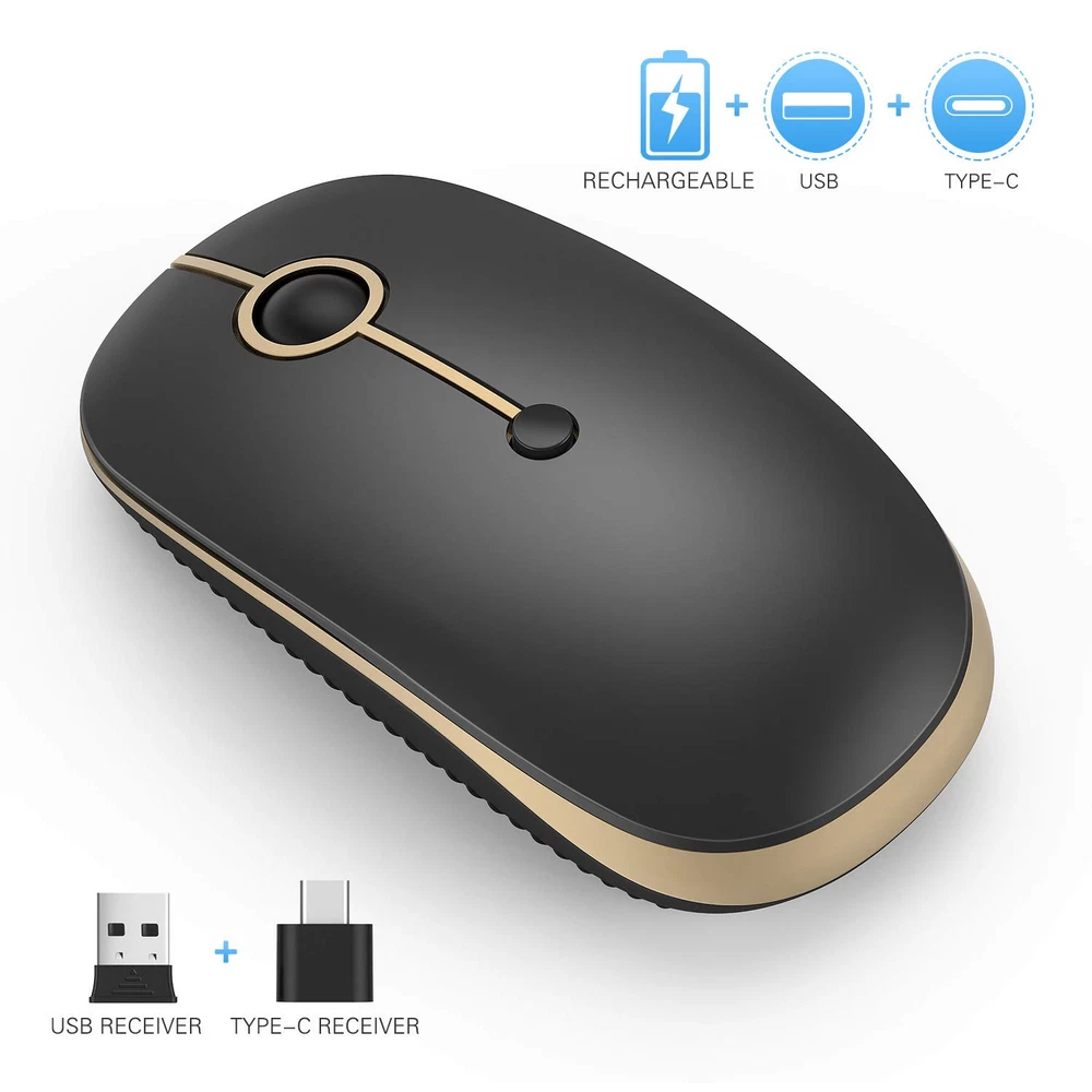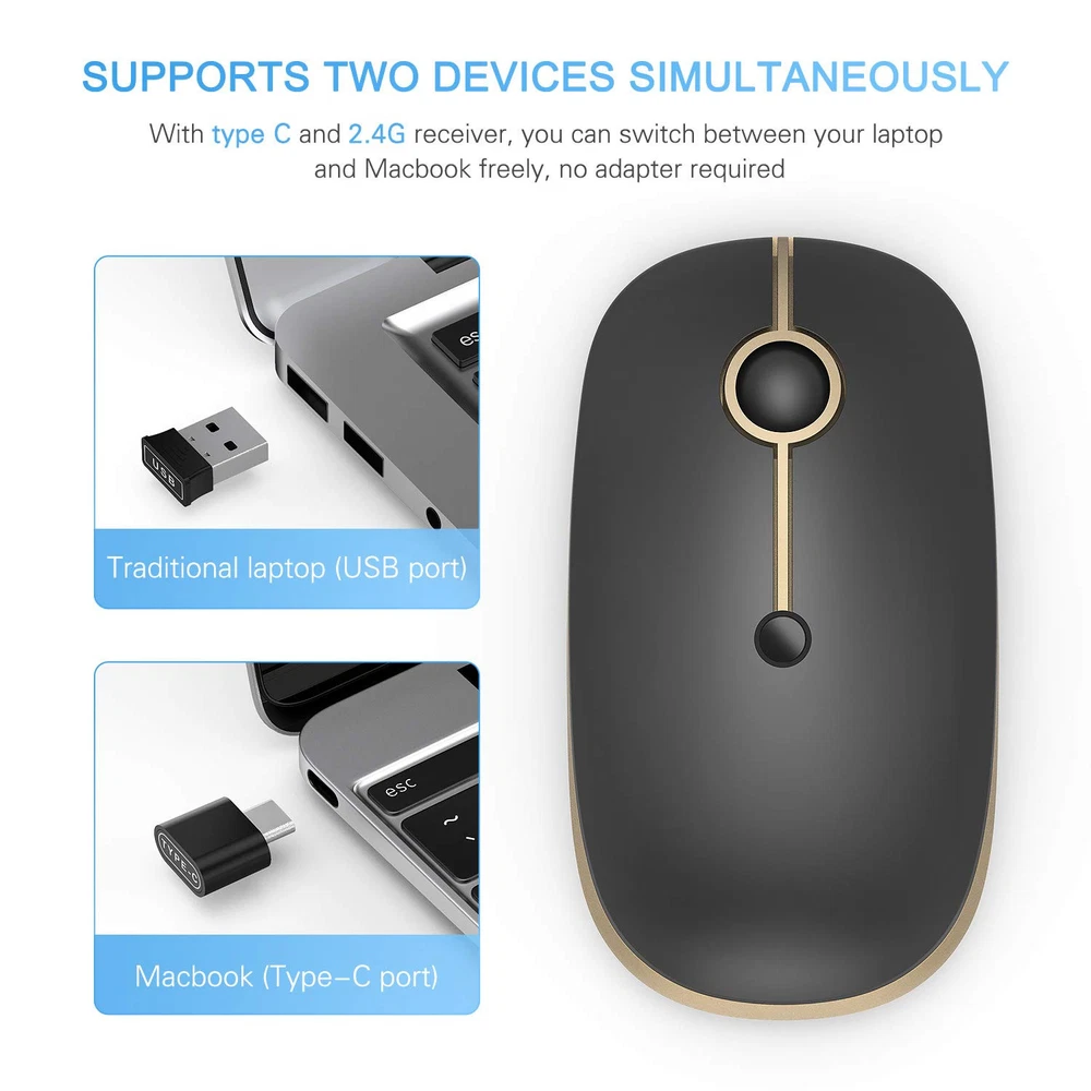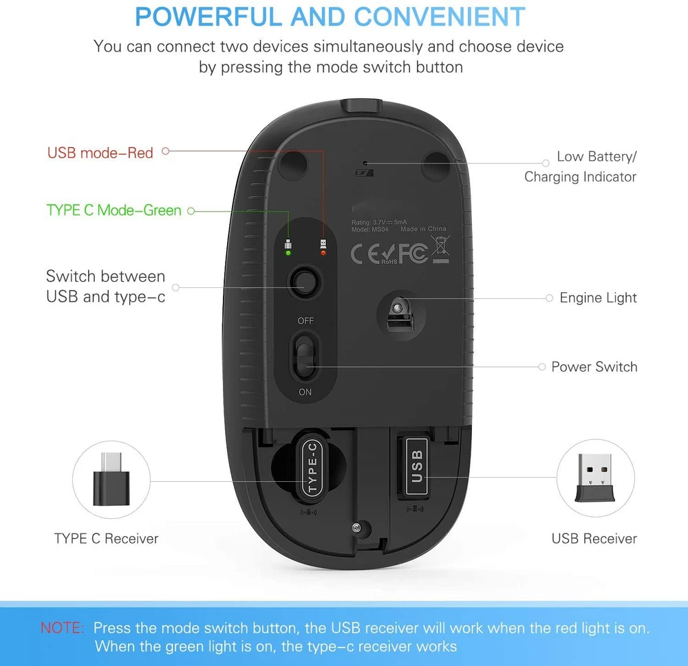 【WIDE COMPATIBILITY】 Well compatible with Windows7/8/10/XP, Vista, Mac OS X 10.10 or later. Fits for all Type-C devices, tablets, cellphones, Macbook, Macbook Pro, iMac, iMac Pro, Chromebook and more 【RECHARGEABLE & QUIET CLICKING】Easily recharged through the included charging cable and built-in durable 300mAh lithium rechargeable battery. Smooth frosted surface and quiet clicks can bring a better user experience and free your worry about bothering others and keep you stay focused while working 【ADJUSTABLE DPI AND ERGONOMIC DESIGN】3 DPI lecvels (1000/1600/2400 DPI) allows you to change the cursor sensitivity easily and track more smoothly over a variety of surfaces. Contoured shape fits your hands perfectly, reducing hand fatigue 【EASY TO USE & CONVENIENT】PLUG and PLAY. The nano type-C and usb receiver is in the battery compartment of the mouse. Take it out and plug it into the port of the device separately. No additional drivers or software needed. You can switch between connected devices with a single button. Store the receiver in the battery compartment when you on the go 【SKIN-FRIENDLY & WARRANTY】Silent click mouse with classic design offers your hand maximum support and comfort. Every product includes 12-month warranty. Please buy with confidence