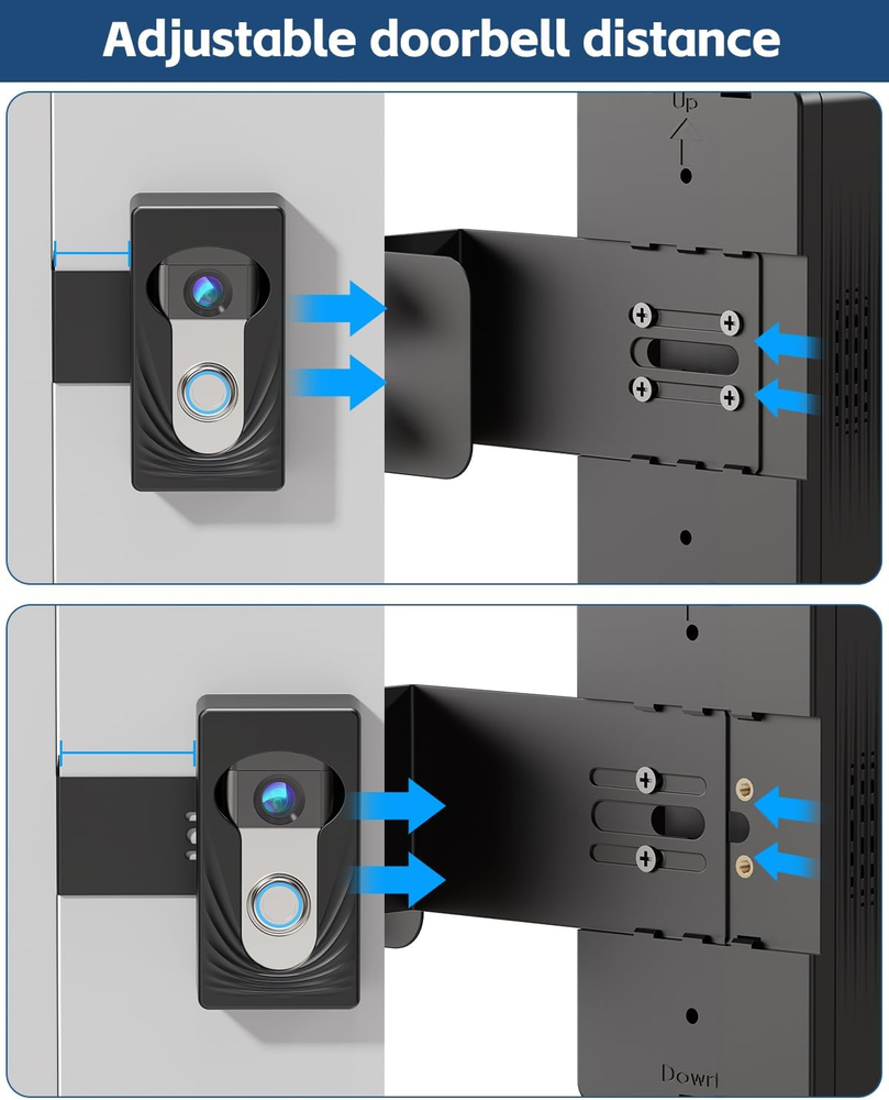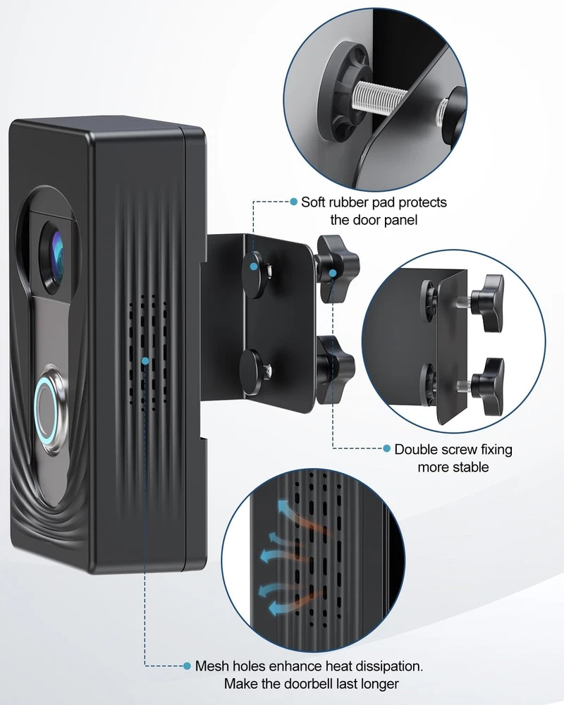 Compatible With Multiple Wireless Doorbells: Trushome doorbell mount is used for different sizes of doorbells by filling the inside with sponges of different thicknesses. compatible with Ring doorbell 4/3/2/1 & Ring video Doorbell(2nd Generation-2020 Release)& Ring video Doorbell 3 Plus &Ring battery doorbell plus(2023 release)& Ring battery Doorbell Pro(2024 Release), Blink doorbell. Note: Only for wireless video doorbells, not for wired ones (doorbell not included). Suitable for 1.25inch-1.95inch thick doors: The anti-theft doorbell mount with no drill is only suitable for the thickness of the door is 1.25inch-1.95inch, and the gap between the door and frame is more than 0.06inch. So you must measure your door before buying. What type of doors are suitable for?: The doorbell mount is only suitable for inward-opened doors. Please carefully note that the outward-opened doors& storm doors& screen doors are not suitable. No Drill Doorbell Mount: The anti-theft door mount is fixed with double screws, more stable than the ordinary single-screw doorbell mount. No drilling design can avoid damaging the integrity of the door panel and the newly designed front face opening does not affect the doorbell's motion detection sensor. Easy Installation & Cooling Design: You can install a doorbell mount in seconds. Place the video doorbell into the door mount, then adjust the setting screws according to the thickness of the door. We have designed many mesh holes around the doorbell mount, which is conducive to heat dissipation of the doorbell and makes the doorbell last longer. Quality After-Sales Services: Trushome has always been committed to providing customers with a better shopping experience. If you are not satisfied with our products, please feel free to contact us, and we will help you solve the problem within 24 hours as soon as possible. Product Description Which Doors are Applicable? Note: Not suitable for storm doors, as the outside storm door will block the camera's view Other Findings Add to Cart Add to Cart Customer Reviews 3.9 out of 5 stars 59 — — 4.3 out of 5 stars 95 4.4 out of 5 stars 815 4.4 out of 5 stars 421 Price — — — $26.99 $ 26 . 99 $25.99 $ 25 . 99 — Color Selection Black Black Grey Black Black / Silver Green Features Inclined Plate and Angle Mount Adjustable Angle with Mount 2 Pack with charging station With Charging Plug 65 Luminous Light Beads 80W Electric lunch box 1.5 L Function Compatible with ring and blink Compatible with ring Power for Ring Device / Under Cabinet Lighting Food heating Weight 0.8lbs 0.6lbs 10.6oz / 0.97 lbs 2.7 lbs Size / / / / 13.2"x1.8"x0.5" 9"x6"x4.8" Scope of application Inward Door Inward Door / Inward Door Kitchen, Closets, Stairway drivers/office workers