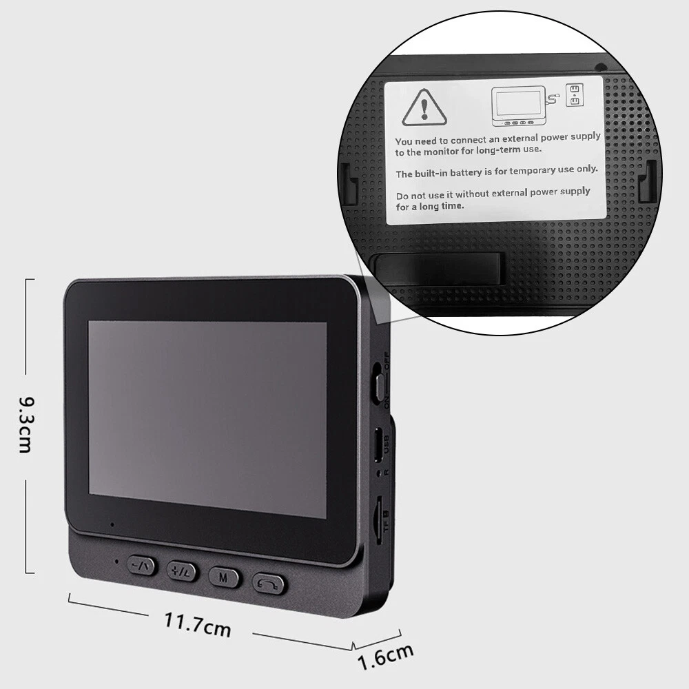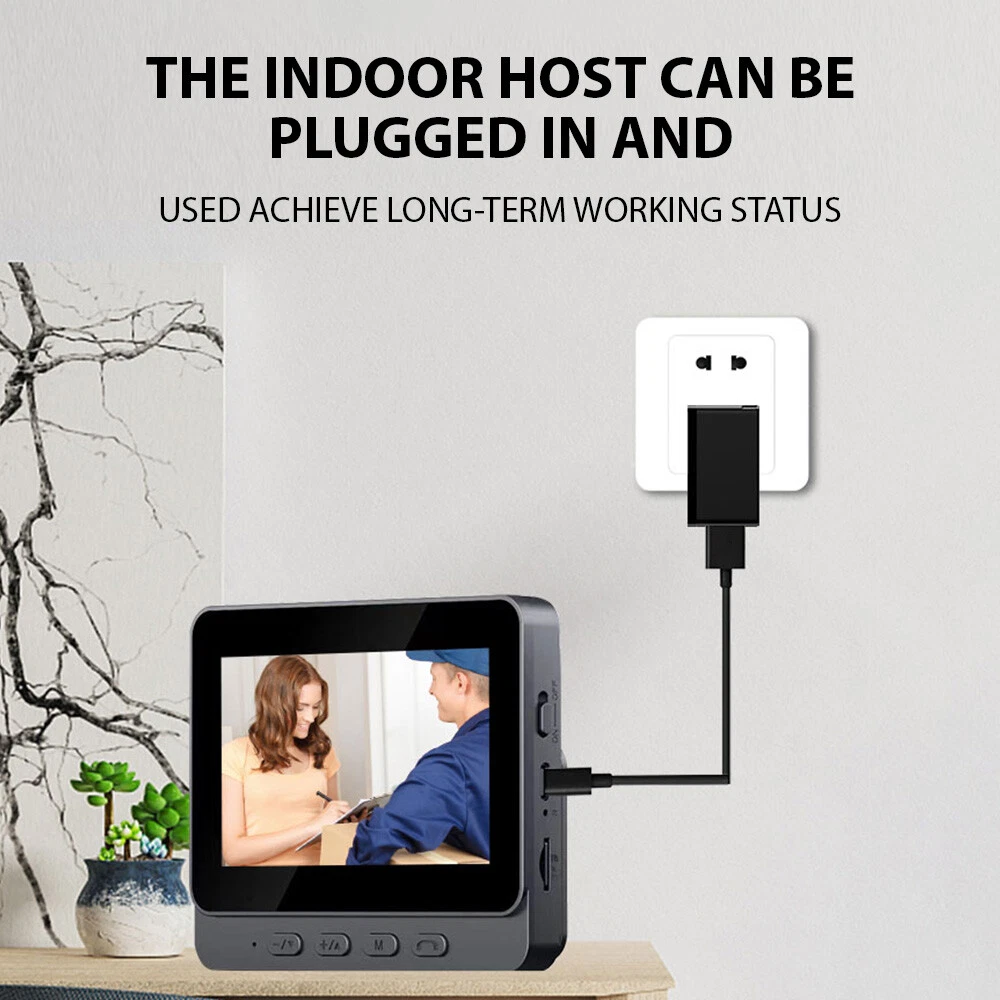 The 4.3-inch IPS screen and 2.4-inch wireless visual intercom doorbell are powerful smart home products. This doorbell adopts advanced wireless technology, which can connect with mobile phones or other devices, allowing you to watch the situation at the door anytime, anywhere through your phone. It is equipped with high-definition video monitoring function, which can provide clear images and videos. Through the built-in camera, you can view visitors in real-time and make two-way calls to communicate with them. Features: 【Wireless Visual Intercom Doorbell】: Our 4.3-inch IPS screen 2.4 wireless visual intercom doorbell provides a clear and wide view, allowing you to see who's at the door without opening it. It's a smart doorbell that offers high-definition video monitoring for your home. 【Long Battery Life】: Equipped with an 800mAh polymer battery, the doorbell can last up to 2 months with 10 daily presses after a full charge. Please note that the further the distance, the more power it consumes. 【Night Vision & Wide Viewing Angle】: With 4 advanced 850nm infrared night vision lights, the doorbell intelligently optimizes night vision mode, allowing you to see clearly even in pitch darkness. It offers a viewing angle of 70 degrees, providing a comprehensive view of your doorstep. 【Large Storage & Two-way Intercom】: The doorbell supports up to 256GB SD card, allowing you to store a large amount of video footage. The 2.4G transmission allows for internet-free interconnection and supports two-way video intercom, providing a convenient and secure way for you to communicate with visitors. 【Easy Installation & Low Power Consumption】: The doorbell is wireless and easy to install. It features a built-in speaker and microphone, and is powered by 2A/DC 5V. It offers ultra-low power consumption and long standby time. Please note that the monitor needs to be connected to an external power source for long-term use. The built-in battery is only for temporary use and should not be used without an external power source for a long time. Specifications: Display Screen: 4.3 inches Power Supply Information: DC5V/2A Audio Information: Built-in speaker, microphone Working Humidity: 10% -90% SD Card: Supports up to 256GB WIFI Mode: 2.4G Visual Angle: 70 degrees Night Vision Type: infrared night vision Working Temperature: -10 °~60 ° Wireless Distance: Open 100m/328ft, other 20m/65.6ft Battery Capacity: 800mah. After being fully charged, press 10 times a day for up to 2 months (the farther the distance, the more severe the power consumption) Notes: 1. The monitor needs to be connected to an external power source for long-term use. 2. The built-in battery is only for temporary use. 3. Do not use without an external power source for a long time. Note: Due to the different display screen and light effect, the actual color of the item might be slightly different from the color showed on the pictures. Packing List: 1 x Wireless Doorbell 1 x Display 1 x Charging Cable 1 x User Manual 1 x Large Base Plate 1 x Small Base Plate 1 x Large Back Sticker 1 x Small Back Sticker 1 x Screw Set More offers, more surprises