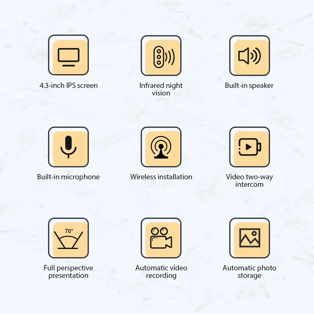 The 4.3-inch IPS screen and 2.4-inch wireless visual intercom doorbell are powerful smart home products. This doorbell adopts advanced wireless technology, which can connect with mobile phones or other devices, allowing you to watch the situation at the door anytime, anywhere through your phone. It is equipped with high-definition video monitoring function, which can provide clear images and videos. Through the built-in camera, you can view visitors in real-time and make two-way calls to communicate with them. Features: 【Wireless Visual Intercom Doorbell】: Our 4.3-inch IPS screen 2.4 wireless visual intercom doorbell provides a clear and wide view, allowing you to see who's at the door without opening it. It's a smart doorbell that offers high-definition video monitoring for your home. 【Long Battery Life】: Equipped with an 800mAh polymer battery, the doorbell can last up to 2 months with 10 daily presses after a full charge. Please note that the further the distance, the more power it consumes. 【Night Vision & Wide Viewing Angle】: With 4 advanced 850nm infrared night vision lights, the doorbell intelligently optimizes night vision mode, allowing you to see clearly even in pitch darkness. It offers a viewing angle of 70 degrees, providing a comprehensive view of your doorstep. 【Large Storage & Two-way Intercom】: The doorbell supports up to 256GB SD card, allowing you to store a large amount of video footage. The 2.4G transmission allows for internet-free interconnection and supports two-way video intercom, providing a convenient and secure way for you to communicate with visitors. 【Easy Installation & Low Power Consumption】: The doorbell is wireless and easy to install. It features a built-in speaker and microphone, and is powered by 2A/DC 5V. It offers ultra-low power consumption and long standby time. Please note that the monitor needs to be connected to an external power source for long-term use. The built-in battery is only for temporary use and should not be used without an external power source for a long time. Specifications: Display Screen: 4.3 inches Power Supply Information: DC5V/2A Audio Information: Built-in speaker, microphone Working Humidity: 10% -90% SD Card: Supports up to 256GB WIFI Mode: 2.4G Visual Angle: 70 degrees Night Vision Type: infrared night vision Working Temperature: -10 °~60 ° Video Processing Rate: 640x480 Image Sensor: GC0328 Working Humidity: 20% -80% RH SD Card: Supports up to 256GB Night Vision Type: Infrared night vision Working Humidity: 10% -90% Wireless Distance: Open 100m/328ft, other 20m/65.6ft Battery Capacity: 800mah. After being fully charged, press 10 times a day for up to 2 months (the farther the distance, the more severe the power consumption) Notes: 1. The monitor needs to be connected to an external power source for long-term use. 2. The built-in battery is only for temporary use. 3. Do not use without an external power source for a long time. Packing List: 1 x Wireless Doorbell 1 x Display 1 x Charging Cable 1 x User Manual 1 x Large Base Plate 1 x Small Base Plate 1 x Large Back Sticker 1 x Small Back Sticker 1 x Screw Set