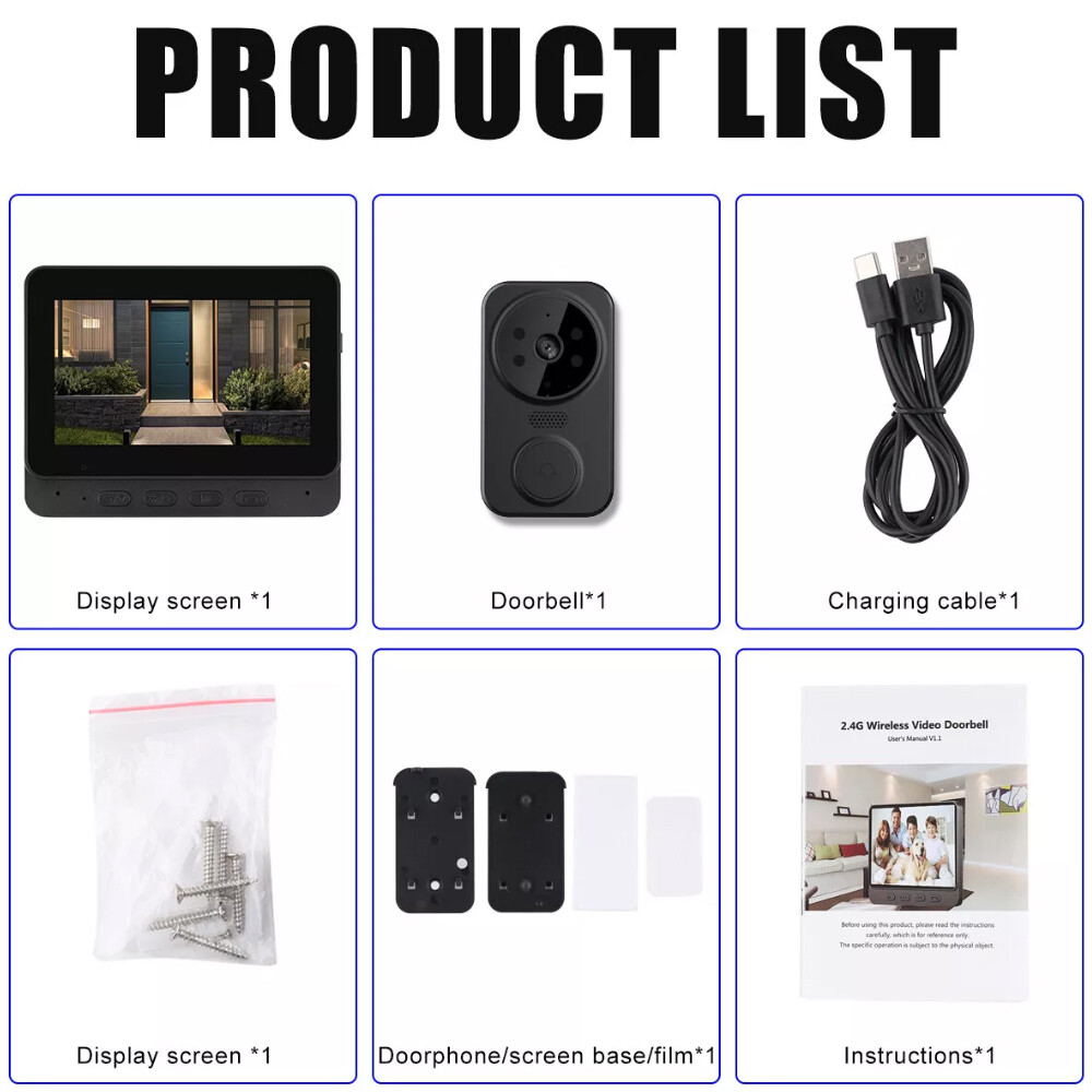 Description: The 4.3-inch IPS screen and wireless visual intercom doorbell are powerful smart home products. This doorbell adopts advanced wireless technology, which can connect with mobile phones or other devices, allowing you to watch the situation at the door anytime, anywhere through your phone. It is equipped with high-definition video monitoring function, which can provide clear images and videos. Through the built-in camera, you can view visitors in real-time and make two-way calls to communicate with them. Features: 【Wireless Visual Intercom Doorbell】: Our 4.3-inch IPS screen wireless visual intercom doorbell provides a clear and wide view, allowing you to see who's at the door without opening it. It's a smart doorbell that offers high-definition video monitoring for your home. 【Long Battery Life】: Equipped with an 800mAh polymer battery, the doorbell can last up to 2 months with 10 daily presses after a full charge. Please note that the further the distance, the more power it consumes. 【Night Vision & Wide Viewing Angle】: With 4 advanced 850nm infrared night vision lights, the doorbell intelligently optimizes night vision mode, allowing you to see clearly even in pitch darkness. It offers a viewing angle of 70 degrees, providing a comprehensive view of your doorstep. 【Large Storage & Two-way Intercom】: The doorbell supports up to 256GB S/D card, allowing you to store a large amount of video footage. The 2.4GHz transmission allows for internet-free interconnection and supports two-way video intercom, providing a convenient and secure way for you to communicate with visitors. 【Easy Installation & Low Power Consumption】: The doorbell is wireless and easy to install. It features a built-in speaker and microphone, and is powered by 2A/DC 5V. It offers ultra-low power consumption and long standby time. Please note that the monitor needs to be connected to an external power source for long-term use. The built-in battery is only for temporary use and should not be used without an external power source for a long time. Specifications: Display Screen: 4.3 inches Power Supply Information: DC5V/2A Audio Information: Built-in speaker, microphone Working Humidity: 10% -90% S/D Card: Supports up to 256GB Connection Method: BT interconnection Visual Angle: 70 degrees Night Vision Type: infrared night vision Working Temperature: -10 °~60 ° Wireless Distance: Open 100m/328ft, other 20m/65.6ft Battery Capacity: 800mah. After being fully charged, press 10 times a day for up to 2 months (the farther the distance, the more severe the power consumption) Notes: 1. The monitor needs to be connected to an external power source for long-term use. 2. The built-in battery is only for temporary use. 3. Do not use without an external power source for a long time. Note: Due to the different display screen and light effect, the actual color of the item might be slightly different from the color showed on the pictures. Packing List: 1 x Wireless Doorbell 1 x Display 1 x Charging Cable 1 x User Manual 1 x Large Base Plate 1 x Small Base Plate 1 x Large Back Sticker 1 x Small Back Sticker 1 x Screw Set Payment Delivery details About Taxes About us Contact us Payment Payment is managed by eBay. We will ship to your eBay address. Please make sure your address setting is correct before checkout. Delivery details WORLDWIDE SHIPPING. (Except some countries and APO/FPO) Orders processed timely after the payment verification. The images shown are not the actual item and are for your reference only. SERVICE TRANSIT TIME is provided by the carrier and excludes weekends and holidays. Transit times may vary, particularly during the holiday season. About Taxes For all orders, please note that: Taxes and charges are not included in the item price or shipping charges. Please check with your country's customs office to determine what these additional costs will be prior to bidding/buying. PLEASE NOTE: S&H DOES NOT INCLUDE DUTIES, LOCATL TAXES OR ANY OTHER IMPORTATION FEES. The buyer needs to cooperate with the local customs for customs clearance Any customs duties incurred shall be paid by the buyer We are not responsible for any custom duty or import tax. Please list your special requests (color, packages, etc.) in the PAYPAL NOTES SECTION when you make payment. About us We are committed to provide excellent service for all buyers. Welcome to our eBay store:) Contact us Our Working Time (Beijing): 9:00 am ~ 6:00 pm (Monday~Friday) If the item is defective or taking longer than usual to reach you, please do not leave us negative feedback. Send us a message through eBay and we will resolve the issue promptly. Thanks for your support and understanding! If you have any questions, please contact us via ebay mail, we will reply you on the working day in China. And there will be no reply as we are out of office during weekend, we will reply on Monday. Because the time zone between the seller and the buyer is different, please be patient and wait for your understanding. We will be happy to serve you.