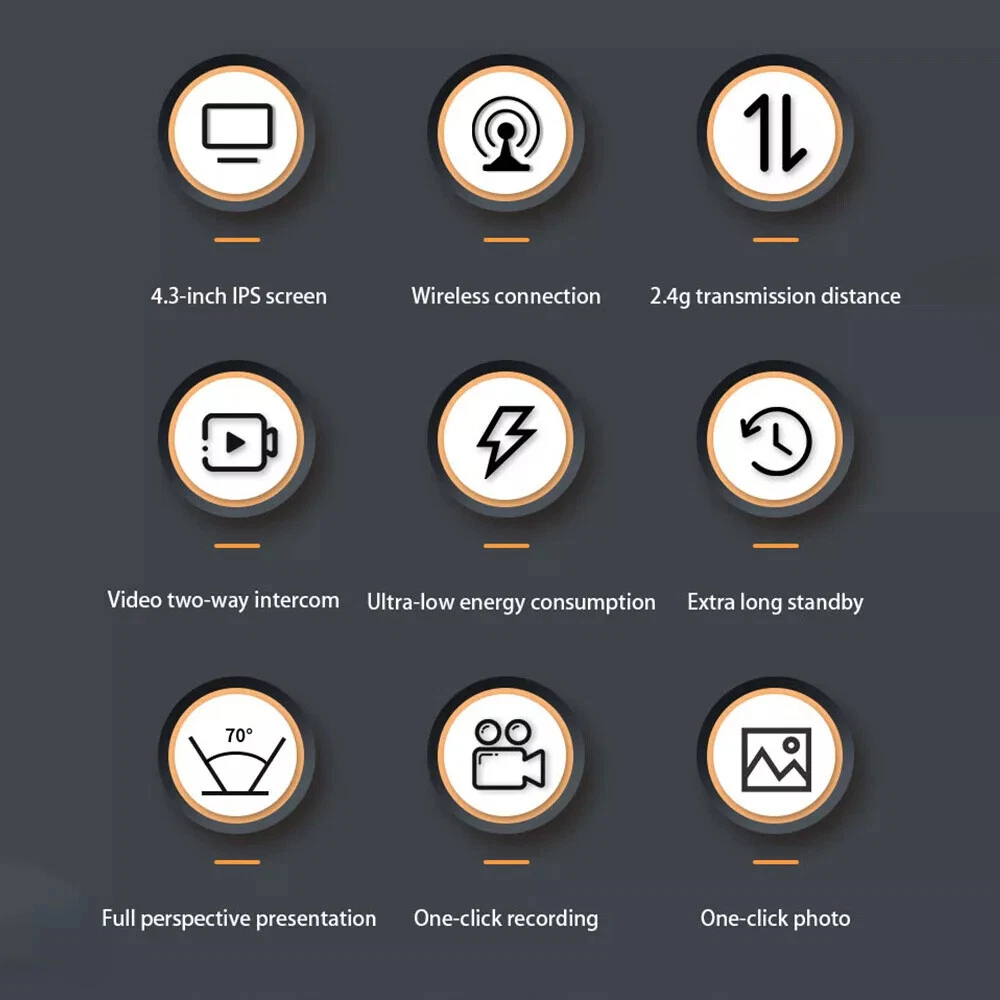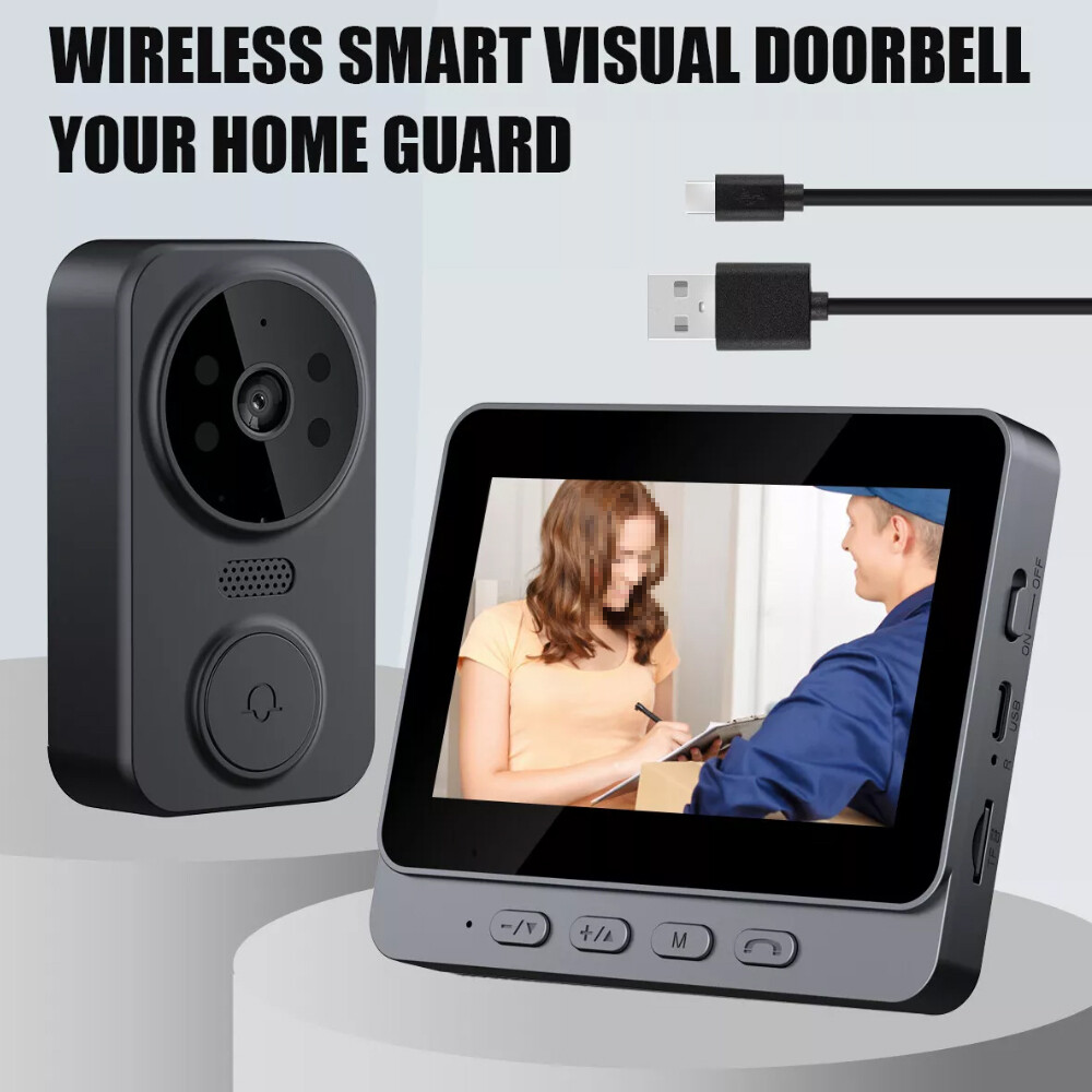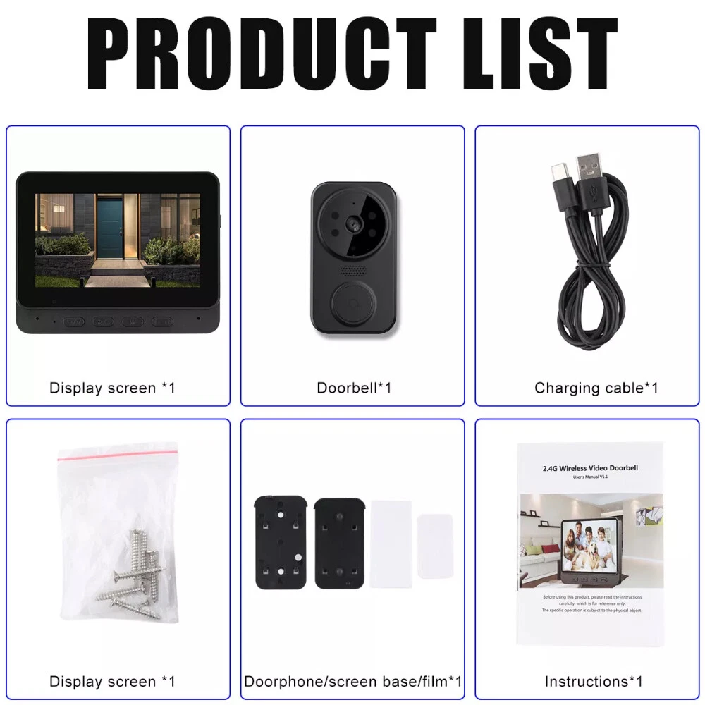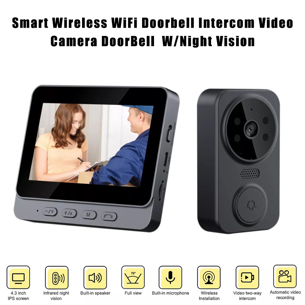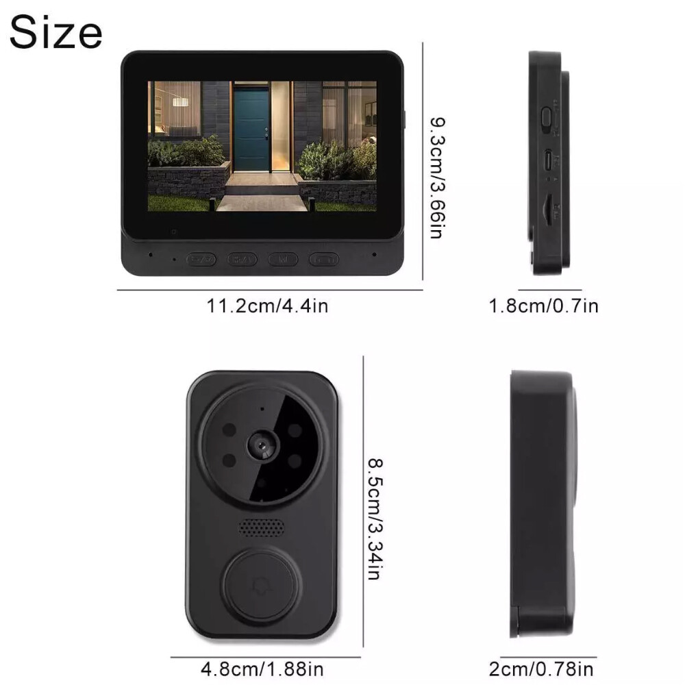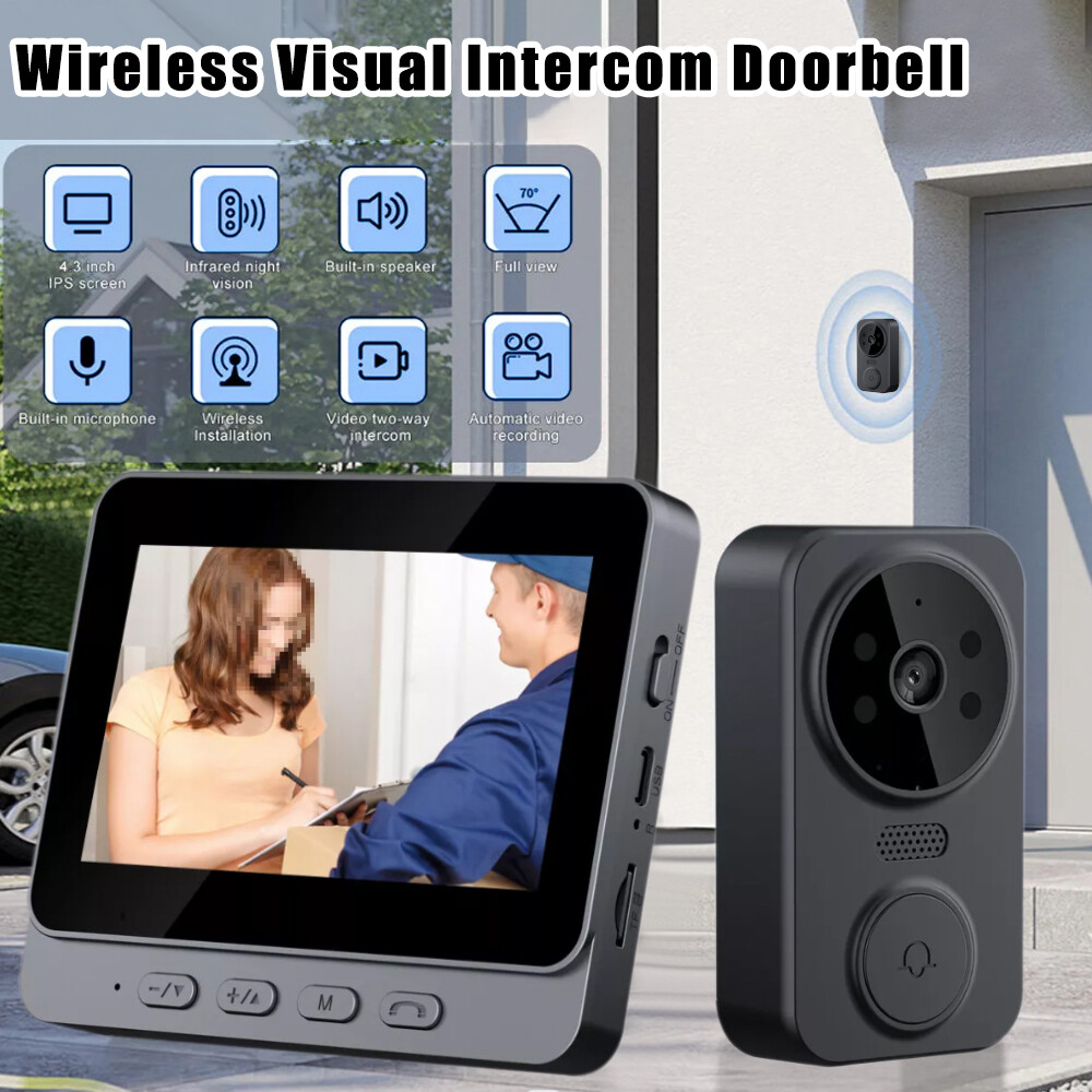 Wireless Visual Doorbell Camera Video Monitoring Intelligent 2-Way intercom Kit Description: The 4.3-inch IPS screen and wireless visual intercom doorbell are powerful smart home products. This doorbell adopts advanced wireless technology, which can connect with mobile phones or other devices, allowing you to watch the situation at the door anytime, anywhere through your phone. It is equipped with high-definition video monitoring function, which can provide clear images and videos. Through the built-in camera, you can view visitors in real-time and make two-way calls to communicate with them. Features: 【Wireless Visual Intercom Doorbell】: Our 4.3-inch IPS screen wireless visual intercom doorbell provides a clear and wide view, allowing you to see who's at the door without opening it. It's a smart doorbell that offers high-definition video monitoring for your home. 【Long Battery Life】: Equipped with an 800mAh polymer battery, the doorbell can last up to 2 months with 10 daily presses after a full charge. Please note that the further the distance, the more power it consumes. 【Night Vision & Wide Viewing Angle】: With 4 advanced 850nm infrared night vision lights, the doorbell intelligently optimizes night vision mode, allowing you to see clearly even in pitch darkness. It offers a viewing angle of 70 degrees, providing a comprehensive view of your doorstep. 【Large Storage & Two-way Intercom】: The doorbell supports up to 256GB card, allowing you to store a large amount of video footage. The 2.4GHz transmission allows for internet-free interconnection and supports two-way video intercom, providing a convenient and secure way for you to communicate with visitors. 【Easy Installation & Low Power Consumption】: The doorbell is wireless and easy to install. It features a built-in speaker and microphone, and is powered by 2A/DC 5V. It offers ultra-low power consumption and long standby time. Please note that the monitor needs to be connected to an external power source for long-term use. The built-in battery is only for temporary use and should not be used without an external power source for a long time. Specifications: Display Screen: 4.3 inches Power Supply Information: DC5V/2A Audio Information: Built-in speaker, microphone Working Humidity: 10% -90% Card: Supports up to 256GB Connection Method: BT interconnection Visual Angle: 70 degrees Night Vision Type: infrared night vision Working Temperature: -10 °~60 ° Wireless Distance: Open 100m/328ft, other 20m/65.6ft Battery Capacity: 800mah. After being fully charged, press 10 times a day for up to 2 months (the farther the distance, the more severe the power consumption) Notes: 1. The monitor needs to be connected to an external power source for long-term use. 2. The built-in battery is only for temporary use. 3. Do not use without an external power source for a long time. Note: Due to the different display screen and light effect, the actual color of the item might be slightly different from the color showed on the pictures. Packing List: 1 x Wireless Doorbell 1 x Display 1 x Charging Cable 1 x User Manual 1 x Large Base Plate 1 x Small Base Plate 1 x Large Back Sticker 1 x Small Back Sticker 1 x Screw Set Payment Delivery details About Taxes About us Contact us Payment Payment is managed by eBay. We will ship to your eBay address. Please make sure your address setting is correct before checkout. Delivery details WORLDWIDE SHIPPING. (Except some countries and APO/FPO) Orders processed timely after the payment verification. The images shown are not the actual item and are for your reference only. SERVICE TRANSIT TIME is provided by the carrier and excludes weekends and holidays. Transit times may vary, particularly during the holiday season. About Taxes For all orders, please note that: Taxes and charges are not included in the item price or shipping charges. Please check with your country's customs office to determine what these additional costs will be prior to bidding/buying. About us We are committed to provide excellent service for all buyers. Welcome to our eBay store:) Contact us Our Working Time (Beijing): 9:00 am ~ 6:00 pm (Monday~Friday) If the item is defective or taking longer than usual to reach you, please do not leave us negative feedback. Send us a message through eBay and we will resolve the issue promptly. Thanks for your support and understanding! If you have any questions, please contact us via ebay mail, we will reply you on the working day in China. And there will be no reply as we are out of office during weekend, we will reply on Monday. Because the time zone between the seller and the buyer is different, please be patient and wait for your understanding. We will be happy to serve you.