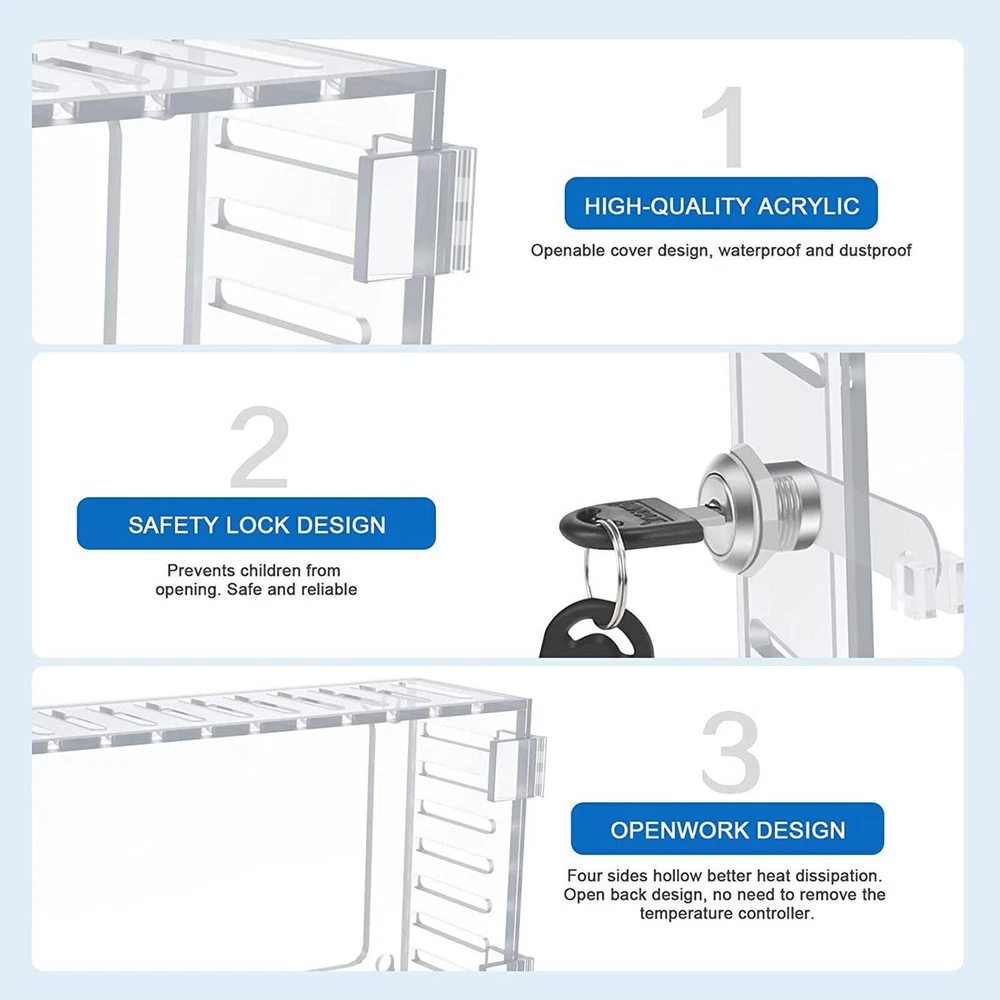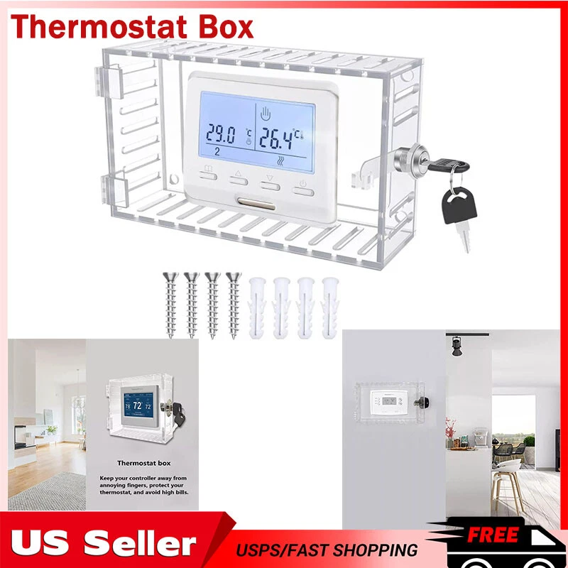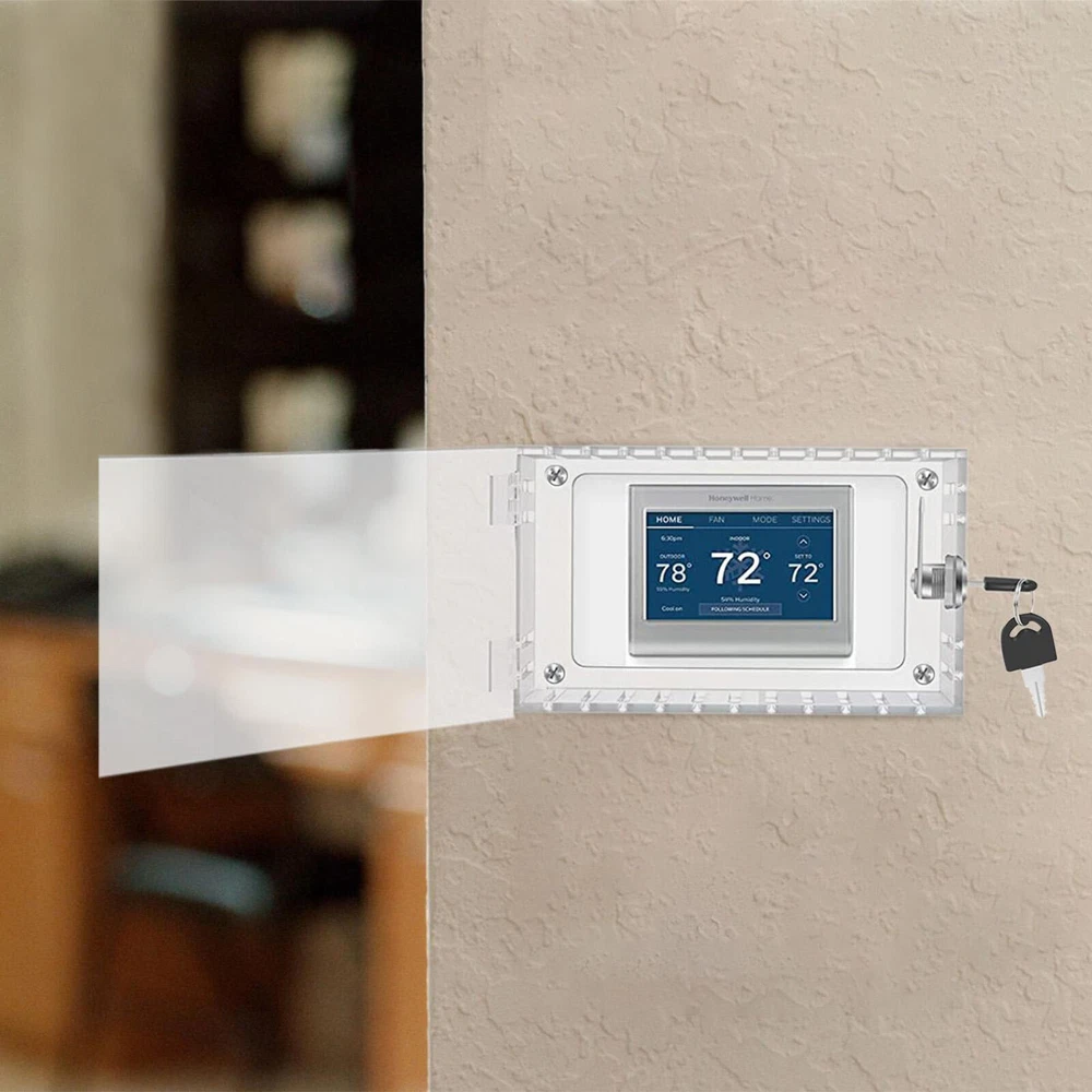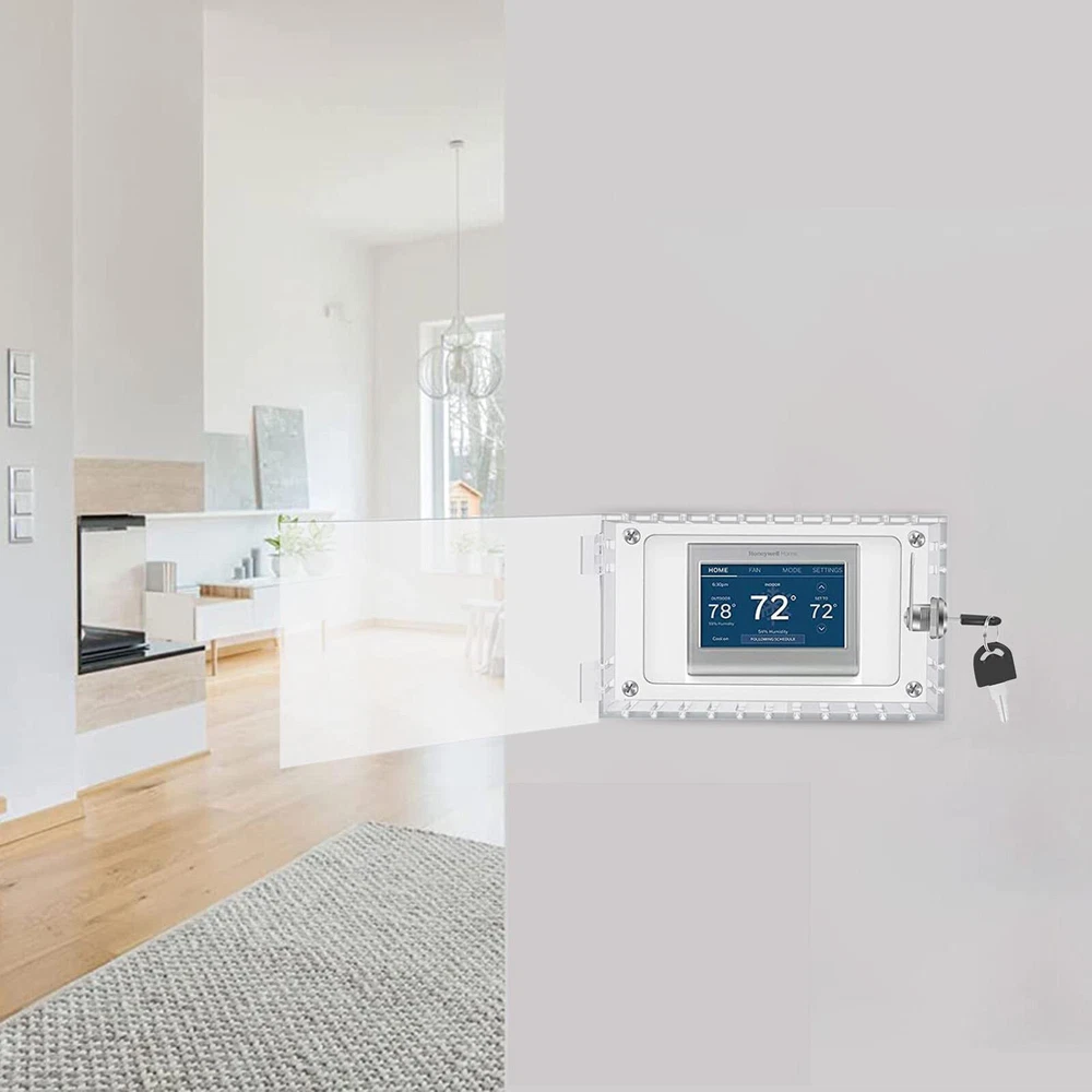 Product Description Bullet Points: For Most Thermostat Sizes: This thermostat lock box with key can fit most thermostats in the market. It has a combination lock design with up to 10000 possibilities. You can keep your thermostat safe from tampering and no longer worry about children changing the settings. Convenient to Install: This lock box covers your thermostat and can be locked with the 4 extension screws included. You can also attach glue or screws for extra firmness. It installs in minutes and protects your thermostat from unauthorized access. Visible and Reliable: Our thermostat lock box with key uses a high-quality acrylic material that is clearer and more transparent than other choices. You can see the display clearly without having to open the box. It also avoids discoloration and yellowing, making it dependable and long-lasting. Applicable Scenes: This lock box with key is designed to protect the thermostat from unauthorized access or tampering. It is suitable for houses, factories, schools, hotels, restaurants, and other places where thermostats are installed. It is widely applicable and can prolong its service life. Damage-free Installation: You can install this open thermostat guard in two ways: either by punching holes in the wall or by using adhesive tape. It will secure your thermostat and prevent wall damage. This thermostat lock box with key is a simple and effective way to secure your thermostat from children and unauthorized access. Just place it above the thermostat and lock it with the key. The box is more transparent than other models, so you can easily see the temperature and settings. It is suitable for homes, offices, factories, and other places where you need to control the thermostat. Specification: Product Name: Thermostat Lock Box Product size: (approx.) 18.5*12*5.6 cm .(7.28*4.7*2.2 inch) INSTALLATION: No need to remove the thermostat from the wall, just line up on the existing thermostat and install and finish. We have both perforated and non-perforated methods of installation to protect your walls from damage. Package List: Thermostat Lock Box * 1 Notes: Due to the lighting effects and camera angles, the color of the item and that shown in the picture might have a nuance. Due to manual measurement, there might be a tolerance in the product size.