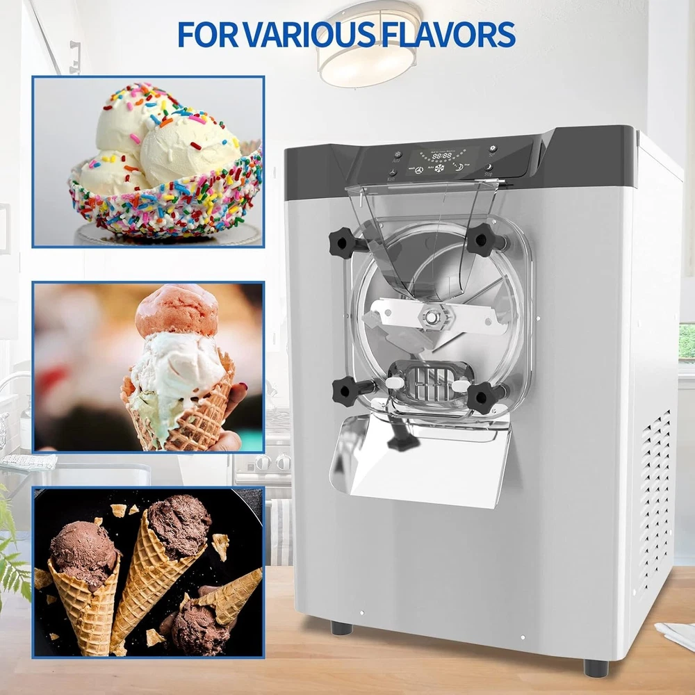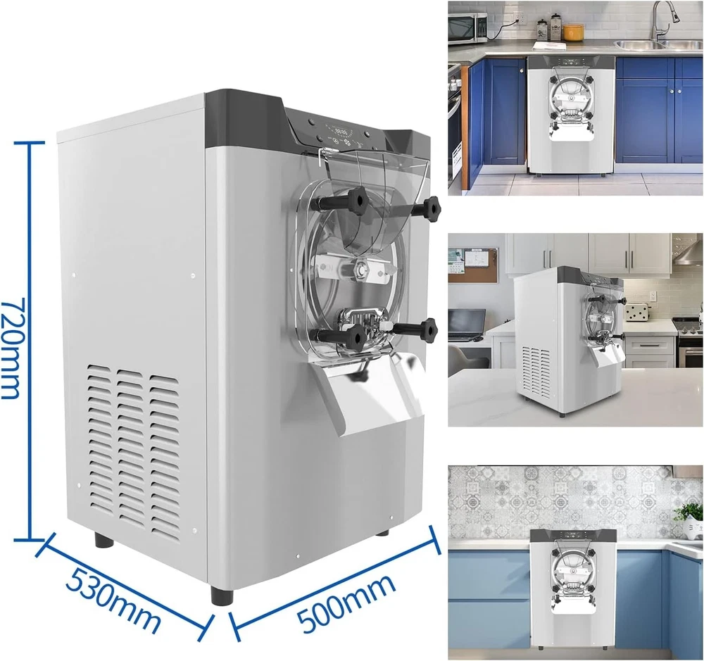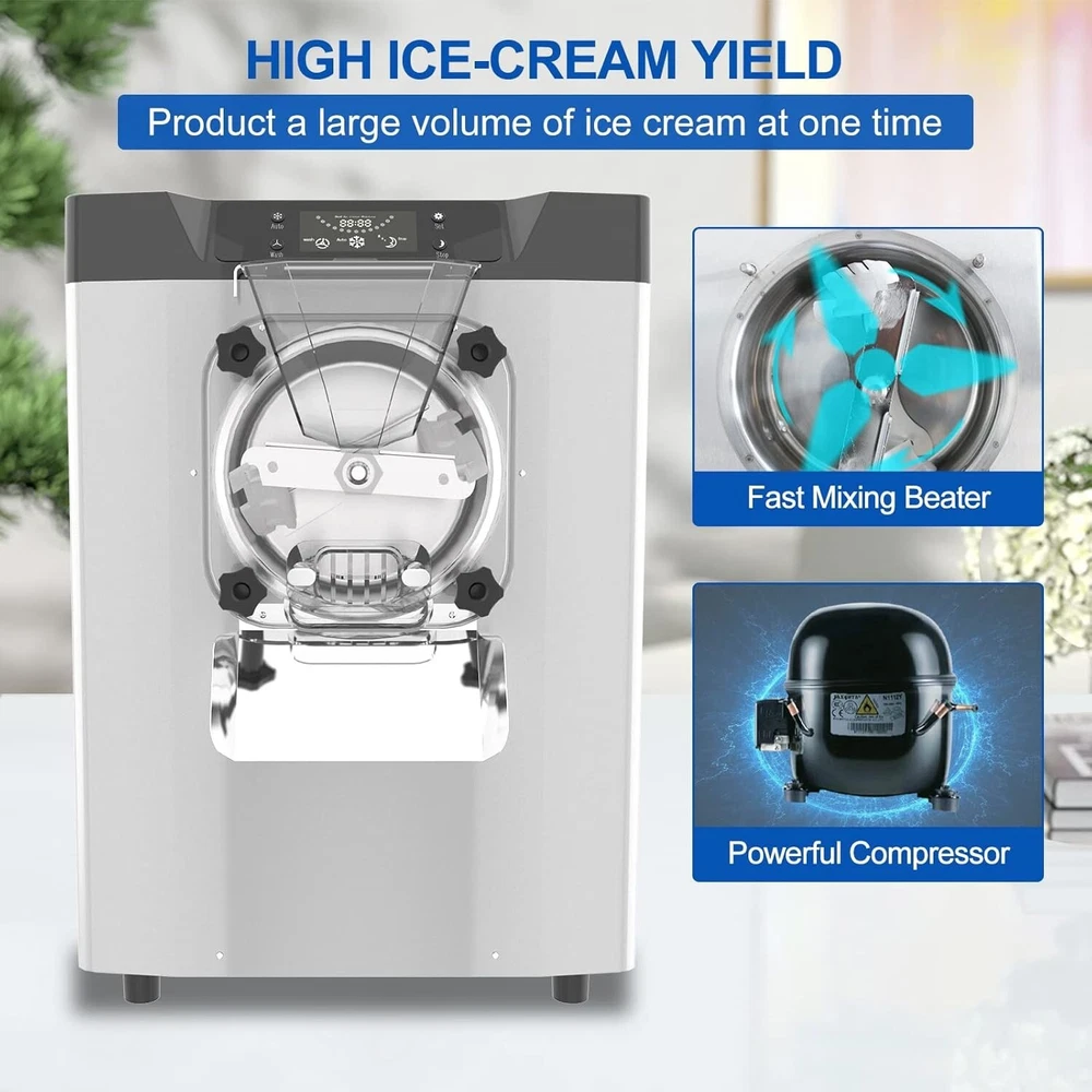 Feature: · High efficiency capacity - 110V 60HZ, power: 1450W, brand compressor. This ice cream maker features an extra-large refrigeration cylinder and fast freezing. You can expect to make 20 liters / 5.3 gallons of ice cream per hour. · Food Grade Material - The whole ice cream machine is made of high grade food grade 304 stainless steel, which is resistant to high pressure and easy to clean. It adopts high quality full copper core air compressor with fast cooling, energy saving and low noise. · Easy to Operate - This commercial smoothie maker is equipped with a control panel that makes the machine easier to operate with a clear digital temperature display. · Wide Application - This ice cream maker is ideal for commercial or home use. Widely used in bars, cafes, milk tea stores, casual food, street food, food trucks, dessert stores, restaurants, hotels, ice cream parlors, etc. · Thoughtful design - Designed with thick plastic baffles, non-slip rubber pads, high speed rotating mixer, copper condenser and large exhaust system to ensure long time use of professional ice cream machine commercial. If you encounter any problems in using the machine, please feel free to contact us and we will provide you with satisfactory solutions. Specification: Rated voltage 110V 60Hz Rated power: 1450W Carton size: 19.29 x 21.46 x 25.39 inches Package Included: 1x Commercial Gelato Hard Ice Cream Machine