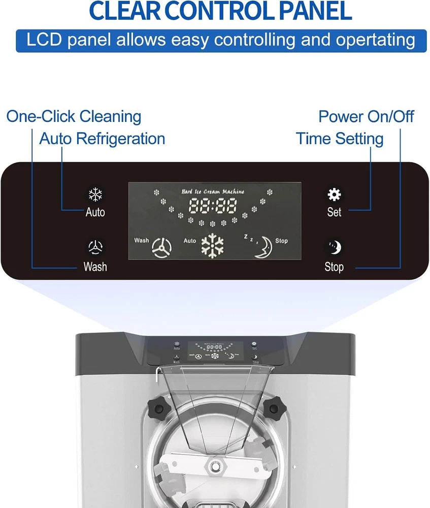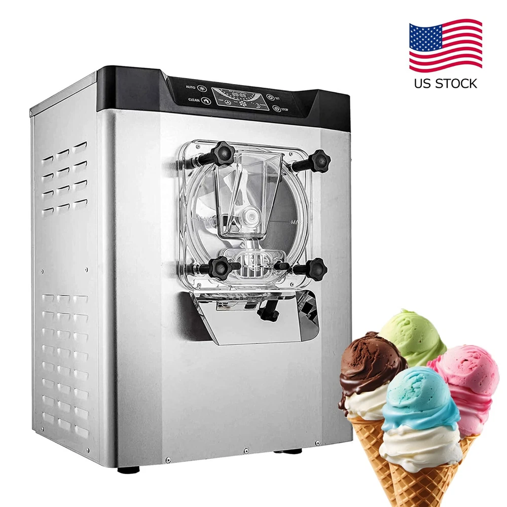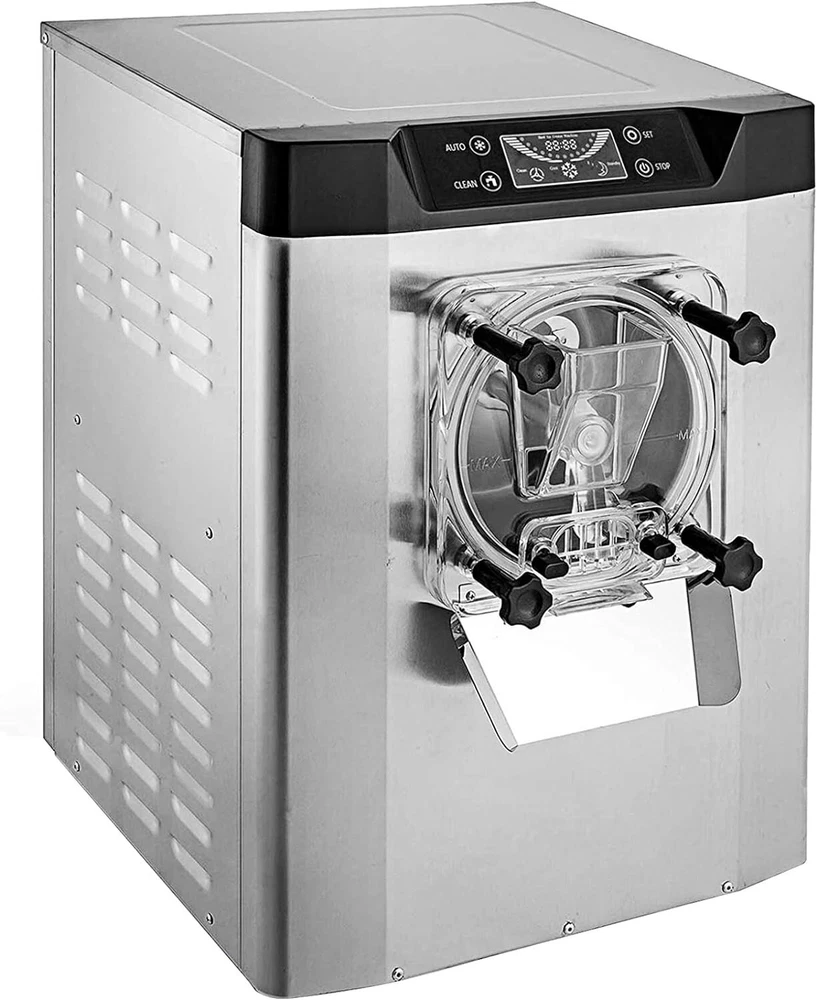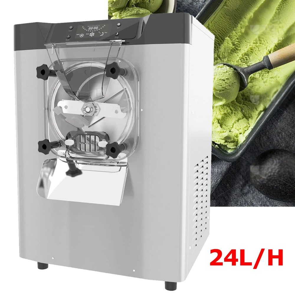 Feature: · High efficiency capacity - 110V 60HZ, power: 1450W, brand compressor. This ice cream maker features an extra-large refrigeration cylinder and fast freezing. You can expect to make 20 liters / 5.3 gallons of ice cream per hour. · Food Grade Material - The whole ice cream machine is made of high grade food grade 304 stainless steel, which is resistant to high pressure and easy to clean. It adopts high quality full copper core air compressor with fast cooling, energy saving and low noise. · Easy to Operate - This commercial smoothie maker is equipped with a control panel that makes the machine easier to operate with a clear digital temperature display. · Wide Application - This ice cream maker is ideal for commercial or home use. Widely used in bars, cafes, milk tea stores, casual food, street food, food trucks, dessert stores, restaurants, hotels, ice cream parlors, etc. · Thoughtful design - Designed with thick plastic baffles, non-slip rubber pads, high speed rotating mixer, copper condenser and large exhaust system to ensure long time use of professional ice cream machine commercial. If you encounter any problems in using the machine, please feel free to contact us and we will provide you with satisfactory solutions. Specification: Rated voltage 110V 60Hz Rated power: 1450W Carton size: 19.29 x 21.46 x 25.39 inches Package Included: 1x Commercial Gelato Hard Ice Cream Machine