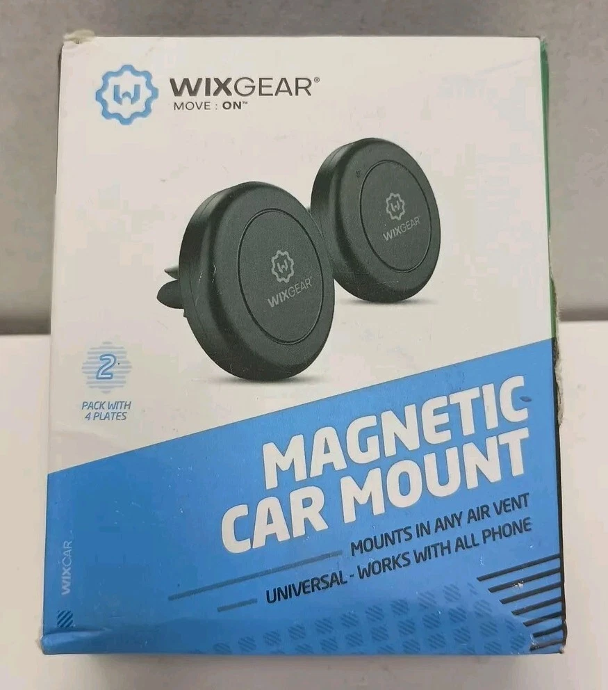 WizGear Universal Magnetic Phone Holder is a car mount/holder that allows you to easily attach your phone to your car's air vent. The pack includes two phone holders, magnetic clips, and a mount. The holders are compatible with most phone brands and have an adjustable angle feature. The mount is made of plastic and has a matte black finish. The item weighs 5 oz and has a length of 6 in, a height of 3 in, and a width of 6 in. The mounting type is magnetic and the fastening is done through a clip.
