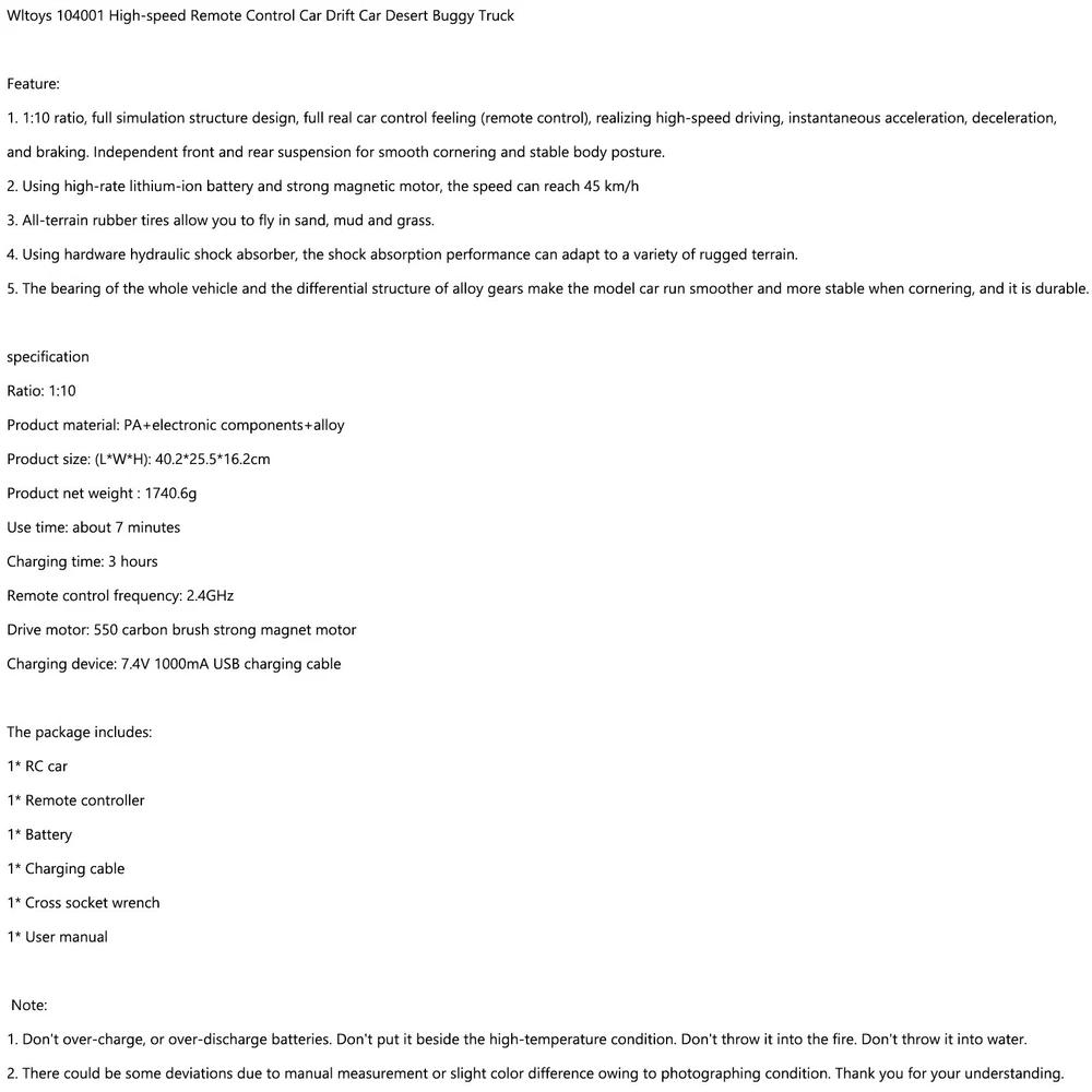 5xIEC320 C14 3 Pin Screw Mount Male Power Socket Cover 10A 250V For Boat AC-04C 12.15 USD 12.79 USD Free shipping 5% off .22 to .50 Laser'Calibrator Laser Calibration Pen Red Laser Pointer Bore Sighter 19.57 USD Free shipping 24V to 48V 3A 144W DC-DC Boost Step Up Power Converter Voltage Regulator Module 22.79 USD Free shipping Orange Pi 5 Plus Two-Layer Cluster Acrylic Shell Orangepi Protective Shell 17.79 USD Free shipping Traditional Brain Teaser Classical Metal Chinese 9 Linked Rings Puzzle Toys YU 10.79 USD Free shipping Infrared Thermal Imaging Camera IR Imager USB Type-C For Android Mobile Phone 80.87 USD Free shipping 2 Dust Cover Repair Brackets Hinge For Old School Turntable Vinyl record player 15.63 USD Free shipping SDR Receiver Switch Antenna Share Transceiver Switch Box 100W DC 160MHz US Plug 67.99 USD Free shipping 2x Distribution Block 1x0 In 2x0 GA Out Splitter Fusebox for Car Audio Marine U9 20.79 USD Free shipping 12V Interface Module EIM 630-088 EIM 630-465 For FG Wilson Engine Parts 53.79 USD Free shipping FT4XR/FT65R-USB DC Charger Cable Charger For FT4XR FT25R FT65R Battery Charger 14.05 USD 14.79 USD Free shipping 5% off 3X Gun Sight Removal Tool Nylon Dovetail Drift Punch 1911 Glock Sig Ruger Colt 9.79 USD Free shipping A Fantastic Shop Send us a message Our Store Seller Profile Feedbacks Save this seller Contact Wltoys 104001 High-speed Rc 1:10 Remote Control Car Drift Desert Buggy Truck UE Wltoys 104001 High-speed Remote Control Car Drift Car Desert Buggy Truck Feature: 1. 1:10 ratio, full simulation structure design, full real car control feeling (remote control), realizing high-speed driving, instantaneous acceleration, deceleration, and braking. Independent front and rear suspension for smooth cornering and stable body posture. 2. Using high-rate lithium-ion battery and strong magnetic motor, the speed can reach 45 km/h 3. All-terrain rubber tires allow you to fly in sand, mud and grass. 4. Using hardware hydraulic shock absorber, the shock absorption performance can adapt to a variety of rugged terrain. 5. The bearing of the whole vehicle and the differential structure of alloy gears make the model car run smoother and more stable when cornering, and it is durable. specification Ratio: 1:10 Product material: PA+electronic components+alloy Product size: (L*W*H): 40.2*25.5*16.2cm Product net weight : 1740.6g Use time: about 7 minutes Charging time: 3 hours Remote control frequency: 2.4GHz Drive motor: 550 carbon brush strong magnet motor Charging device: 7.4V 1000mA USB charging cable The package includes: 1* RC car 1* Remote controller 1* Battery 1* Charging cable 1* Cross socket wrench 1* User manual Note: 1. Don't over-charge, or over-discharge batteries. Don't put it beside the high-temperature condition. Don't throw it into the fire. Don't throw it into water. 2. There could be some deviations due to manual measurement or slight color difference owing to photographing condition. Thank you for your understanding. About US About Our Items We strive to describe all items accurately and thoroughly, with the utmost care and attention to detail. However, to ensure a mutually satisfactory transaction, we kindly ask for your assistance in thoroughly reviewing the item description and photos, and addressing any questions before placing a bid. Customer Satisfaction We stand behind our commitment with exceptional service, a 100% money-back guarantee, and a dedication to customer satisfaction. I am readily available to address any inquiries or concerns you may have, both before and after your purchase. Our aim is to ensure your shopping experience is enjoyable and that you're delighted with your purchase. Feedback Your feedback is crucial to our business's success. If you're satisfied with your purchase and the service you received, we would greatly appreciate your positive feedback, along with an overall Detailed Selling Rating (DSR) of 5. Please take a moment to leave us positive feedback. Our eBay account is set up to automatically reciprocate positive feedback once yours is received. If you're considering leaving neutral/negative feedback or opening an eBay/PayPal case, we encourage you to reach out to us immediately. We're committed to resolving any issues to the best of our ability. Shipping Parcel will be shipped using Standard shipping method. For security purposes, items will be shipped exclusively to the confirmed address on Paypal. Please ensure your Shipping address is up to date before proceeding with payment. Estimated delivery time within the United States ranges from 3 to 10 business days, depending on your location. Returns We accept returns within 60 days from the date the buyer receives the item. If the item is found to be defective upon receipt, the customer has up to 30 days from the date of receipt to request an exchange for a new item or a refund. For returns due to a change of mind, we accept items in their original selling condition. However, if the package has been opened due to a mistaken order, it does not qualify for our return policy. Please note that the buyer is responsible for covering the cost of return postage. If you encounter any issues, please reach out to us via eBay message, and we'll respond within 24 hours. Wltoys 124018 High Speed Racing RC Car 60km/h 1/12 2.4GHz Off-Road RTR Toy Gift 115.99 USD Free shipping WLtoys 144001 RTR 2.4GHz 60km/h High Speed Drift Racing Car Remote Control UE 110.87 USD Free shipping Wltoys 124017 Brushless RTR 1/12 2.4G 4WD 75km/h RC Car Metal Chassis Toy Gift 185.79 USD Free shipping WLTOYS 12427 1/12 SCALE 2.4G 4WD ELECTRIC BRUSHED CRAWLER RTR RC Toy CAR GIFT 109.87 USD Free shipping Wltoys 124019 High Speed Racing 60km/H 1/12 2.4GHz Drift Car RTR 4WD Gifts New 134.87 USD Free shipping
