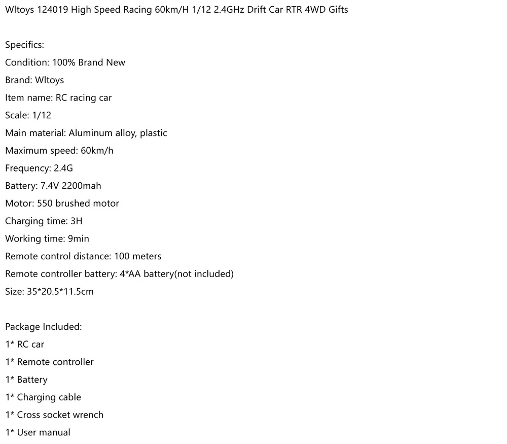 1/2" Brass Swing Check Valve NPT Threaded Plumbing Fitting 12.99 USD Free shipping Fuel Shut Off Solenoid For Ford New Holland Tractors 3930 4130 4630 5030 4830 16.58 USD Free shipping New 1080P Wifi Car Hidden DVR Front Dash Cam Camera Video Recorder G-Sensor 37.41 USD Free shipping 1Pcs USB Programming Cable For Vertex VX-231 VX-351 VX-451 VX-354 YU 13.87 USD Free shipping Wireless 8Led Reverse Parking Rearview Camera For Toyota Land Cruiser 70/100/200 24.99 USD Free shipping DZ-260C Chamber Vacuum Sealing Packing Machine Commercial Vacuum Sealer 110V USA 338.87 USD Free shipping Ignition Switch RC461-53962 For Kubota SVL75 SVL75C SVL95 KX018 KX057 KX080 KX16 37.79 USD Free shipping 3 Pair Archery Fur Arrow Rest Leather Traditional Recurve Bow Longbow Hunting U9 11.41 USD Free shipping ESP32-S3 Development Board 4-inch IPS Touch Screen LVGL 86 Box Switch Control 45.99 USD Free shipping 2PCS SCI R3-11 Panel Mount Chassis Fuse Holder For 5x20mm Glass Fuses 10A 250V 9.79 USD Free shipping Car Audio 100 A Inline Mini ANL Fuse Holder Block 4/8 GA IN 4/8 GA OUT with Fuse 12.86 USD Free shipping Tait TP8100/TP9300 Fast Rapid Dock Charger for Tait TP8100 TP9300 Radio US Plug 32.79 USD Free shipping A Fantastic Shop Send us a message Our Store Seller Profile Feedbacks Save this seller Contact Wltoys 124019 High Speed Racing 60km/H 1/12 2.4GHz Drift Car RTR 4WD Gifts New Wltoys 124019 High Speed Racing 60km/H 1/12 2.4GHz Drift Car RTR 4WD Gifts Feature: 1. High-Speed Performance: Built-in super strong, powerful, and high efficiency strong magnetic motor makes the electric energy converted into power maximally and the running speed is up to 60km/h. 2. 2.4G Remote Control Frequency: 2.4GHz Radio System with anti-jamming capability allows us to race at the same time on the same track. The control distance is up to 100 meters. 3. Tough Parts: The base is made of high-strength aluminum alloy with strong stability. 4. Zinc alloy gear, with strong wear resistance. 5. Aluminum alloy shock tower to achieve strong stability and long service life. 6. Conquer Various Terrains: Adopt hardware hydraulic shock absorber, shock absorber performance can adapt to multi-clock terrain. 7. The racing car can provide strong power torque significantly make the car easy to complete difficult moves. 8. It is easy to adapt to rough terrains such as beach, snow, grass, mountain road, and rock road. Specifics: Condition: 100% Brand New Brand: Wltoys Item name: RC racing car Scale: 1/12 Main material: Aluminum alloy, plastic Maximum speed: 60km/h Frequency: 2.4G Battery: 7.4V 2200mah Motor: 550 brushed motor Charging time: 3H Working time: 9min Remote control distance: 100 meters Remote controller battery: 4*AA battery(not included) Size: 35*20.5*11.5cm Package Included: 1* RC car 1* Remote controller 1* Battery 1* Charging cable 1* Cross socket wrench 1* User manual Note: 1. Don't over-charge, or over-discharge batteries. Don't put it beside the high-temperature condition. Don't throw it into the fire. Don't throw it into water. 2. There could be some deviations due to manual measurement or slight color difference owing to photographing condition. Thank you for your understanding. About US About Our Items We strive to describe all items accurately and thoroughly, with the utmost care and attention to detail. However, to ensure a mutually satisfactory transaction, we kindly ask for your assistance in thoroughly reviewing the item description and photos, and addressing any questions before placing a bid. Customer Satisfaction We stand behind our commitment with exceptional service, a 100% money-back guarantee, and a dedication to customer satisfaction. I am readily available to address any inquiries or concerns you may have, both before and after your purchase. Our aim is to ensure your shopping experience is enjoyable and that you're delighted with your purchase. Feedback Your feedback is crucial to our business's success. If you're satisfied with your purchase and the service you received, we would greatly appreciate your positive feedback, along with an overall Detailed Selling Rating (DSR) of 5. Please take a moment to leave us positive feedback. Our eBay account is set up to automatically reciprocate positive feedback once yours is received. If you're considering leaving neutral/negative feedback or opening an eBay/PayPal case, we encourage you to reach out to us immediately. We're committed to resolving any issues to the best of our ability. Shipping Parcel will be shipped using Standard shipping method. For security purposes, items will be shipped exclusively to the confirmed address on Paypal. Please ensure your Shipping address is up to date before proceeding with payment. Estimated delivery time within the United States ranges from 3 to 10 business days, depending on your location. Returns We accept returns within 60 days from the date the buyer receives the item. If the item is found to be defective upon receipt, the customer has up to 30 days from the date of receipt to request an exchange for a new item or a refund. For returns due to a change of mind, we accept items in their original selling condition. However, if the package has been opened due to a mistaken order, it does not qualify for our return policy. Please note that the buyer is responsible for covering the cost of return postage. If you encounter any issues, please reach out to us via eBay message, and we'll respond within 24 hours. Wltoys 124018 High Speed Racing RC Car 60km/h 1/12 2.4GHz Off-Road RTR Toy Gift 115.99 USD Free shipping WLtoys 144001 RTR 2.4GHz 60km/h High Speed Drift Racing Car Remote Control UE 110.87 USD Free shipping Wltoys 124017 Brushless RTR 1/12 2.4G 4WD 75km/h RC Car Metal Chassis Toy Gift 185.79 USD Free shipping Wltoys 104001 High-speed Rc 1:10 Remote Control Car Drift Desert Buggy Truck UE 154.87 USD Free shipping WLTOYS 12427 1/12 SCALE 2.4G 4WD ELECTRIC BRUSHED CRAWLER RTR RC Toy CAR GIFT 109.87 USD Free shipping