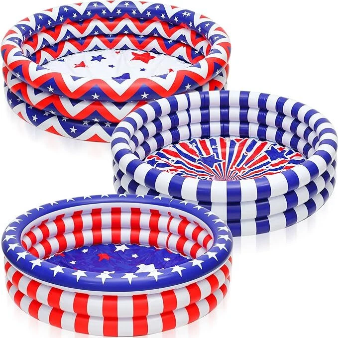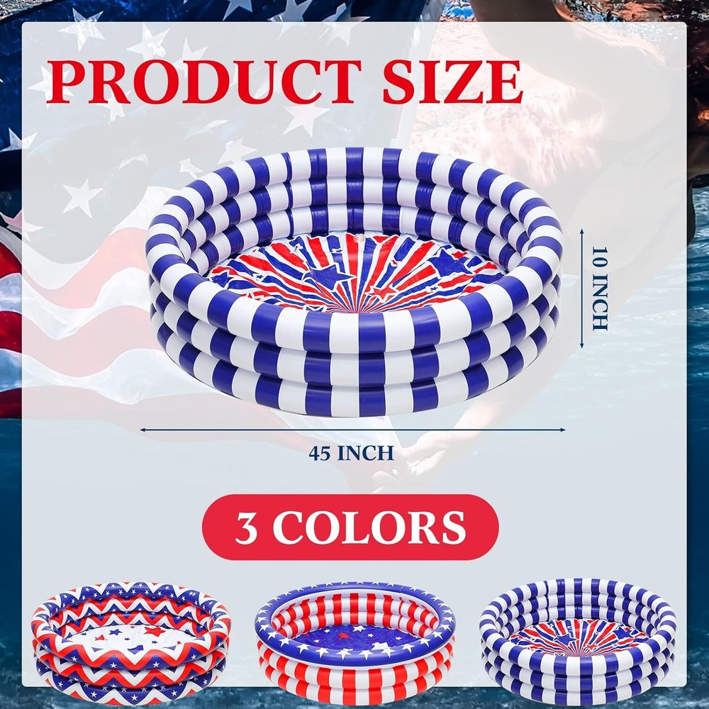 Woanger 3 Pcs Inflatable Kiddie Pools 45 x 10'' Kids Heavy Duty Inflatable Pool, Red Blue White American Flag Swimming Pool 3 Rings Blow up Water Pool Pit for Baby Toddler Summer Indoor Outdoor Party Item Description About this item Independence Day Kiddie Pool: the kiddie pool is designed with classic patriotic elements, such as stars, stripes, and colors like red, white and blue, lovely and eye catching, and can attract your friend and guests' attention Appropriate Size to Apply: the size of the baby swimming pool is about 45 x 10 inches, the size is suitable for children to apply, and Mom or Dad can company their children at the same time, please check the size to avoid misunderstanding, and it is not a life saving device and requires a guardian Stand for Long Term Usage: the small swimming pool is mainly made of quality vinyl, safe and reliable, long lasting and sturdy, the package also comes with repair patches for holes or leaks caused by accidental punctures or tears, providing you with a pleasant experience Bring You a Cool Summer: the inflatable pools will bring more fun to children in summer time, and it's a nice addition for summer backyard play; Please be careful to check under and around the pool for any pointed objects or debris that could cause stab wounds Easy to Apply: the mini pool is simple to use; It can be quickly inflated, and placed at the place you like; After use, it can be easily disassembled and stored without taking up too much space › See more product details Payment We accept payment only through PAYPAL Shipping We ship products worldwide through standard express courier service, it will reach within 7 to 10 days to abroad buyers, we ship the product after recieved clear payment and give full information about shipment to the buyer Return We accept product return within 7 to 21 days from delivery date but product should be in original position and not in damaged condition,the return shipping charges will be buyer responsibility