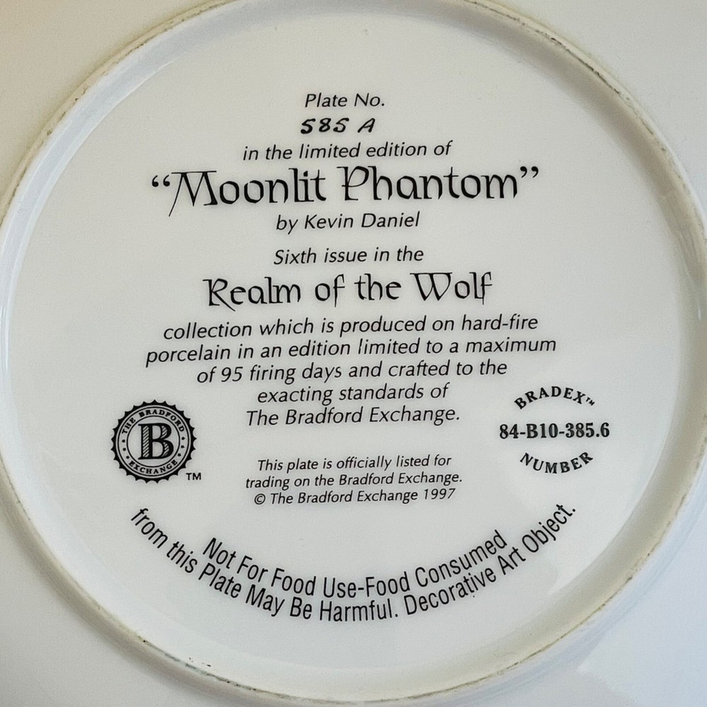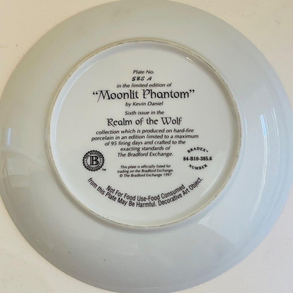 Vintage Wolf Plate by Kevin Daniel from the Realm of the Wolf Collection - Bradford Exchange 1997. Plate number 585A. Just over 8" wide. This plate is in excellent condition with no cracks or chips. I have several wolf plates available. I am happy to combine shipping. Shipping weight is just under 2 pounds from Florida