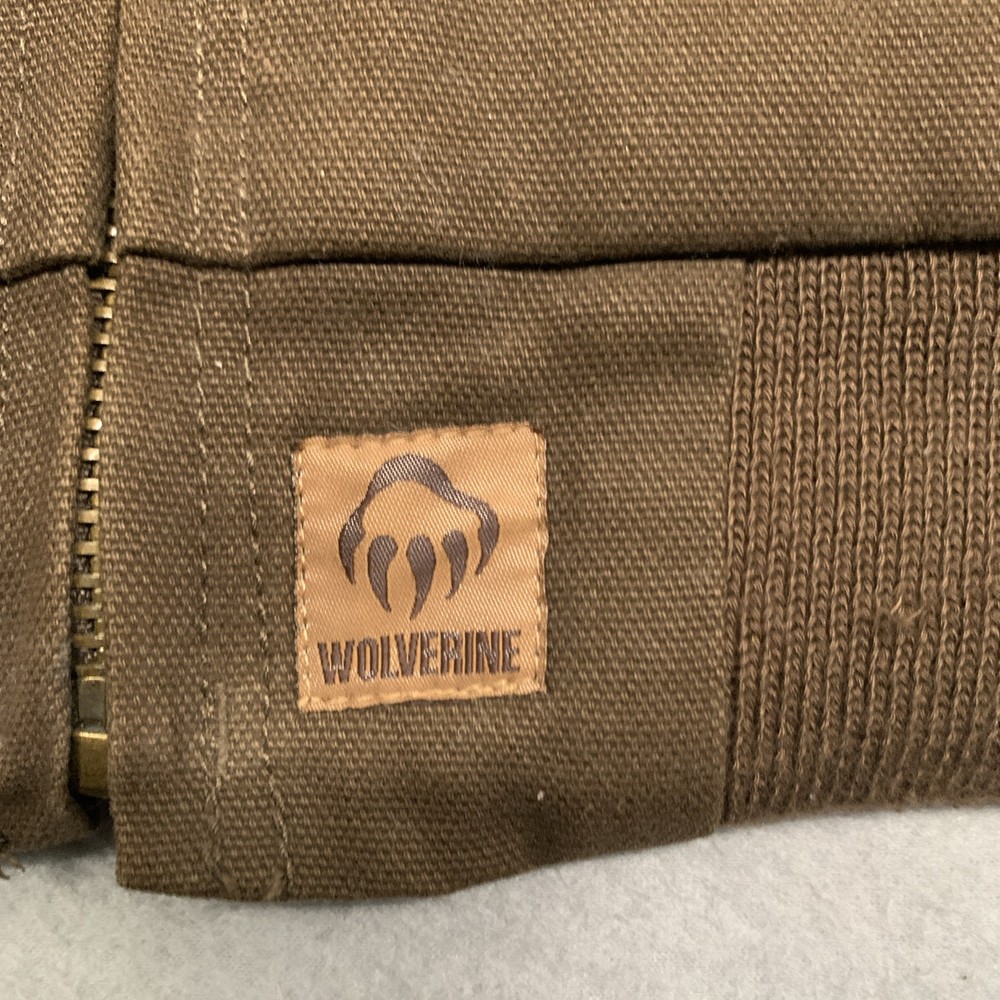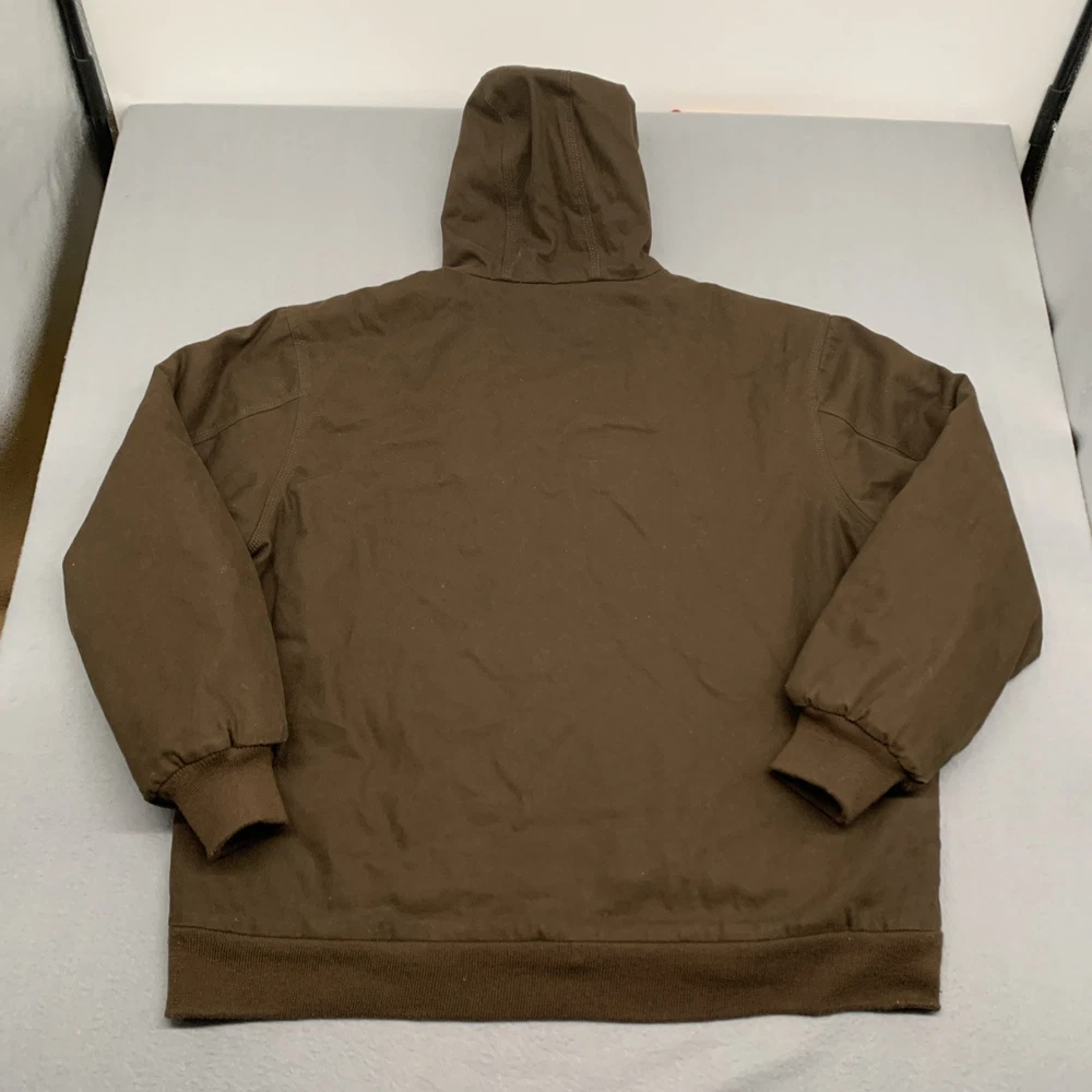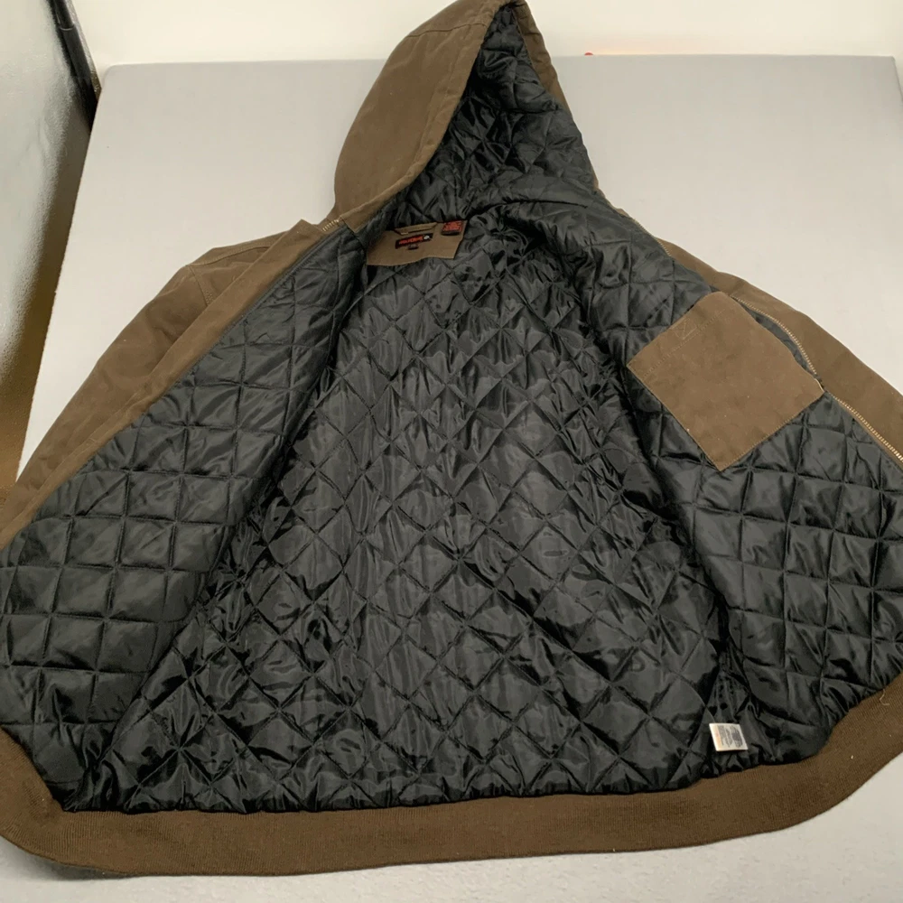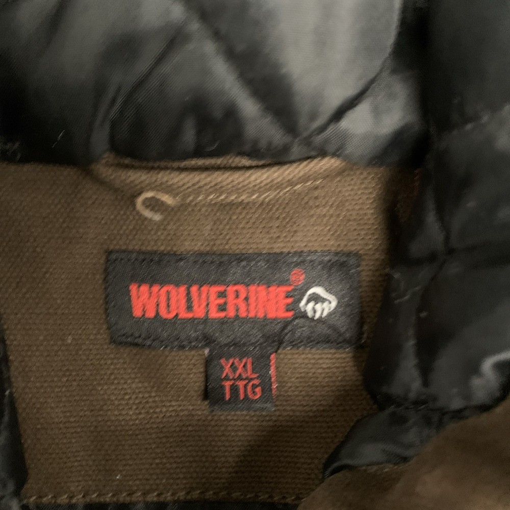 The Wolverine Work Jacket in XXL is a heavy, quilt-lined jacket with a hood and full zip closure, designed for durability and warmth. Made of cotton with a polyester lining, this mid-length jacket is suitable for various occasions such as workwear, casual outings, and outdoor activities like hiking or hunting. It features multiple pockets for convenience and has a solid brown color with accents like zippers and logos. Machine washable and sized for a chest of 58 inches, this jacket combines functionality with a rugged style that is perfect for the fall and winter season.