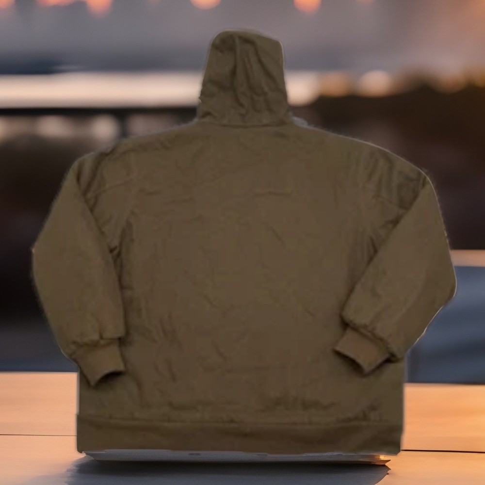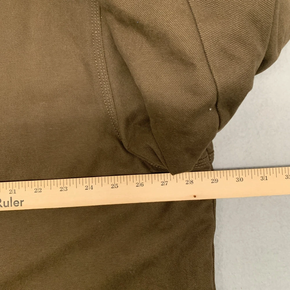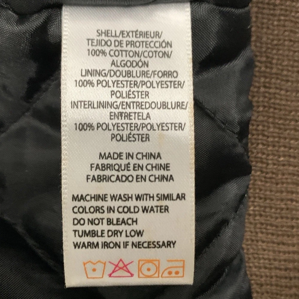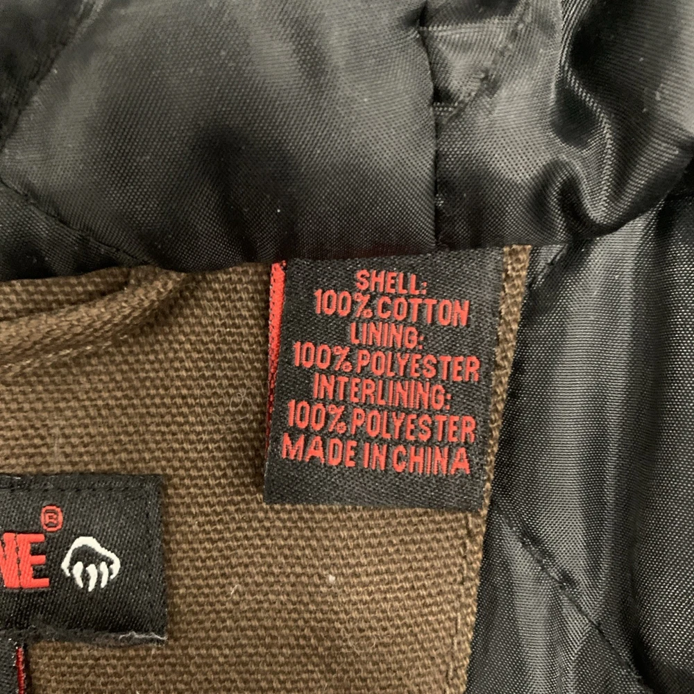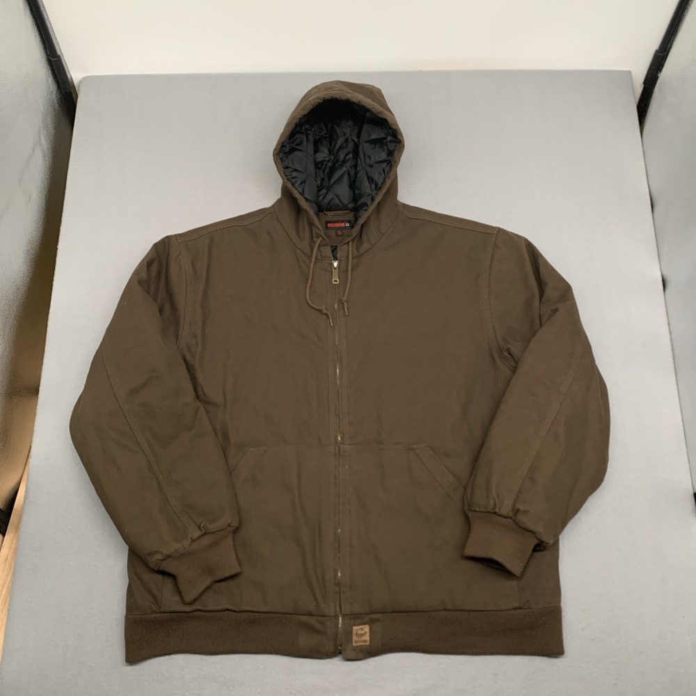 The Wolverine Work Jacket in XXL is a heavy, quilt-lined jacket with a hood and full zip closure, designed for durability and warmth. Made of cotton with a polyester lining, this mid-length jacket is suitable for various occasions such as workwear, casual outings, and outdoor activities like hiking or hunting. It features multiple pockets for convenience and has a solid brown color with accents like zippers and logos. Machine washable and sized for a chest of 58 inches, this jacket combines functionality with a rugged style that is perfect for the fall and winter season.