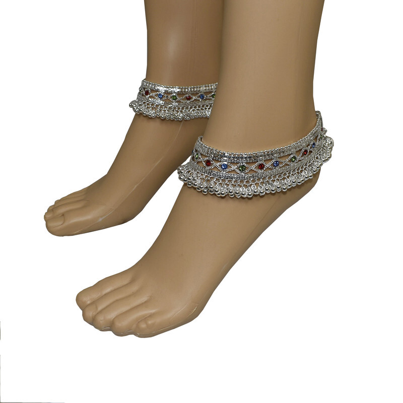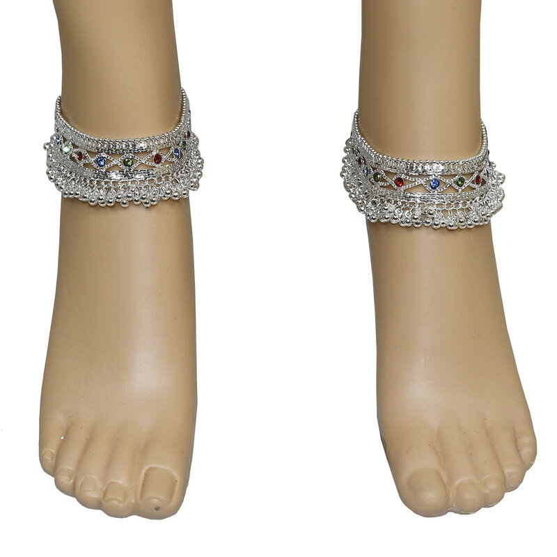 Women Ankle Anklets Payal Indian Bracelets Chain Pair Foot Jewellery Sale For:- 1 Pair Size:- Length:--25cm x Width:-2.5cm (Approx) Material:- Metal Color:- Silver&Multicolor Closure:- Screw Type:- Anklets Main Stone:- Artificial Stones & Bell About This Item New Traditional Style Anklet For Women And Girls. High Quality Silver Plating,Long Lasting,Handcrafted,Embellished With Metal Bell Charm Chain Tassels. Ethnic Significance:- Brides Wear It To Draw Attention To And Decorate Their Feet Bells Or Chimes Make A Soft Sound When The Bride Walks Traditionally Payals Are Worn In Both Feet. Style Tip:- Perfect For Spring And Summer Wear.Compliments Most Outfits.Casual Chic Everyday Wear. Perfect traditional look. Any Ethnic Outfits Like.Saree,Lehenga,Gowns,Bridal Wear,Party,Festival,Any Special Occasion,Dance Or As Fashion Novelty Costume Accessories. Ideal For:- Christmas,Thanks Giving,New Year,Valentine,Birthday,Anniversary Or Any Occasion,Gift For Someone You Love Jewellery Care:- Can Be Used In Water But Dry Completely Before Storing. Note:-Buyers Will Be Responsible For Pay Their Country's Custom Duties Charge, Import Charges And Other Charges (If Applicable). Note - USA Buyers Do Not Pay any Extra Charge At The Time of Delivery. Note - USA Buyers Do Not Pay any Extra Charge At The Time of Delivery.