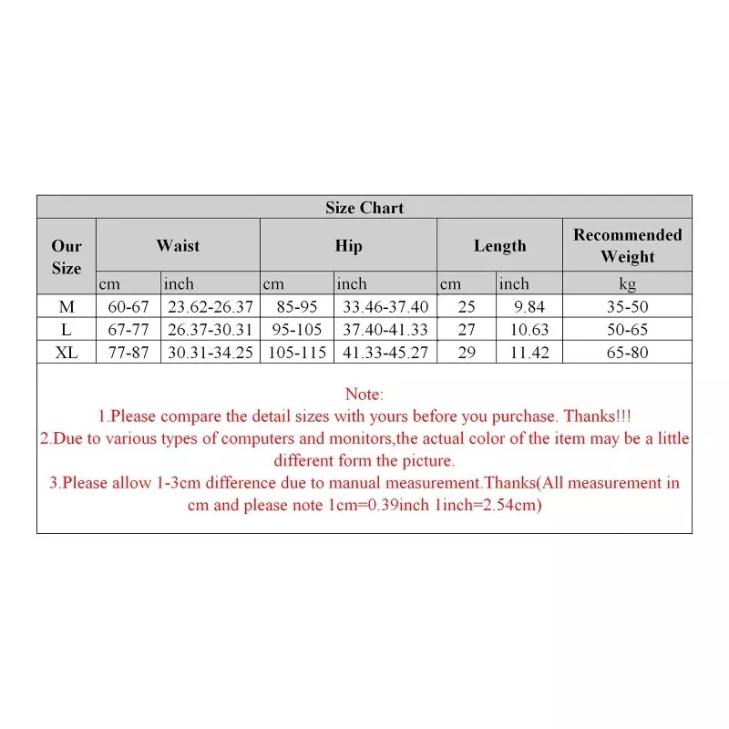 Description: Features: and high high nylon materials, smooth, breathable and comfortable, soft and easy to wash. waisted, elastic waistband, hollow out floral lace, seamless scalloped solid color, cotton crotch. Good hygroscopicity and elasticity, good for daily wear. You can wear anything from jeans to dress. It is also amazing choice for your girlfriend or wife for birthday's, Christmas, anniversary and so on. Versatile Occasions Great for Wedding Night, Anniversary, Bedroom, Bathroom or every night. 1 underwear only, other accessories in the picture are not included! Specification: Nylon Optional Color: Black, Red, Wine Red Size: for M/L/XL(Chinese Size,follow the size chart to please) Size:M Waist:60cm-67cm(23.62inch-26.37inch) Hip:85cm-95cm(33.46inch-37.40inch) Length:25cm(9.84inch) Recommended Weight:35kg-50kg Size:L Waist:67cm-77cm(26.37inch-30.31inch) Hip:95cm-105cm(37.40inch-41.33inch) Length:27cm(10.62inch) Recommended Weight:50kg-65kg Size:XL Waist:77cm-87cm(30.31inch-34.25inch) Hip:105cm-115cm(41.33inch-45.27inch) Length:29cm(11.41inch) Recommended Weight:65kg-80kg Quantity: 1 pc Warm prompt: 1.Asian people size is 1 or 2 sizes smaller than European and American. 2.Please note that low temperature washed,do not and place under the blazing for sun for quite a long for time. 3.As different measuring methods,it will occur 1-3 for cm deviation about the items,please ensure that it is okay for you before ordering. 4.Because of different monitors and lamplight,the picture may not reflect the actual color of the item,really thank you for your kind understanding! Package includes: 1 x Underwear(without retail package)