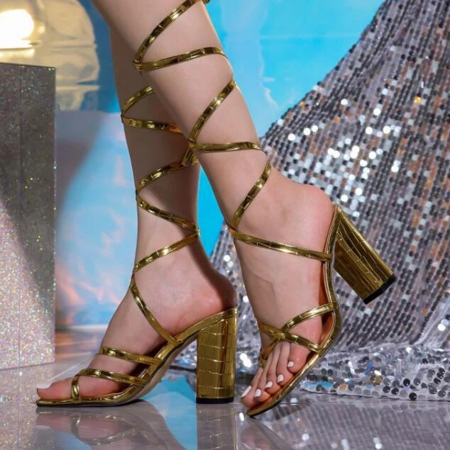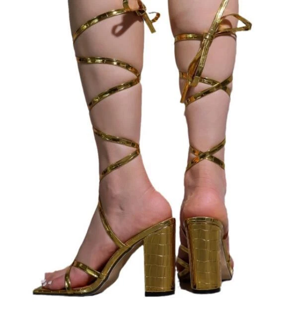Womens 2024 Fashion Gold Open Toe Lace Up Block Heel Gladiator Sandal Shoes