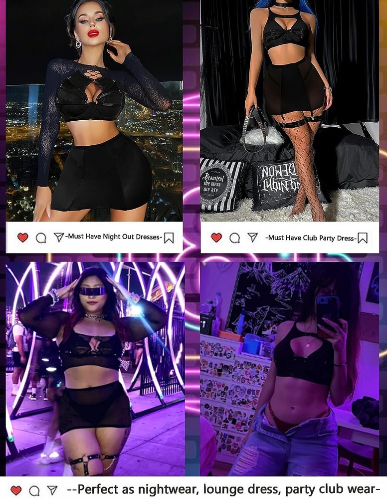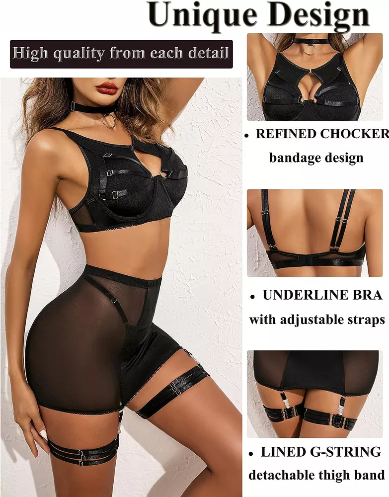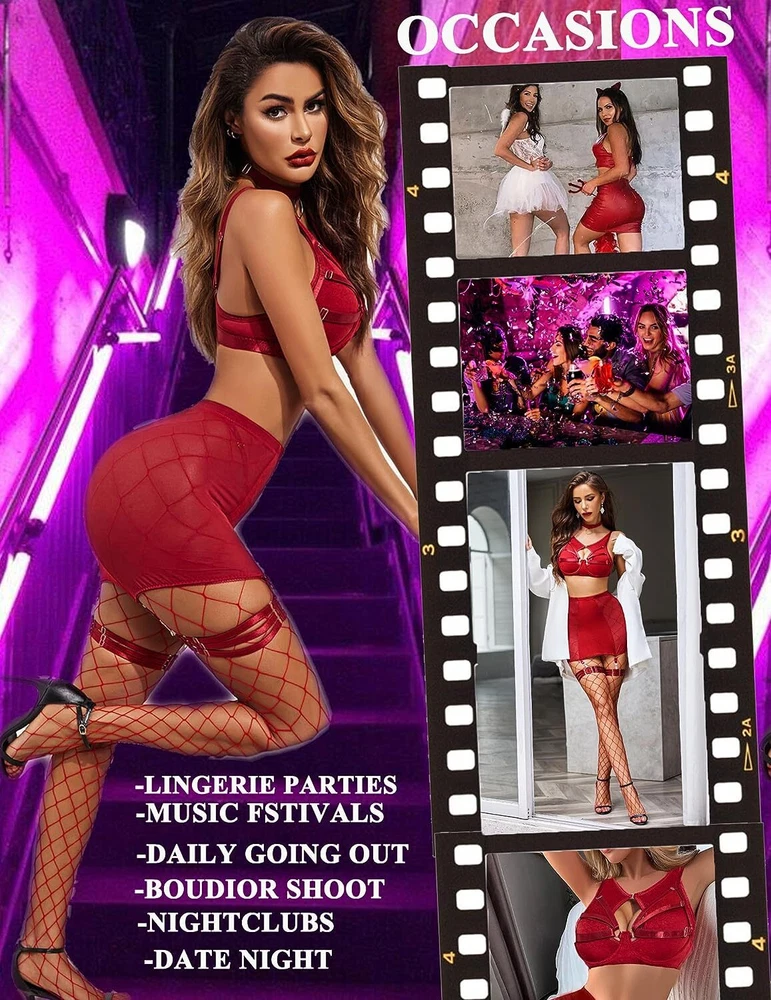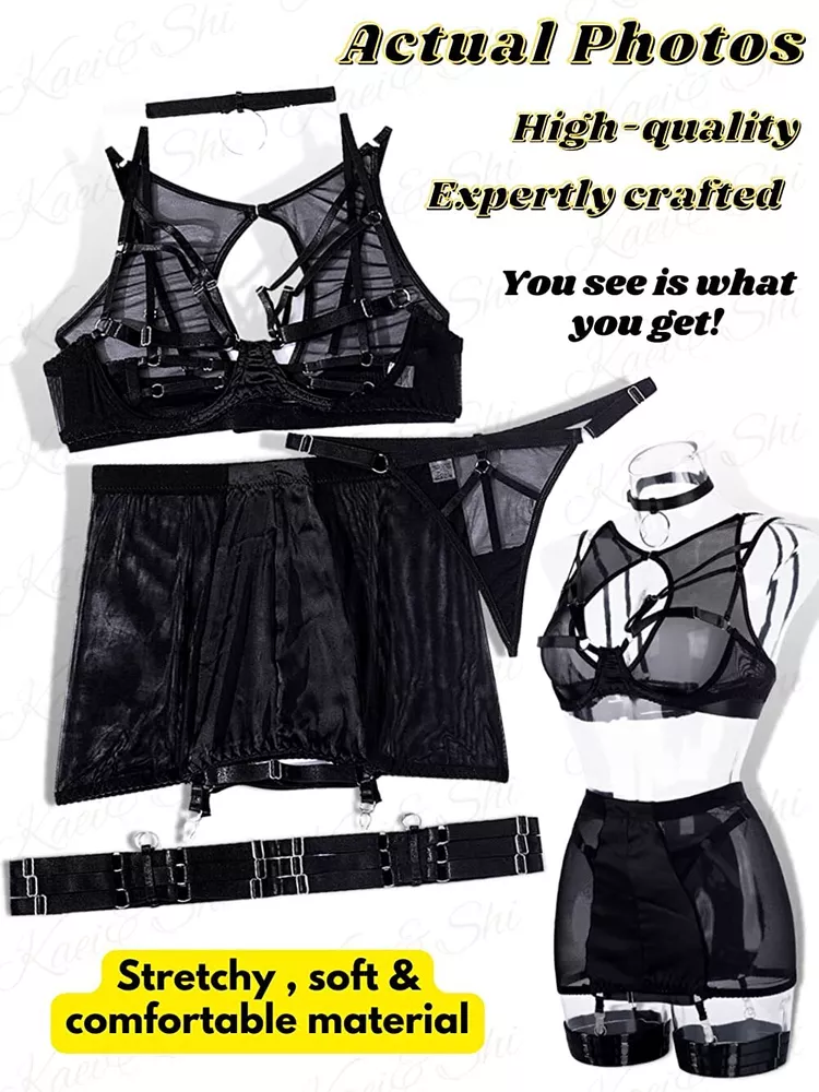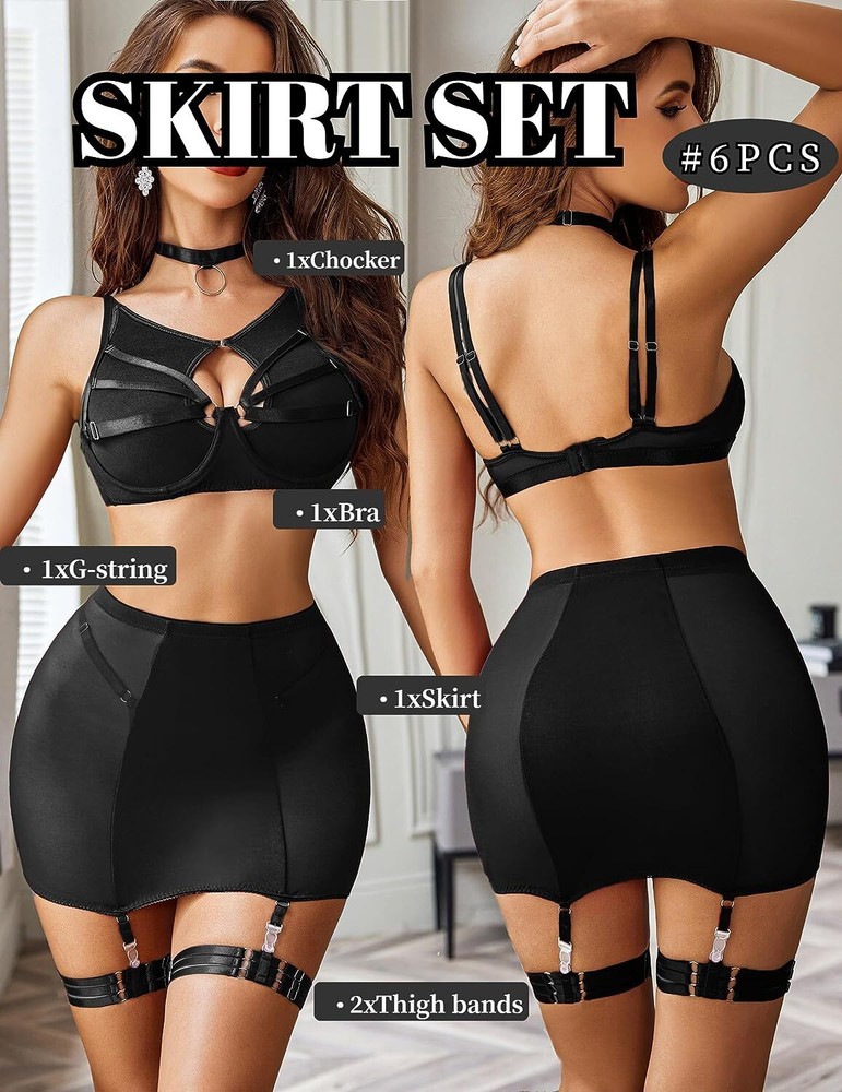 89% Polyester, 11% Spandex Imported Snap closure Hand Wash Only đăElasticity Mesh Fabrică sexy chemise is made of sof t sheer mesh fabric which patchworks premium smooth ployester knit , pro-skin and comfortable, dirt resistant, breathable, and the fabric is stretchy enough to shape your curves. đăUnique DesignăThe top consists of sheer mesh cutout tank and bra with wire, hook & eye back closure and adjustable straps make it easy for wearing. High waisted high stretchy skirt and lined g-string makes you more comfy and charming. Especially all straps are adjustable, detachable thigh band give you more option. đăCharming StyleăThis lingerie bodysuit is perfect as nightwear, daily wear, lounge dress, party club wear, sexy outfit, bra sets for women, also can be an underwear sets under coat or jacket. đăMultiple OccasionsăPerfect to wear it at home/bedroom, lingerie party, wedding night, honeymoon, anniversary, Valentine's Day, boudoir shoot, street phytography, bachelorette party, , cosplay or a special night. Put on ladies lingerie to heat up your partner! đăPackage Contentsă 6PCS womens lingerie set includes: 1xbra, 1xskirt,1xO-ring chocker, 1xG-string, 2x detachable thigh bands. Find your perfect size and having a good night with your lover/your husband with lingerie sets!