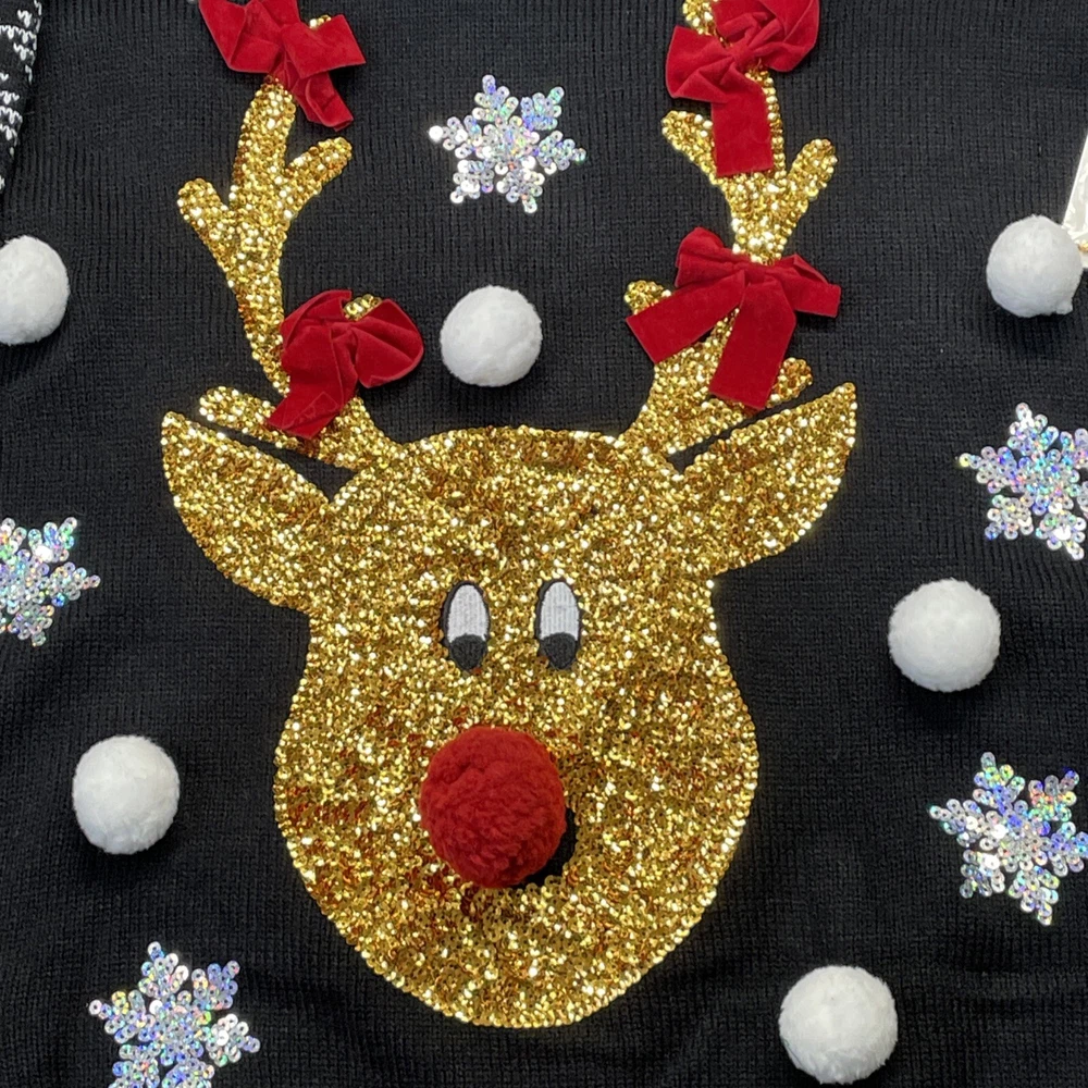 Womens Black & Gold Red Nose Reindeer Sequin Holiday Christmas Sweater 1X Item listed Mew with Tags Measurements are as follows Chest 24” Length 29” Long sleeve Will ship USPS within 24 hours safely and efficiently