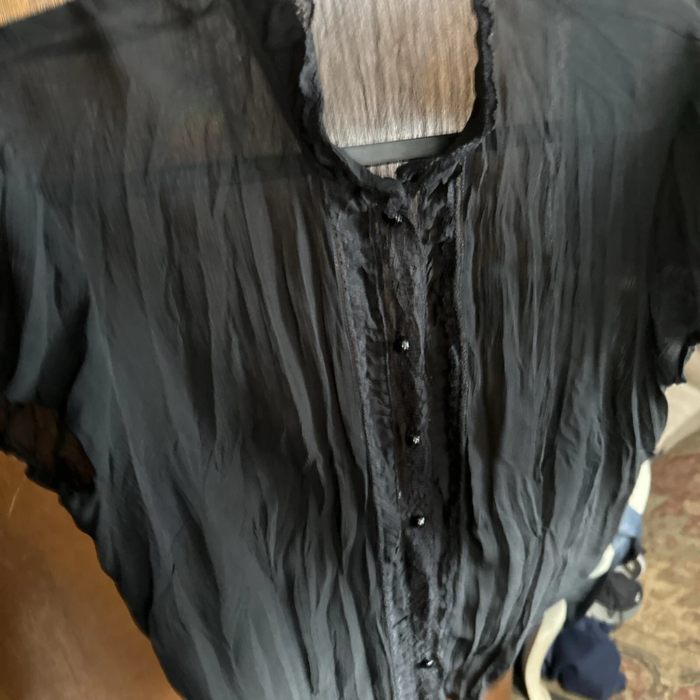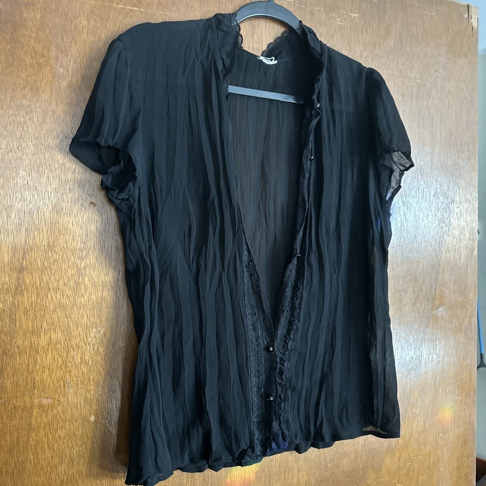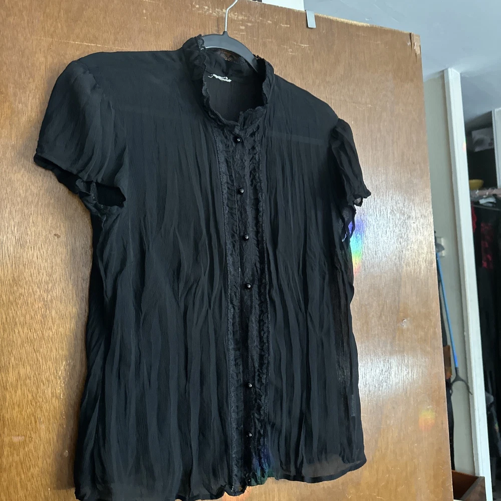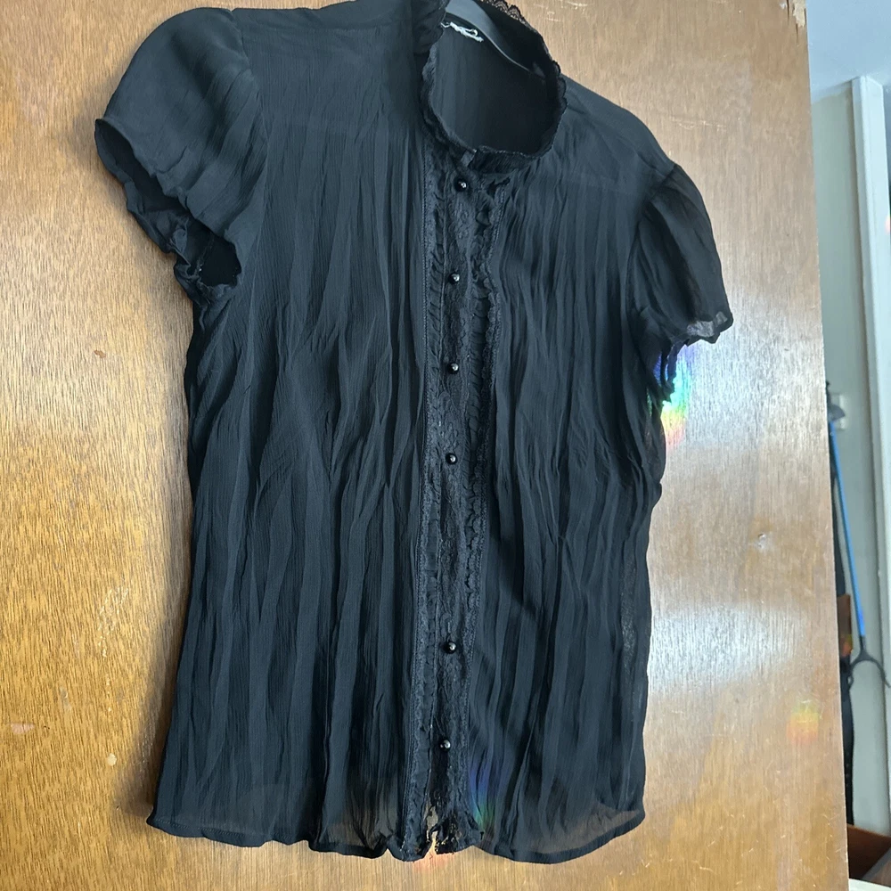 Missing third button from bottom, this has no tags they have been cut out. It is sheer and has a cap sleeve this is as is, no returns. Please see pictures and it reminds me of steampunk in a way. Elevate your wardrobe with this stunning Women's Black Polyester Casual Stretch Slim Sheer Lace Openwork Size M Blouse. The blouse boasts a collared neckline, cap sleeves, and a pullover closure, making it perfect for a variety of occasions including travel, casual wear, formal events, workwear, and business meetings. The blouse is made of lightweight and stretchy polyester material with a lace fabric type and features pleated, lace, openwork, and sheer accents, adding a touch of elegance and edge to your outfit. This blouse is a versatile addition to any wardrobe, with a classic and timeless style that can be dressed up or down. It is easy to care for, collarless, non-iron, tagless, unlined, and open. This blouse is perfect for the fall and spring seasons and is available in size M. Add this Women's Black Polyester Casual Stretch Slim Sheer Lace Openwork Size M Blouse to your collection today and step out in style!