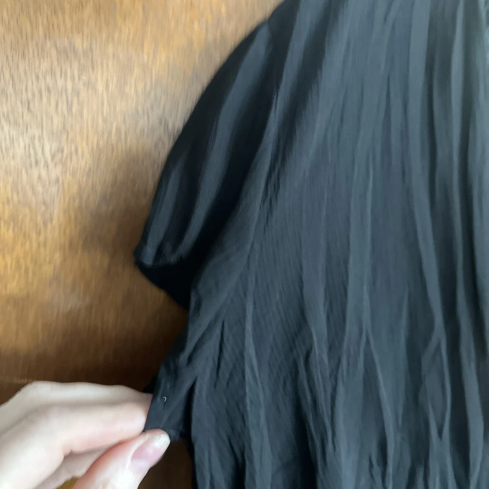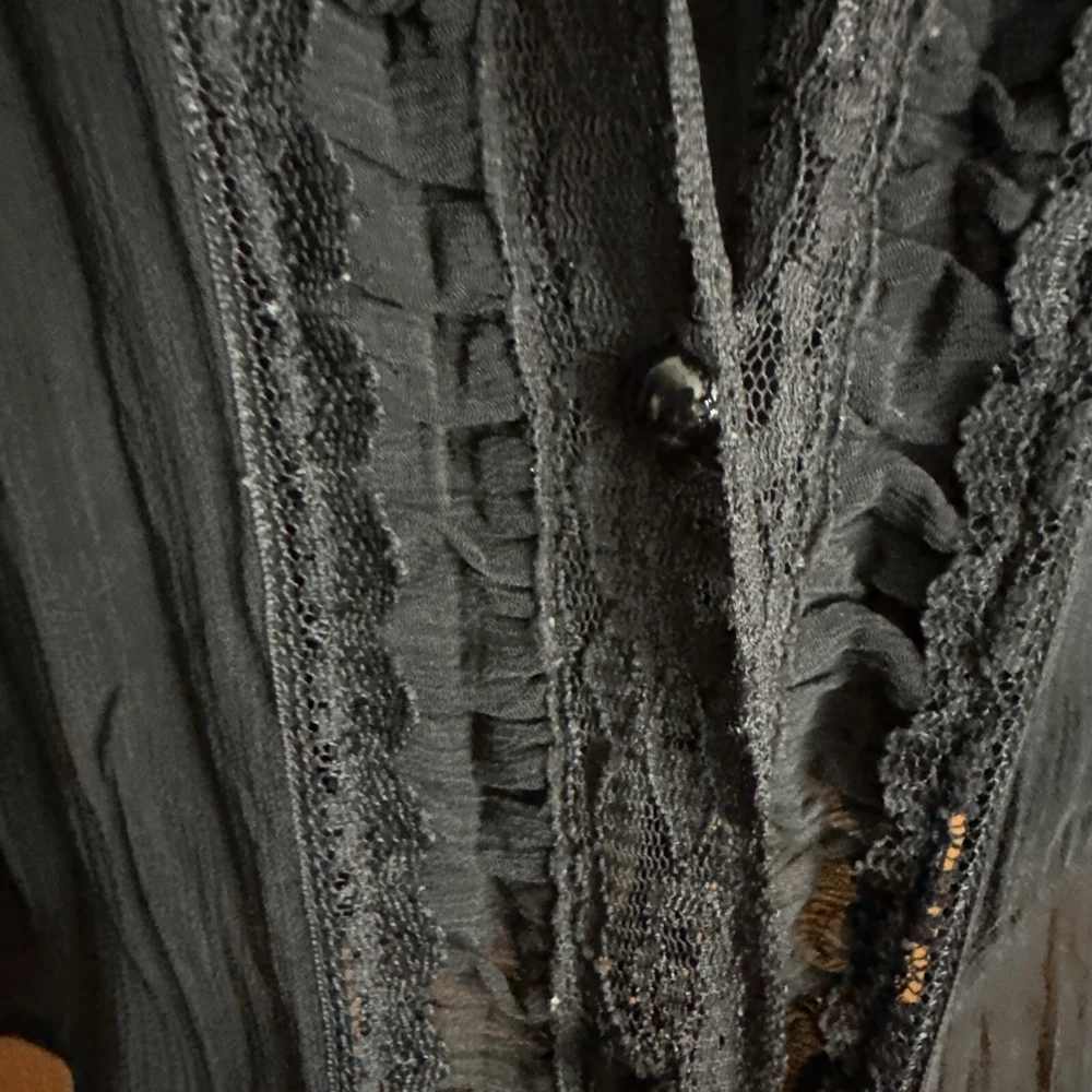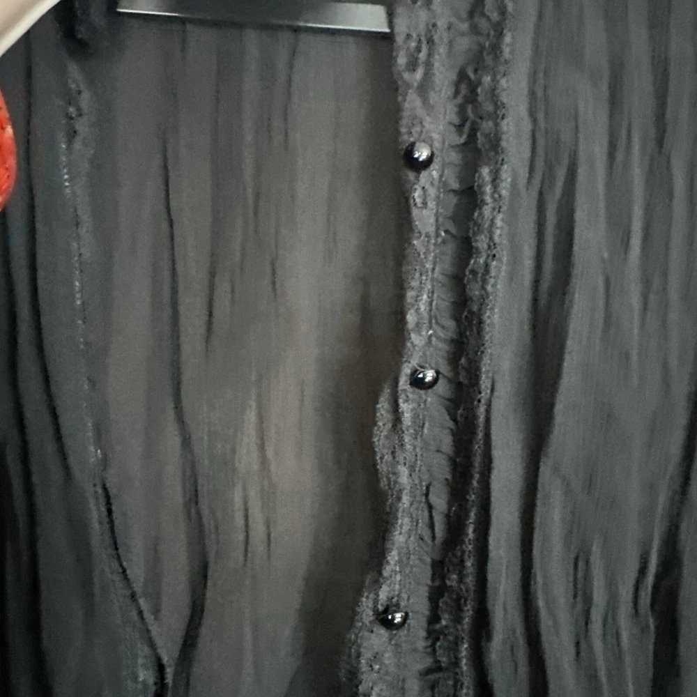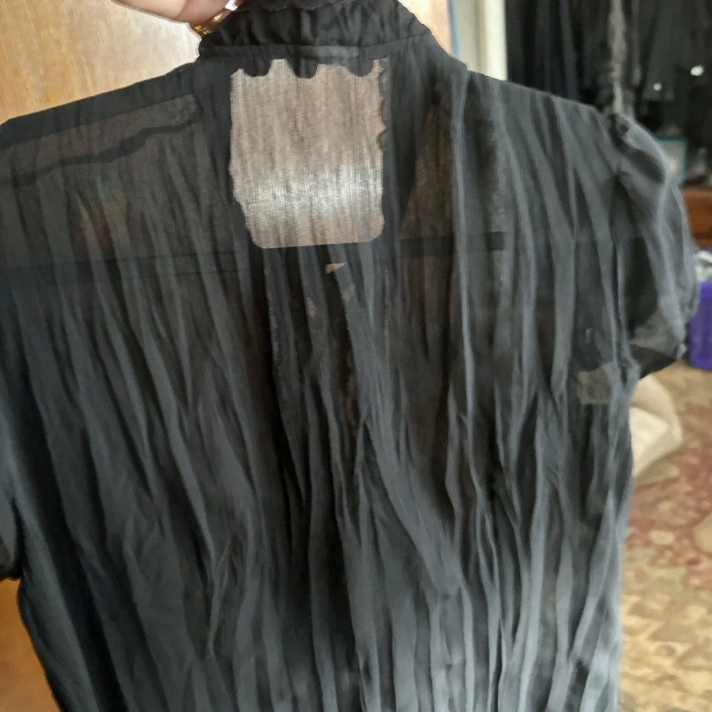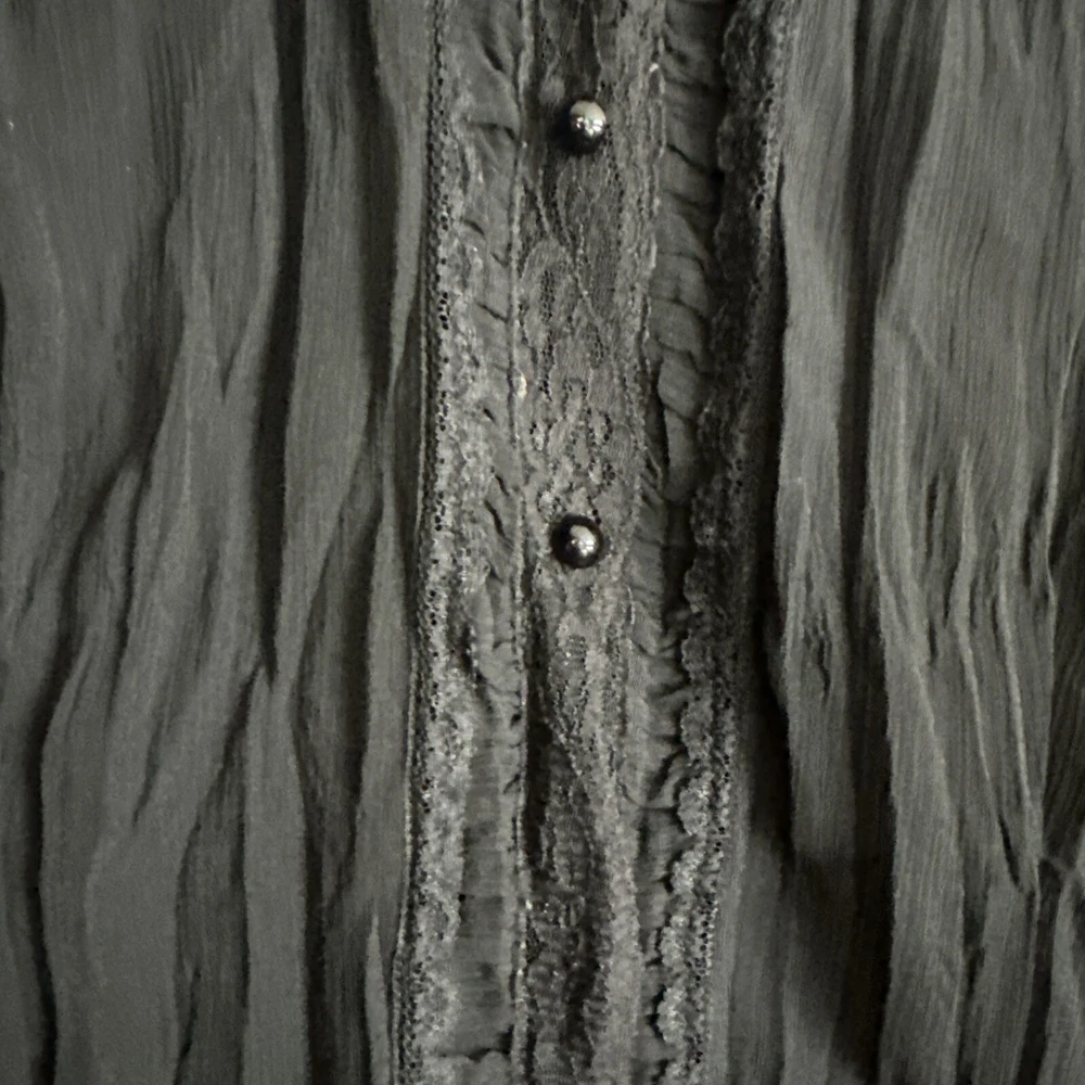 Missing third button from bottom, this has no tags they have been cut out. It is sheer and has a cap sleeve this is as is, no returns. Please see pictures and it reminds me of steampunk in a way. Elevate your wardrobe with this stunning Women's Black Polyester Casual Stretch Slim Sheer Lace Openwork Size M Blouse. The blouse boasts a collared neckline, cap sleeves, and a pullover closure, making it perfect for a variety of occasions including travel, casual wear, formal events, workwear, and business meetings. The blouse is made of lightweight and stretchy polyester material with a lace fabric type and features pleated, lace, openwork, and sheer accents, adding a touch of elegance and edge to your outfit. This blouse is a versatile addition to any wardrobe, with a classic and timeless style that can be dressed up or down. It is easy to care for, collarless, non-iron, tagless, unlined, and open. This blouse is perfect for the fall and spring seasons and is available in size M. Add this Women's Black Polyester Casual Stretch Slim Sheer Lace Openwork Size M Blouse to your collection today and step out in style!