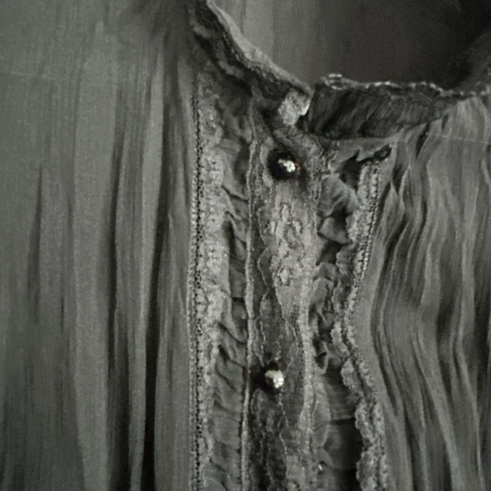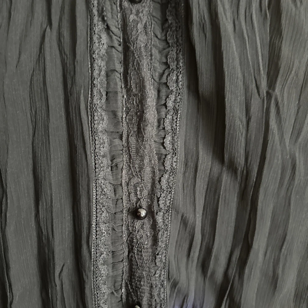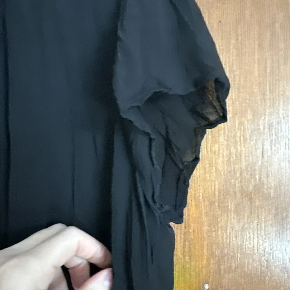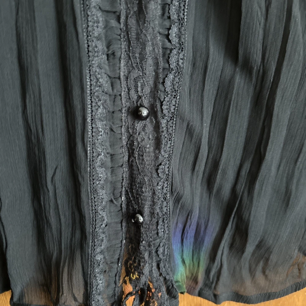 Missing third button from bottom, this has no tags they have been cut out. It is sheer and has a cap sleeve this is as is, no returns. Please see pictures and it reminds me of steampunk in a way. Elevate your wardrobe with this stunning Women's Black Polyester Casual Stretch Slim Sheer Lace Openwork Size M Blouse. The blouse boasts a collared neckline, cap sleeves, and a pullover closure, making it perfect for a variety of occasions including travel, casual wear, formal events, workwear, and business meetings. The blouse is made of lightweight and stretchy polyester material with a lace fabric type and features pleated, lace, openwork, and sheer accents, adding a touch of elegance and edge to your outfit. This blouse is a versatile addition to any wardrobe, with a classic and timeless style that can be dressed up or down. It is easy to care for, collarless, non-iron, tagless, unlined, and open. This blouse is perfect for the fall and spring seasons and is available in size M. Add this Women's Black Polyester Casual Stretch Slim Sheer Lace Openwork Size M Blouse to your collection today and step out in style!