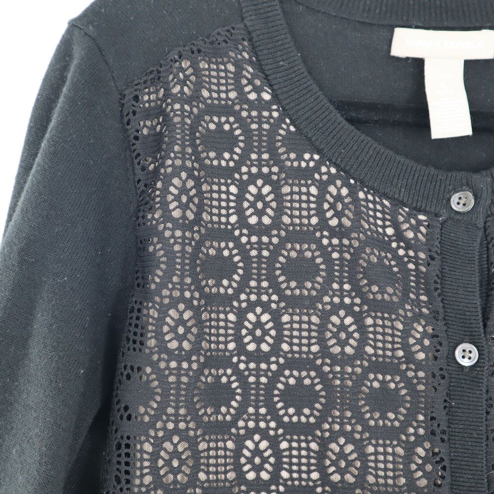 Banana Republic Wool Knit Cardigan Women's L Black Granny Boho Goth Dark Cottage This cardigan is so chic it could make a scarecrow look stylish! The lace detail says "granny," but in a "cool grandma who rides a Harley" way. • Button-Front Closure • Intricate Crochet Lace Detail • Long Sleeves • Ribbed Cuffs & Hem • Wool Blend Fabric Features: • granny, goth, bohemian, wool, dark cottage, crochet Size: Womens L Condition: Pre-Owned Good Shows light wash wear/pilling but no major flaws.