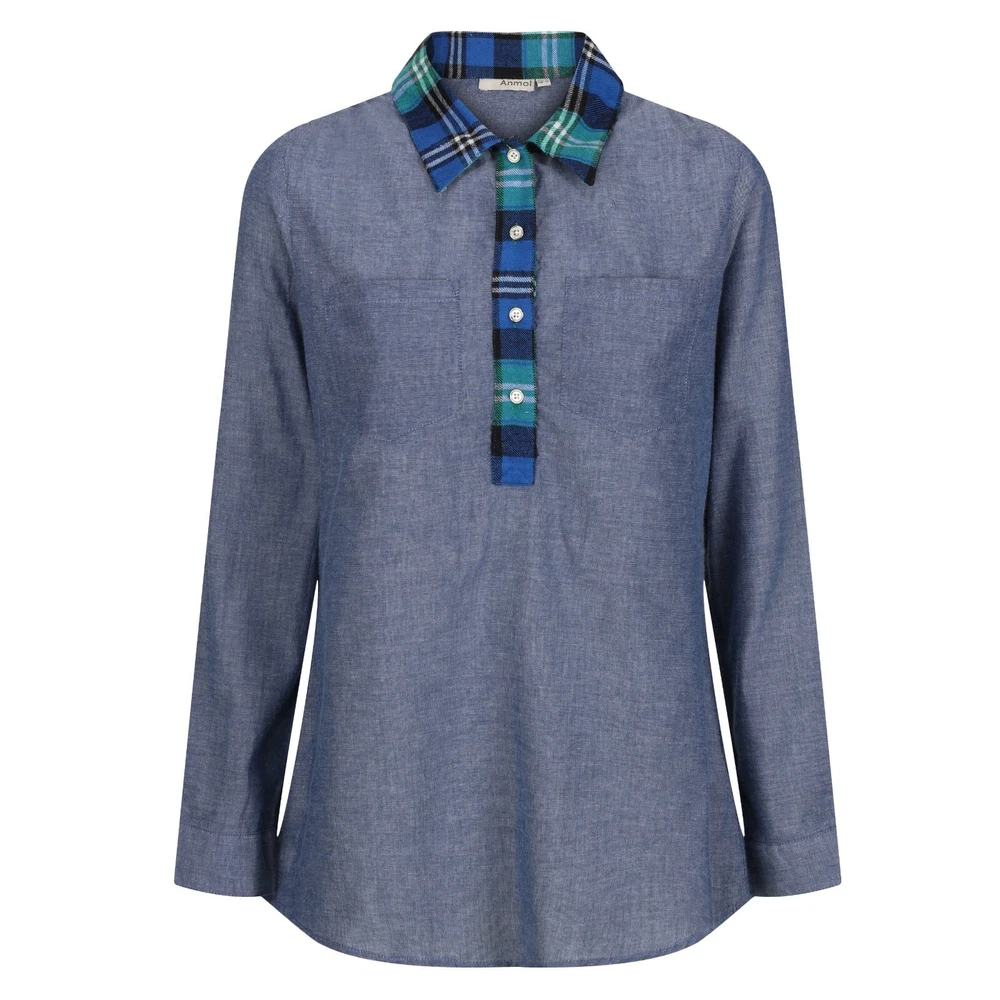 Blue chambray quarter button painter blouse from Anmol. This classic artist shirt style is a casualwear wardrobe staple. UK size 22. Brand new with tags. Features: Lightweight chambray fabric - 100% cotton. Contrasting plaid fabric to collar and placket. Two chest pockets. Back hem is longer than front. Moderately loose fitting. Machine washable. Approximate measurements: To fit bust - 46" Length from shoulder to hem - 32" Any questions, just ask. Click here to view my store.