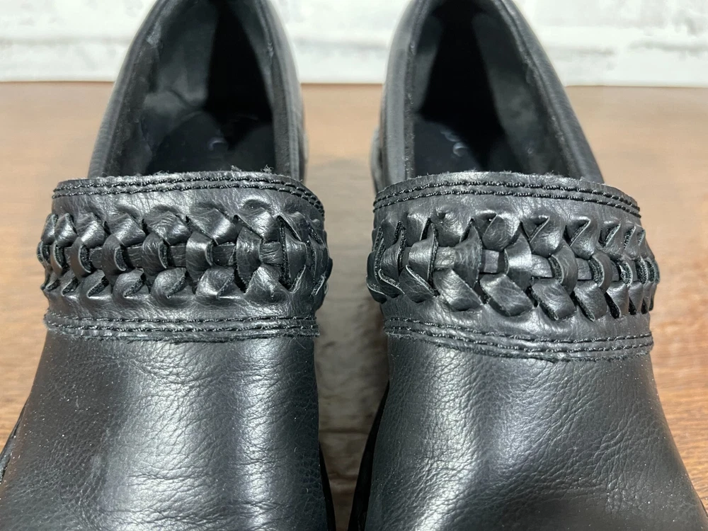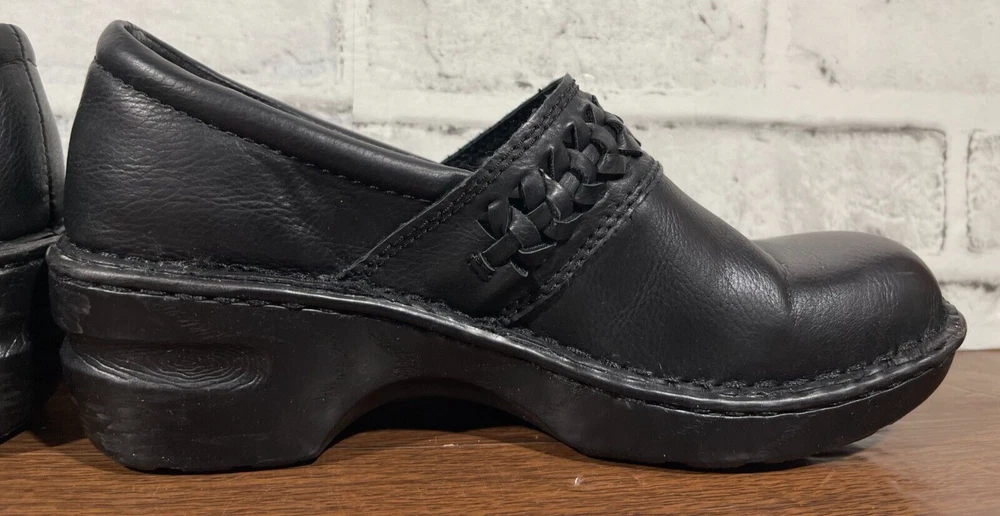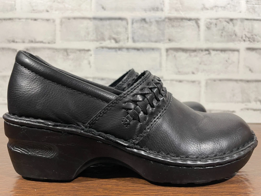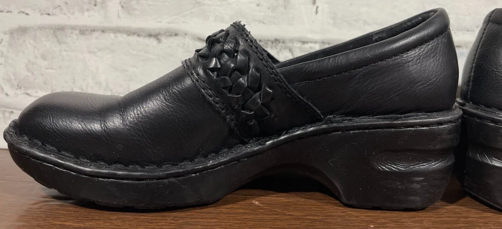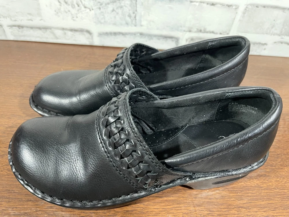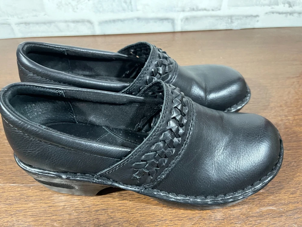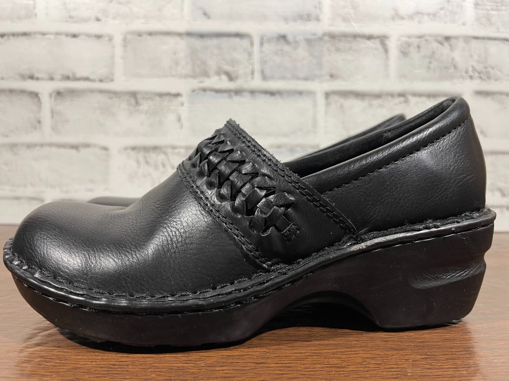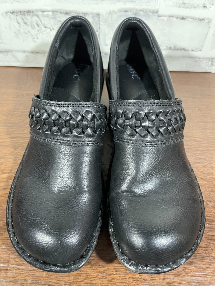 These are women's black clogs from Børn in size 7.5 featuring vegan leather construction with a braided detail. The slip-on style shoes have a round toe shape and a comfortable block heel. Ideal for travel, casual wear, or work, they have a strap accent and a rubber outsole for traction. The shoes are suitable for all seasons and activities like walking and driving. Very good preowned condition with normal preowned wear and no issues. Please see all photos. For clothing specifically, see photos for all measurements and/or any issues if applicable. Pay close attention to the measurements as the size of the garment may quite possibly be different than the actual measurement(s) due to washing, shrinkage, or stretching as these are used clothes. The size in the title is the size on the tag of the garment. See photos for measurements of actual measurements as they may differ. ALWAYS CHECK THE MEASUREMENTS IN THE PHOTOS. This will remove any questions on measurements as well as always cover the possibility of human error in the listing(s) in the case of a typo or oversight. All clothing and shoes have been washed/cleaned, and comes from a smoke free environment. If shoe trees appear in the photos, they are for photography purposes only to illustrate how the shoes look filled out, and are not included. I am available for questions. I accept or negotiate reasonable offers. Have an amazing day. Thank you.