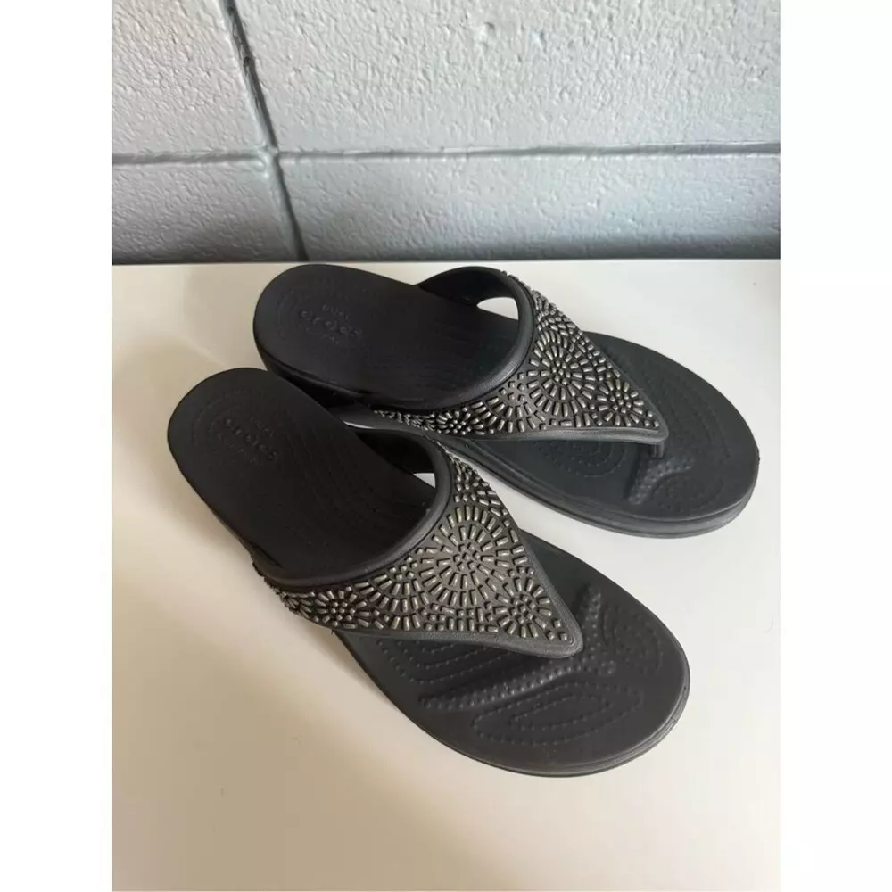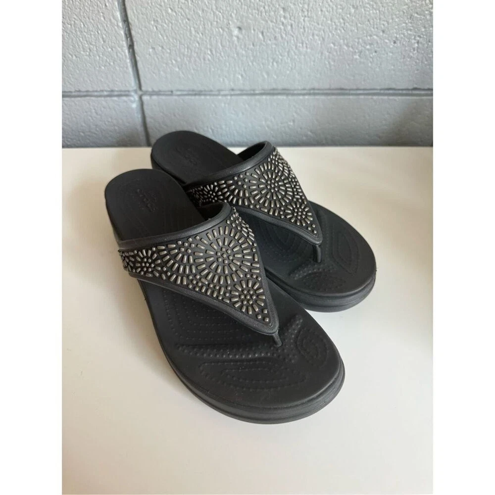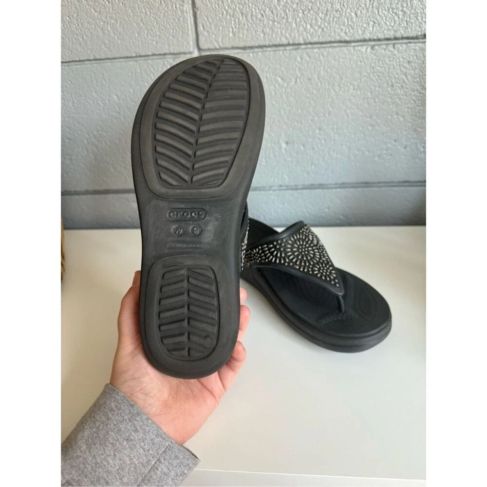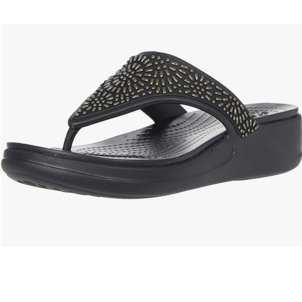 Women’s Crocs Monterey Diamanté Slip On Embellished Wedge Sandal in Black Size 9 Decorative studs and rhinestones accents. Open toe. Comfort, cushioned footbed. Lightweight. outer material: Rubber closure type: Slip-On material : Croslite Runs true to size