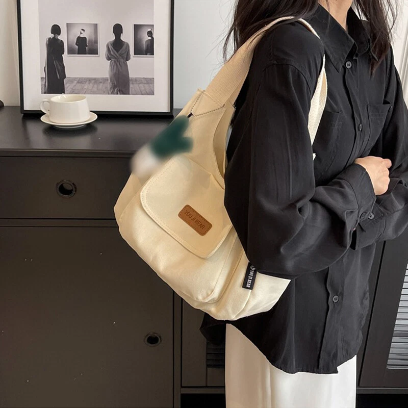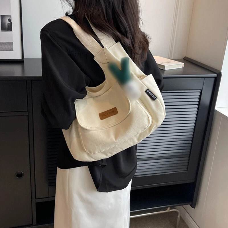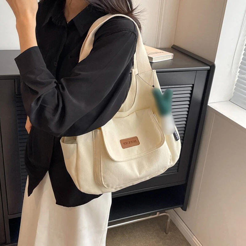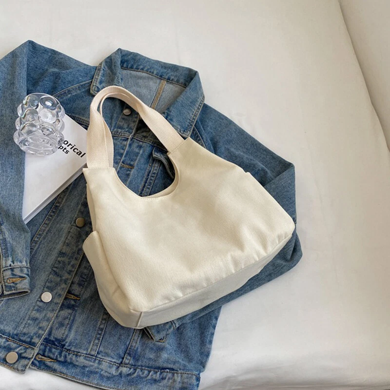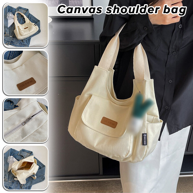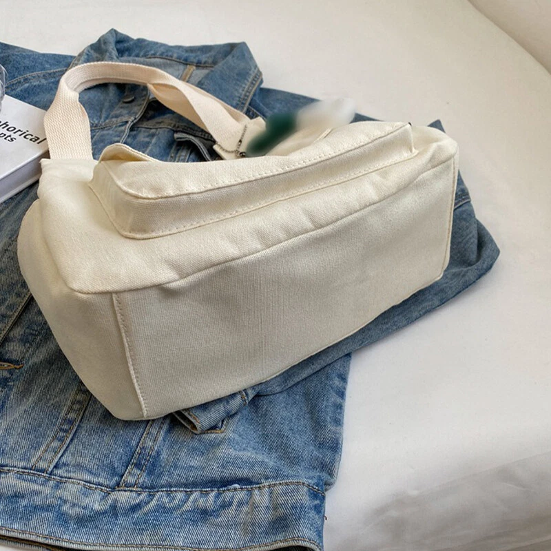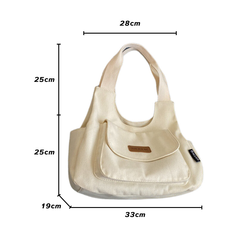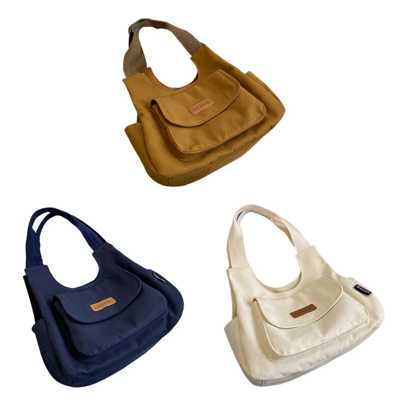 Color: Brown, Dark Blue, White Material: Canvas Bag style: Shoulder bag Lining: Polyester Opening method: Zipper Applicable scenarios: daily matching, commuting to work, students attending classes Package included:1 x Canvas Bag