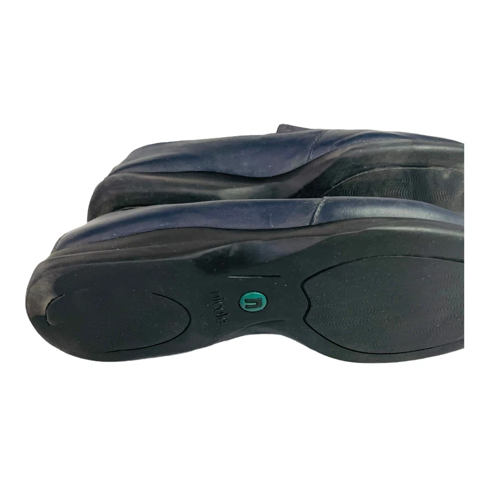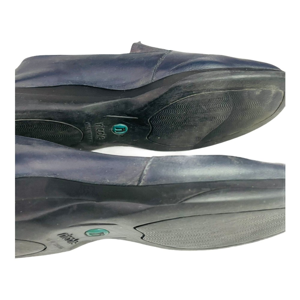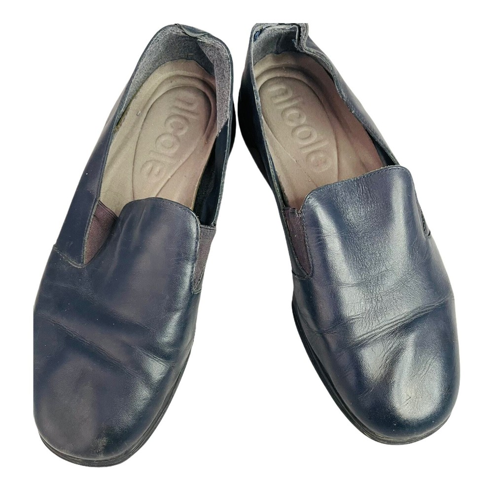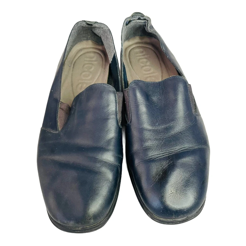 Nicole Slip-on shoes, Navy color, size 6M, Made in Brazil, cushion insole. Flaws: the back of heel has some wear see pictures. The sole of heel has some wear see pictures. Either leather or flax leather. The tops are in very good condition other than flaws described. you are enough 192 2 lbs $20