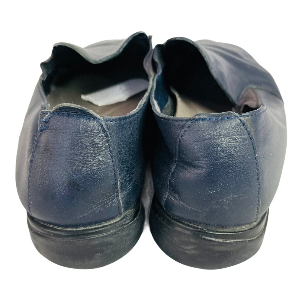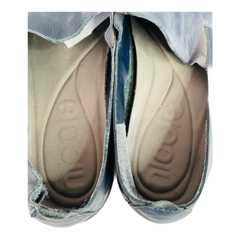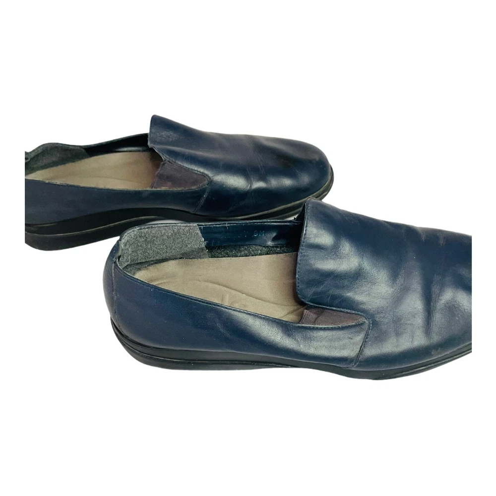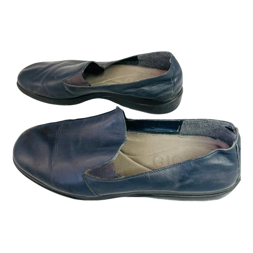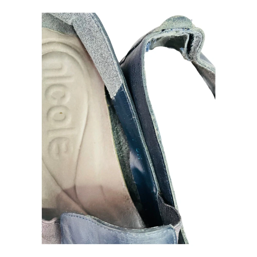Nicole Slip-on shoes, Navy color, size 6M, Made in Brazil, cushion insole. Flaws: the back of heel has some wear see pictures. The sole of heel has some wear see pictures. Either leather or flax leather. The tops are in very good condition other than flaws described. you are enough 192 2 lbs $20