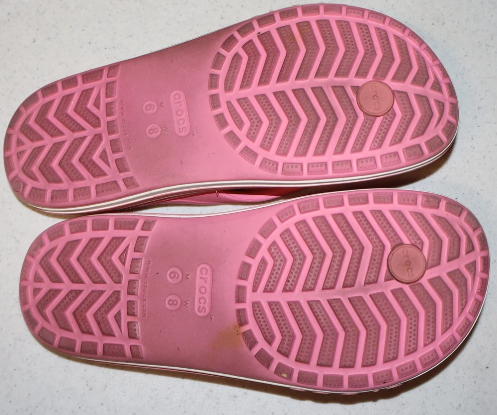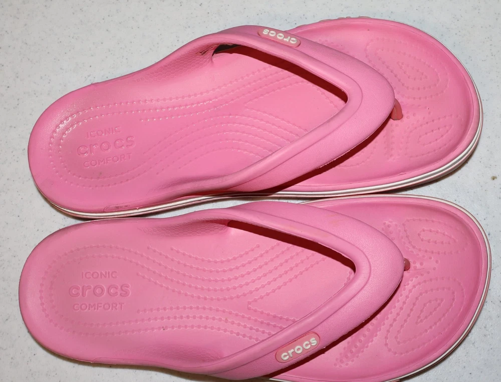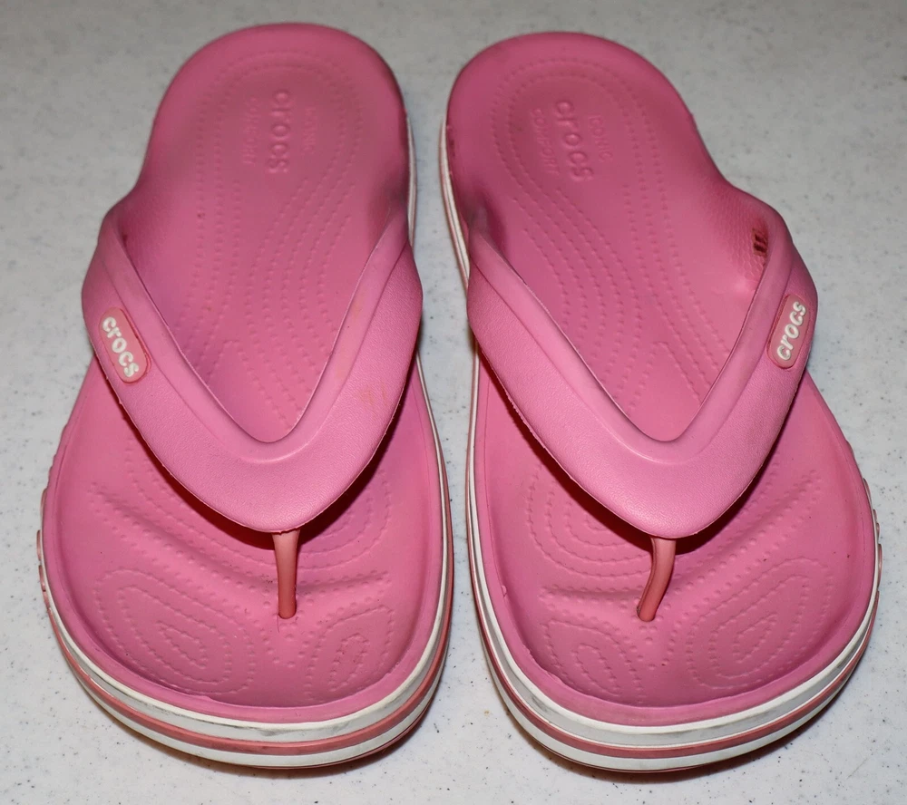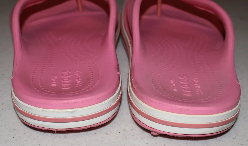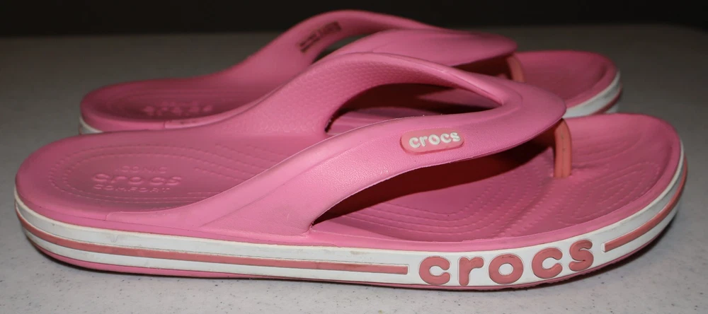 The product is a pair of Women's Pink Crocs Classic Flip Flops in size 8. These sandals feature a synthetic upper material and are designed by the brand Crocs. With a comfortable and iconic flip flop style, these sandals are perfect for casual wear during warm weather. The vibrant pink color adds a fun and stylish touch to any outfit.