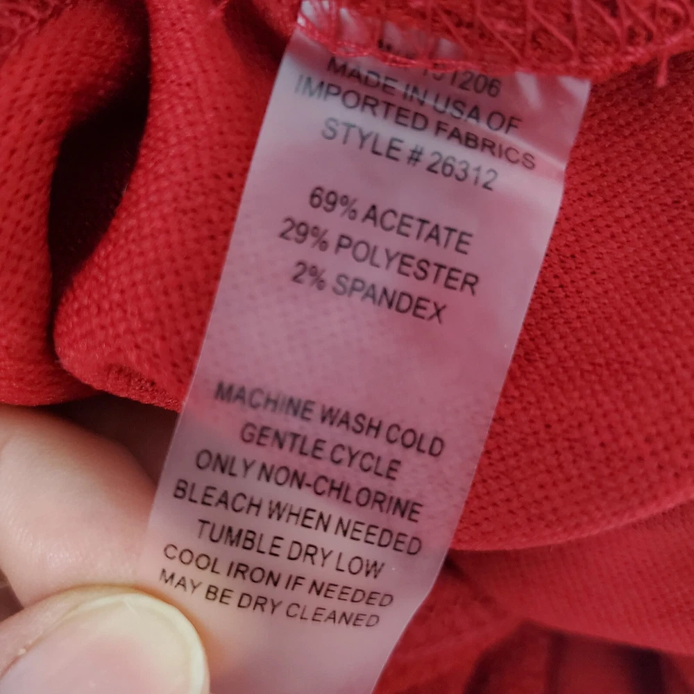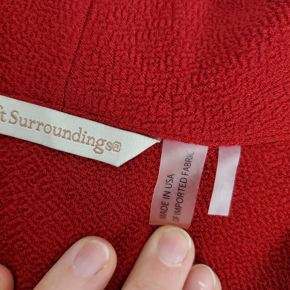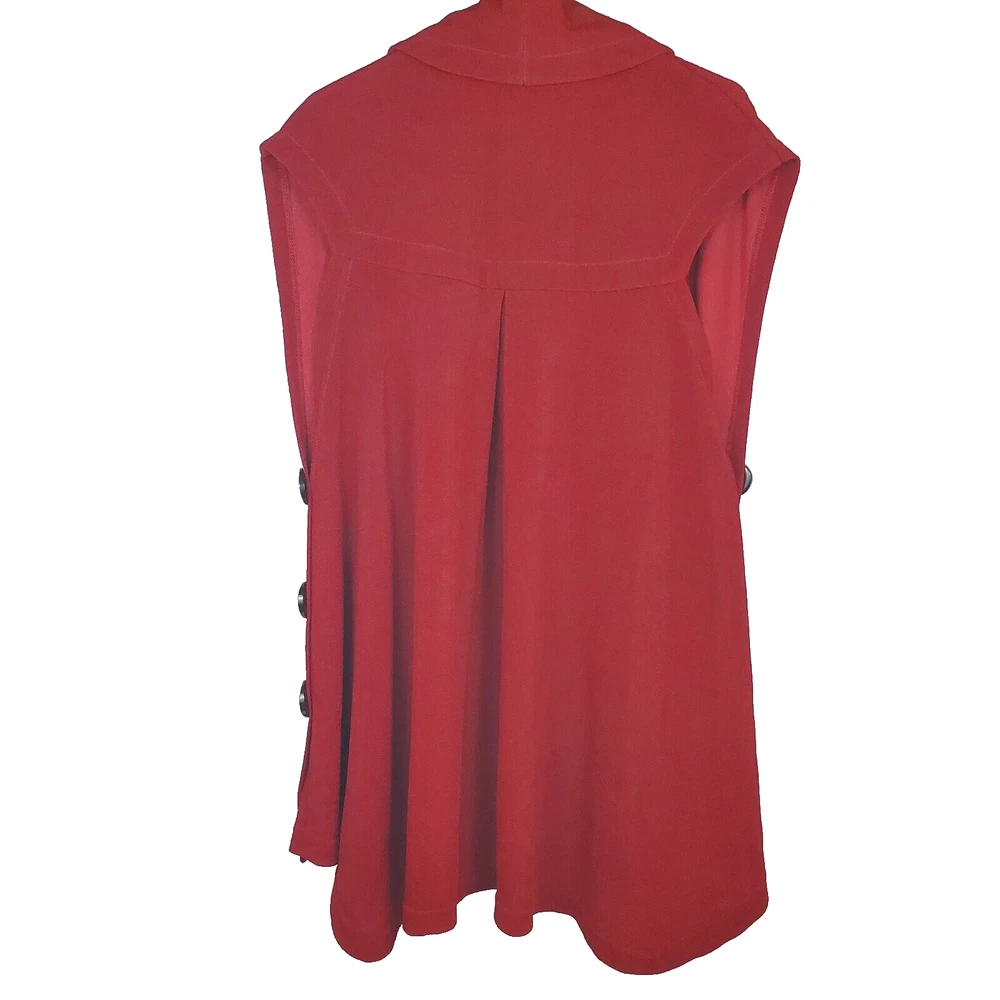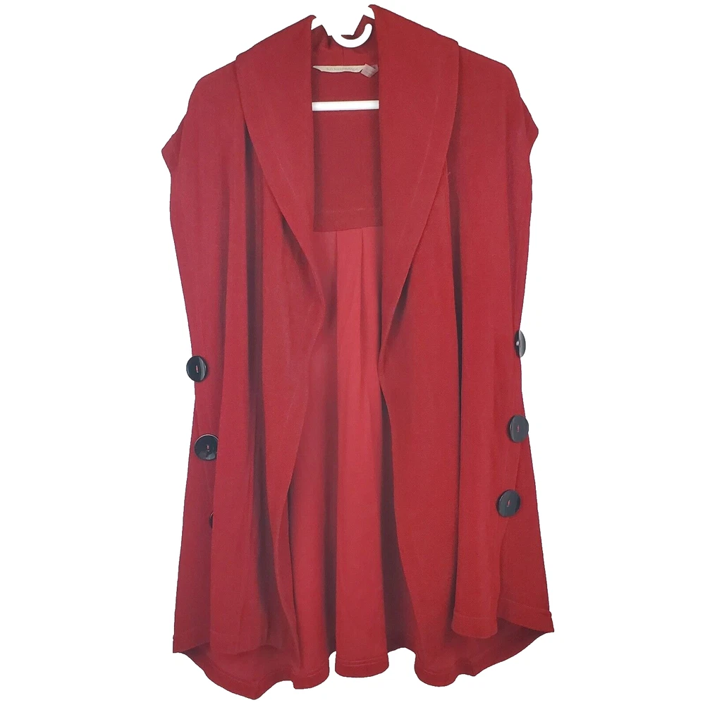 Women's Soft Surroundings Mesa Button Vest, long red draped open front vest, size L large. Vest features relaxed lapels, textured material, and 3 large chunky buttons on each side. Very boho lagenlook and a great color for the holidays or any bold feature. Measurements are approximately 32.5" in length and 23" from pit to pit. Material content is 69% acetate/29% polyester/2% spandex.