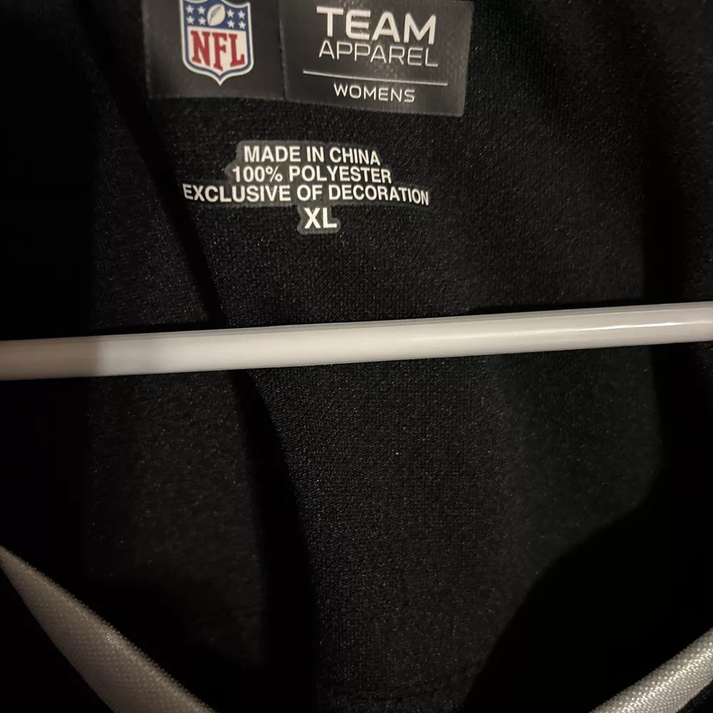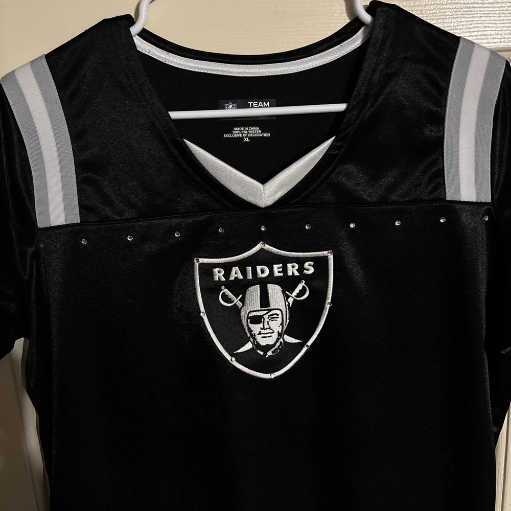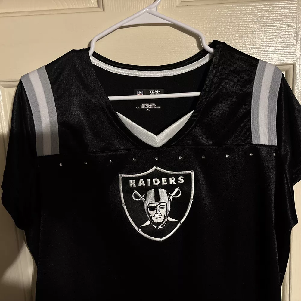 Show off your team spirit with this black, silver, and white Raider blouse from Team Apparel. Perfect for game day or everyday wear, this blouse features a V-neckline, short sleeves, and a collarless design. The beaded accents add a touch of bling to this basic style. W23 Made from lightweight polyester, this blouse is easy to care for and tagless for ultimate comfort. It comes in size XL for regular size women. Whether you're cheering on your favorite team or just want to sport some stylish football gear, this blouse is a must-have addition to your wardrobe. International charges are the buyer’s responsibility. No international returns.